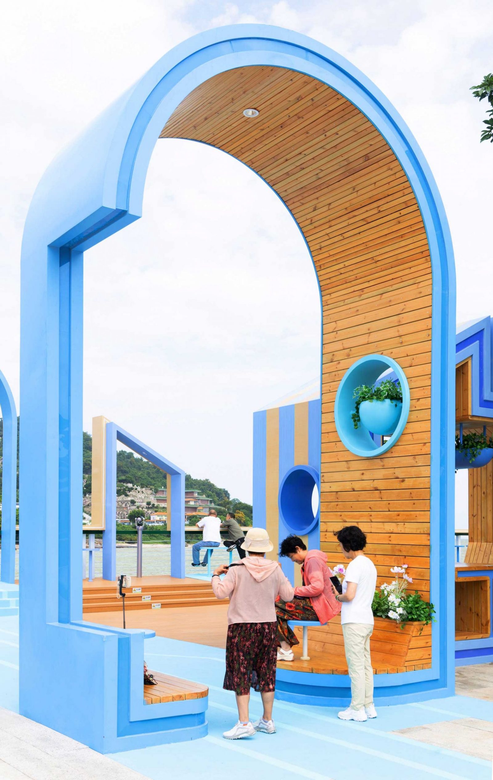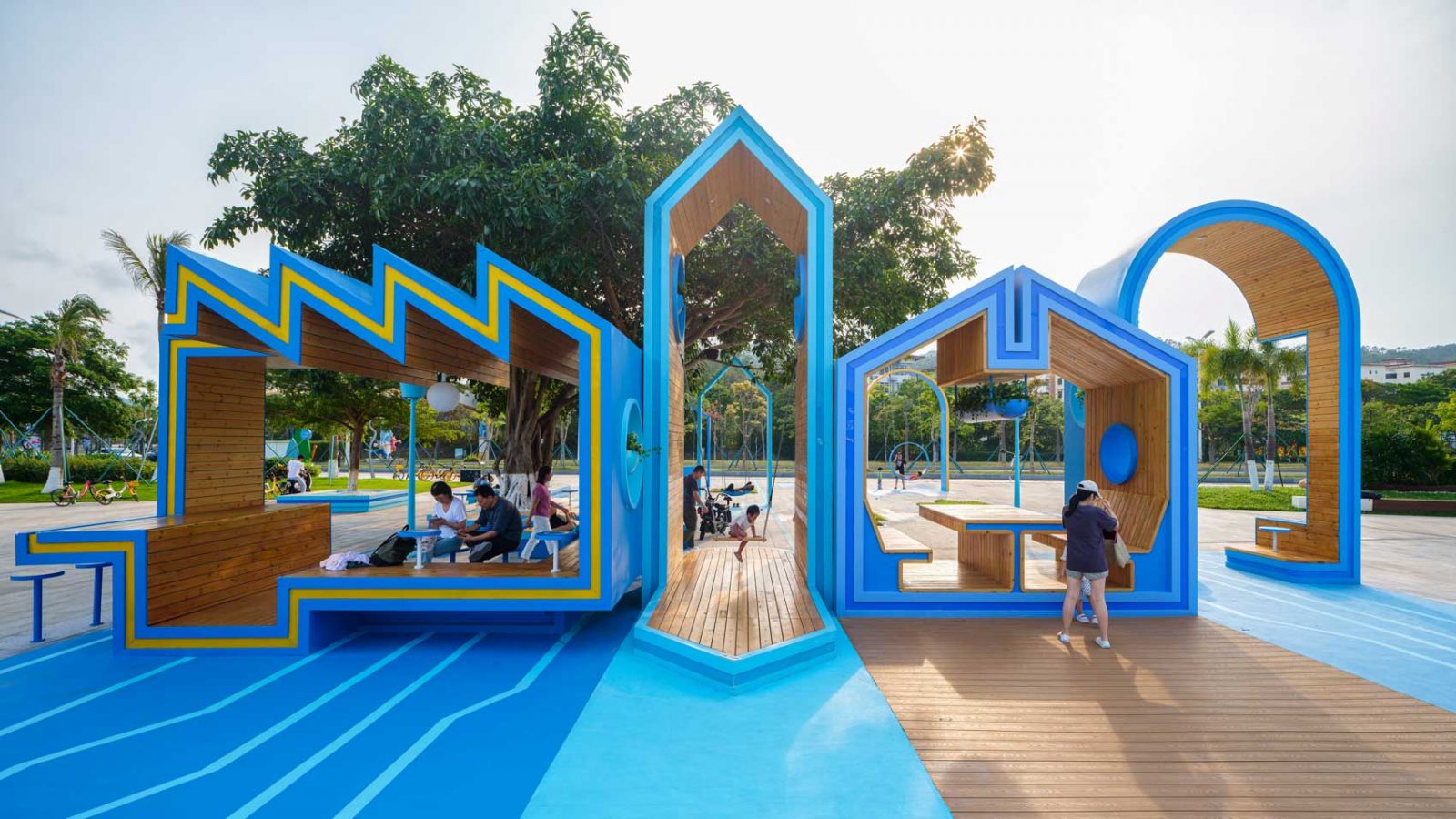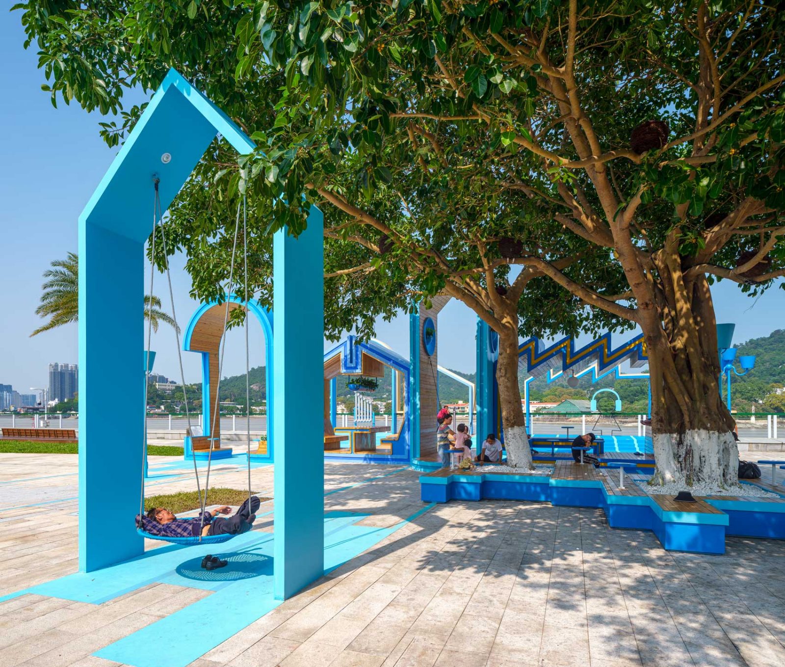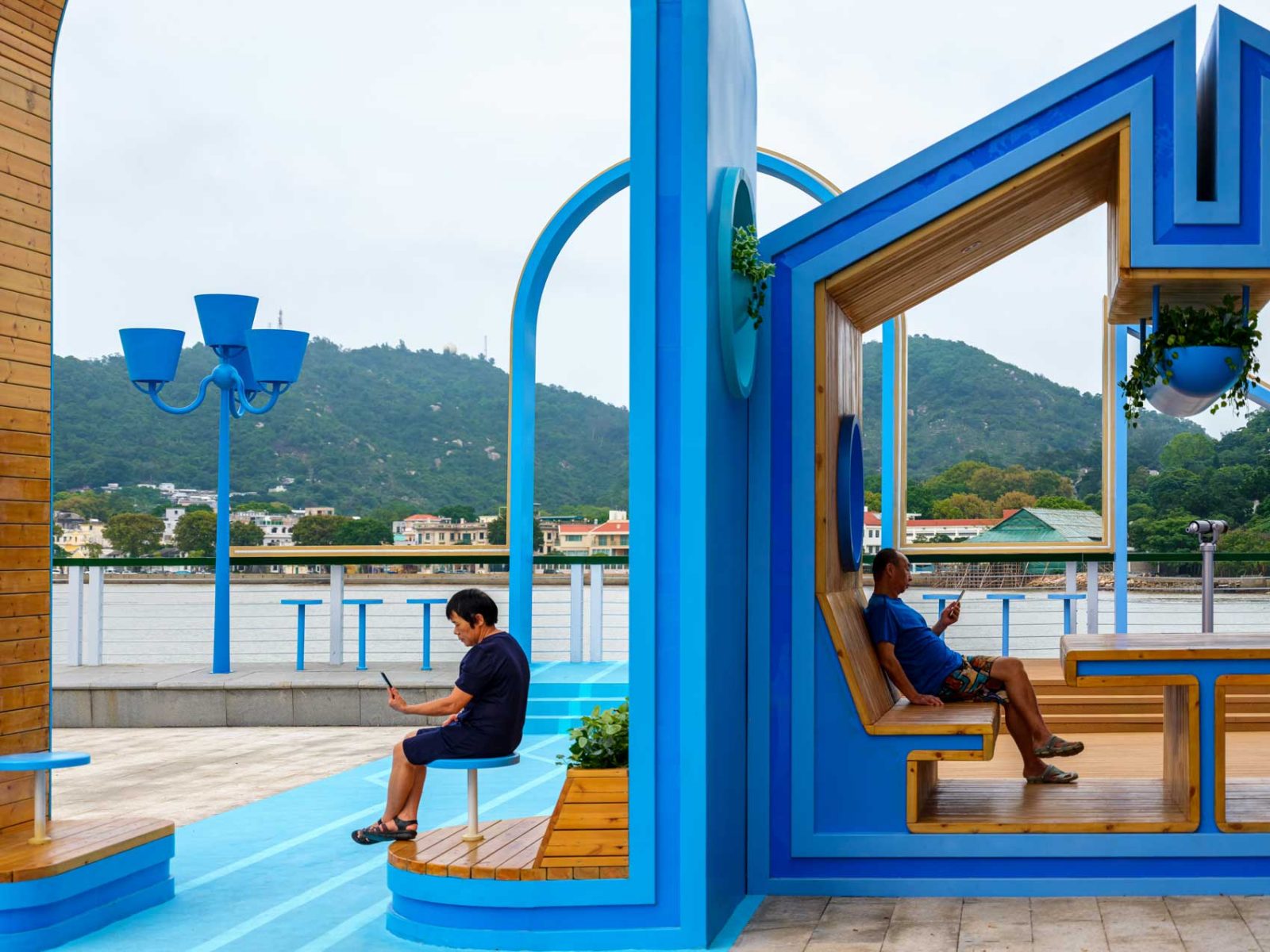La intervención presenta un grupo de cápsulas diseñadas con siluetas distintivas y atractivas, creando un horizonte colorido visible desde Macao.