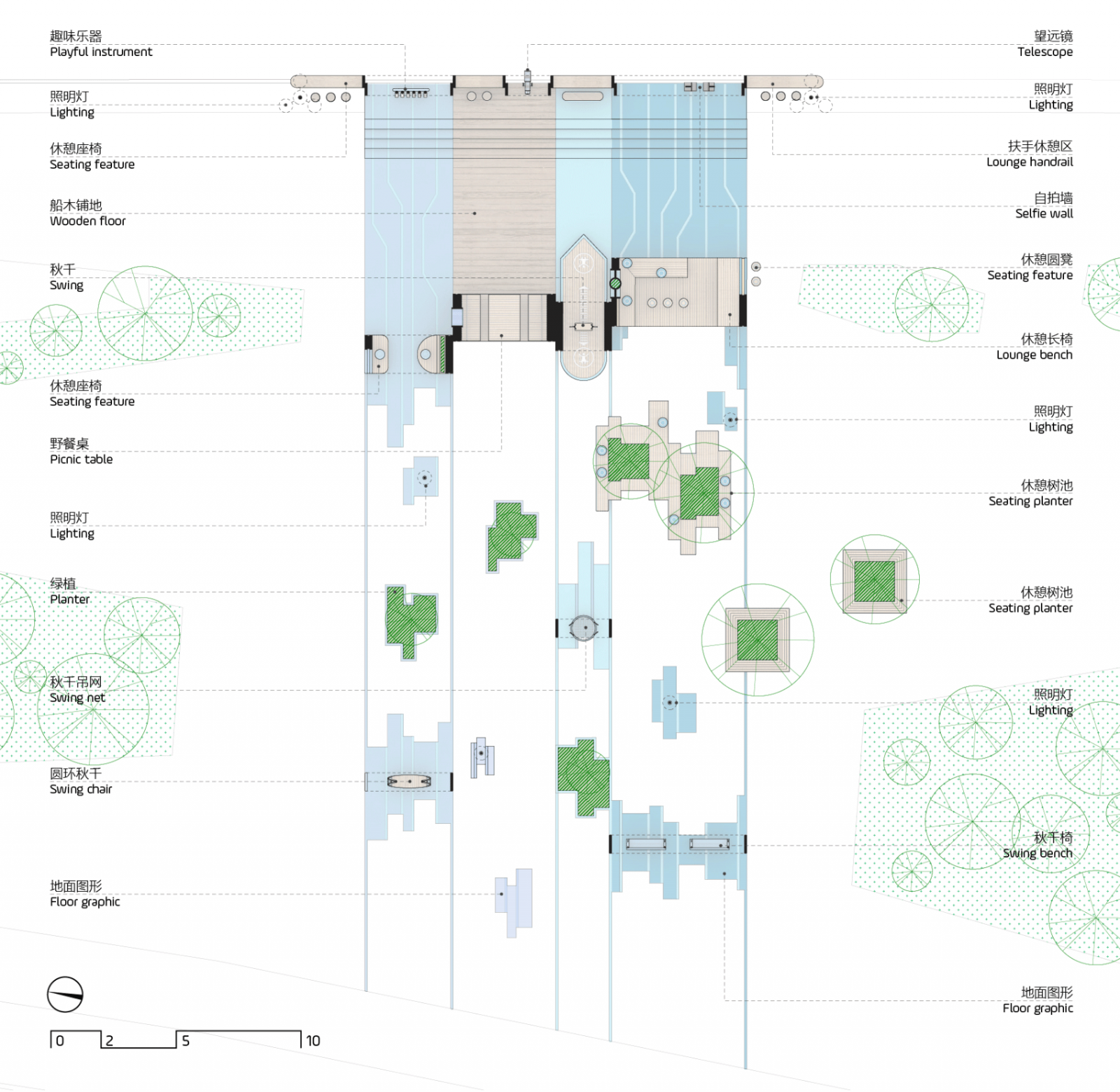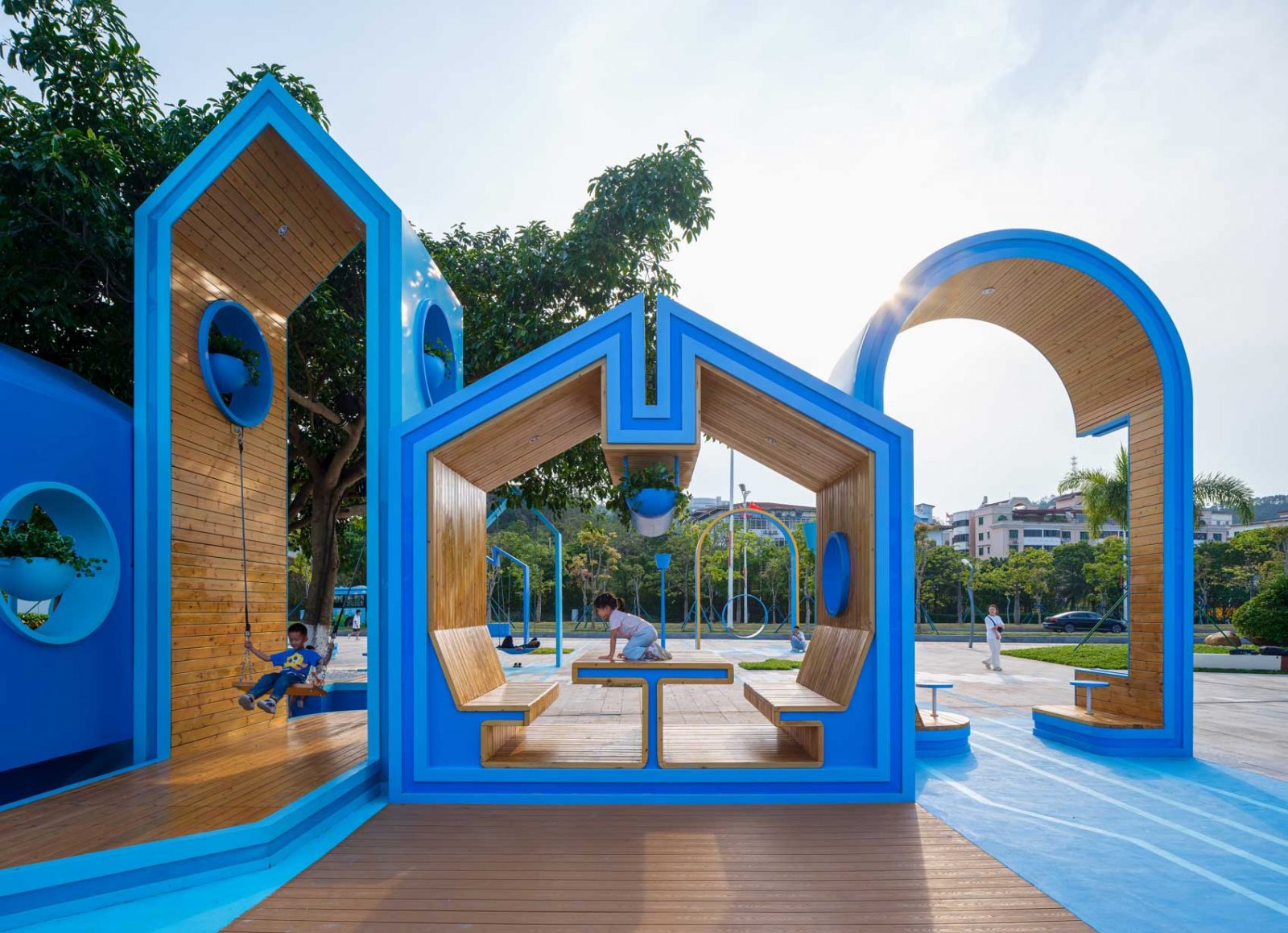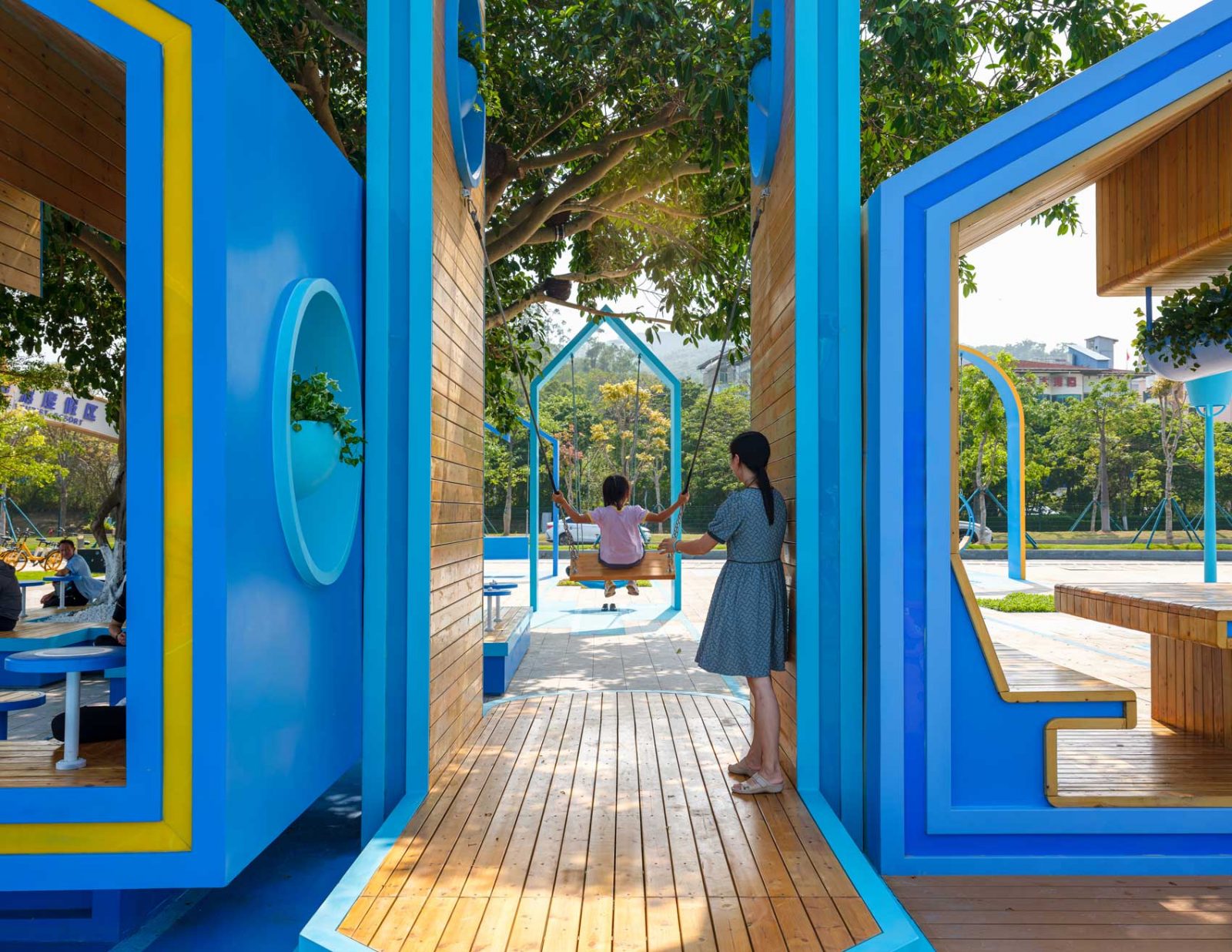 Las superficies exteriores están adornadas deliberadamente con tonos azules vibrantes, creando un impacto visual electrizante. En contraste, las superficies interiores de las cápsulas cuentan con acabados de madera cálidos, proporcionando un ambiente acogedor ideal para actividades relajadas. Estas cápsulas sirven para diversos propósitos; algunas están diseñadas para reuniones sociales y conversaciones informales, mientras que otras cuentan con instalaciones recreativas como columpios y toboganes, ofreciendo numerosas opciones de ocio y entretenimiento. La cálida invitación de los interiores de madera las convierte en espacios perfectos para actividades de ocio cómodas, descanso, socialización y relajación bajo su sombra reconfortante, encarnando la esencia del proyecto llamado HUT.