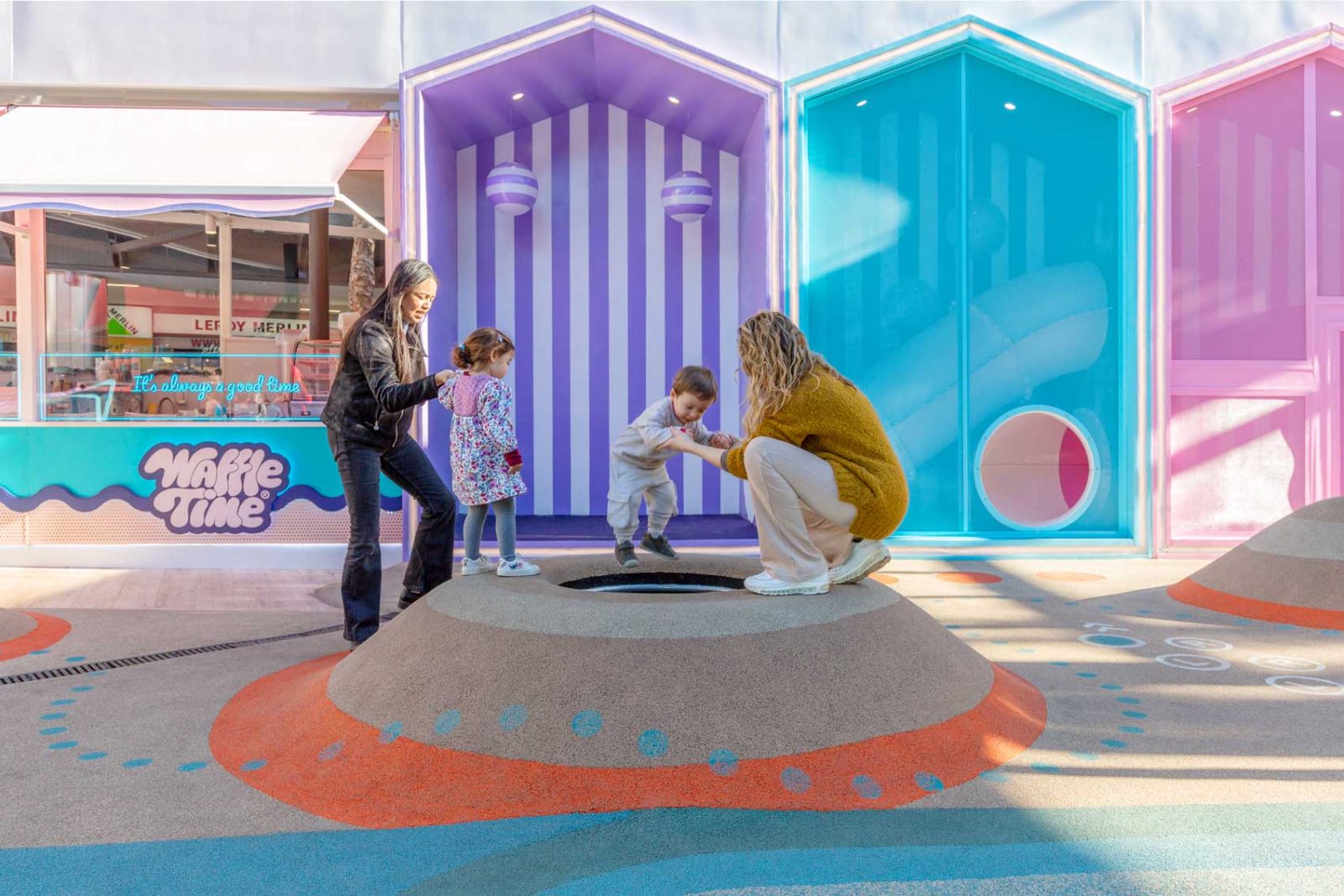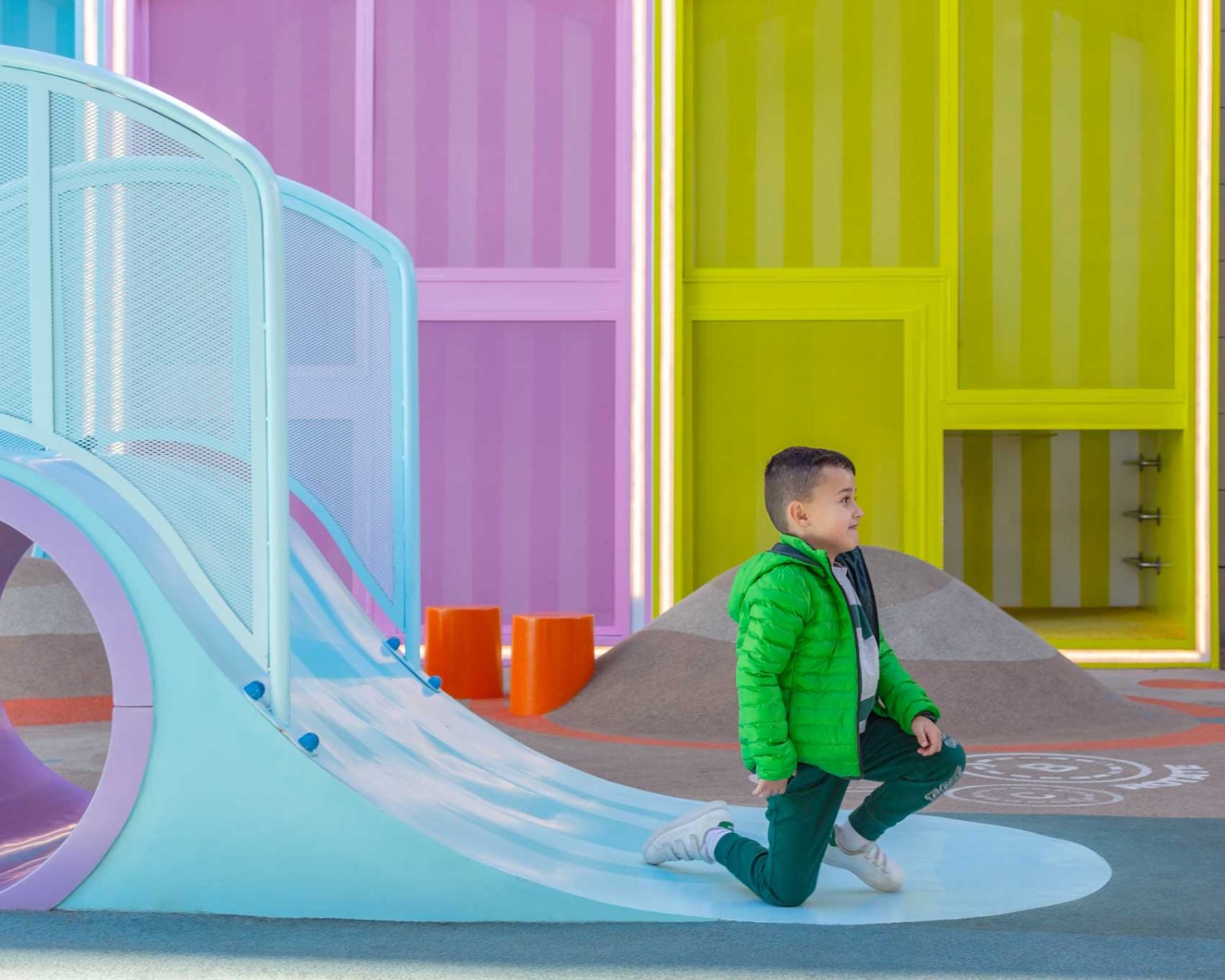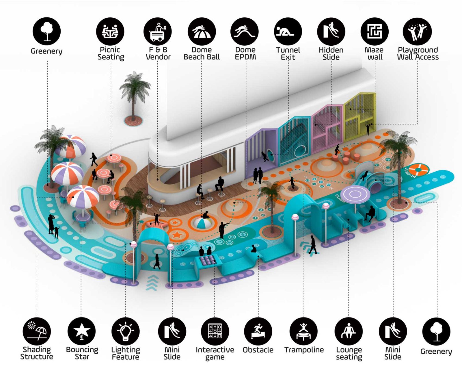 Los pavimentos y los objetos están dispuestos en diferentes franjas circulares que irradian desde el centro geométrico del círculo perfecto que inscriben, donde cada franja ofrece comodidades fáciles de usar, que incluyen trampolines ocultos y gráficos en el piso, así como elementos volumétricos como toboganes, cintas y asientos.