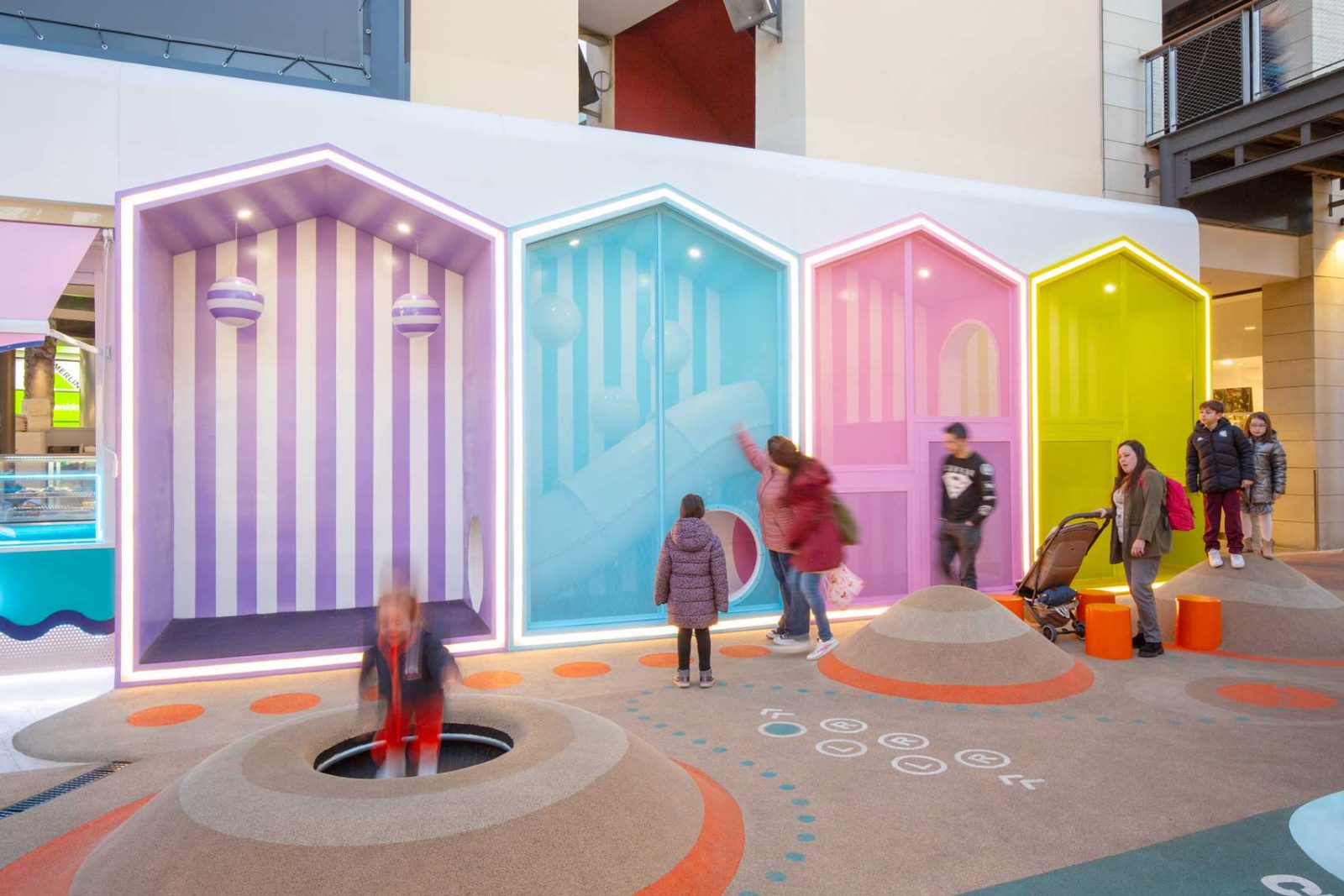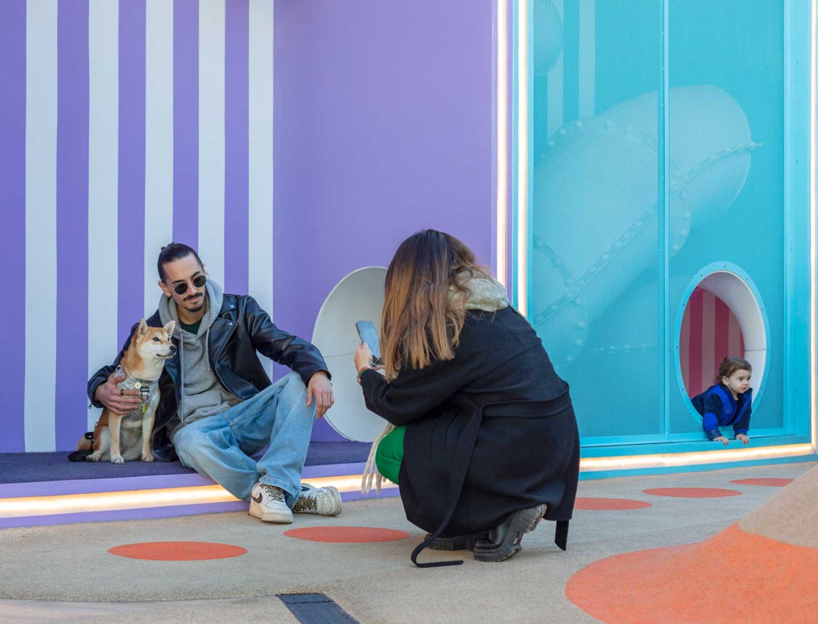 Aprovechando su ubicación y trazado geométrico, todo el proyecto gira en torno a este nodo peatonal, actuando como una rótula que articula una suave transición peatonal entre una calle y otra, al tiempo que cautiva a los transeúntes con sus formas y colores.