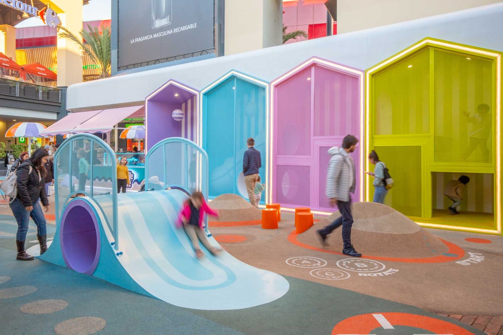 Apoyándose en la pared ciega, el proyecto presenta un laberinto vertical habitable con apariencia de cabañas de playa, atendiendo la curiosidad de los niños, invitándolos a explorarlo, escalarlo, circularlo y, en última instancia, llevarlos a un tobogán que los lleva de regreso al área central de juegos.
