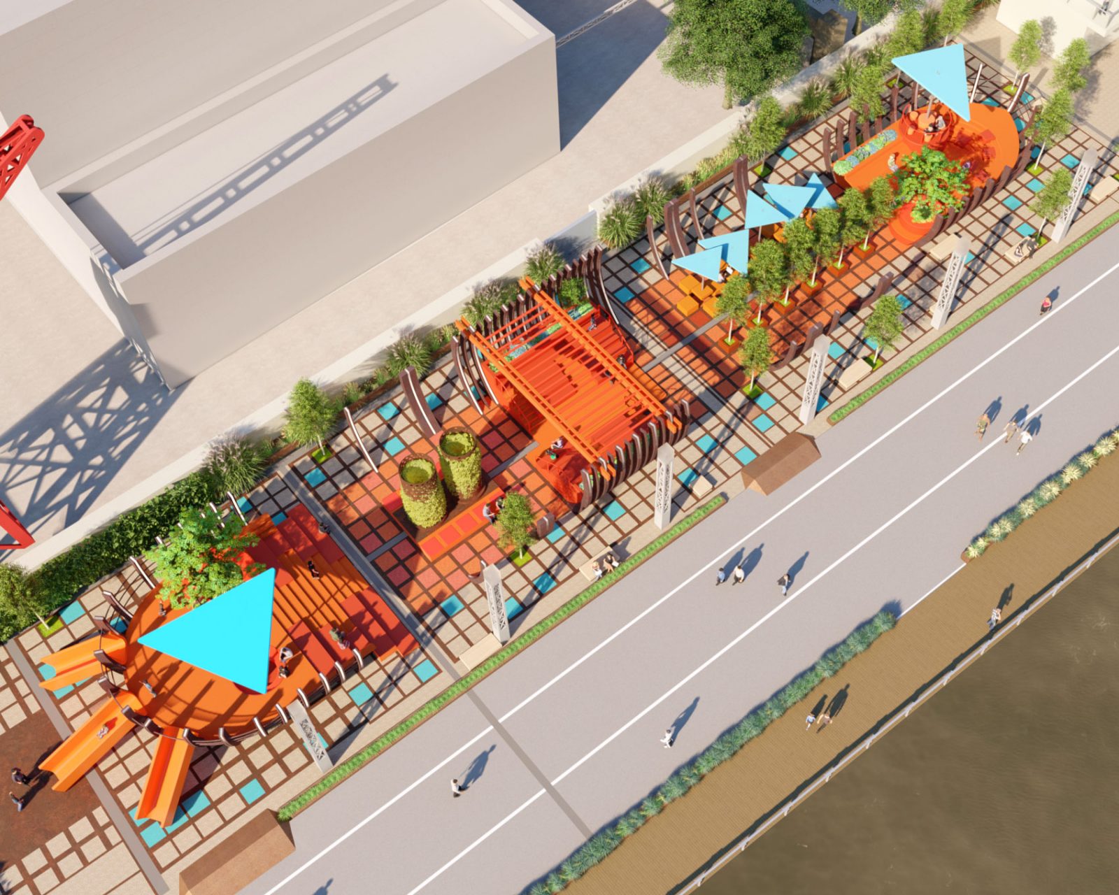 Jardineras cilíndricas verticales y verdes evocan la imagen de chimeneas de barco, mientras que las estructuras triangulares de sombra recuerdan velas abstractas, aportando tanto ritmo visual como confort ambiental al espacio. El diseño también integra jardineras frondosas y una variedad de tipologías de asiento para mejorar la comodidad y usabilidad del lugar para todas las edades.
