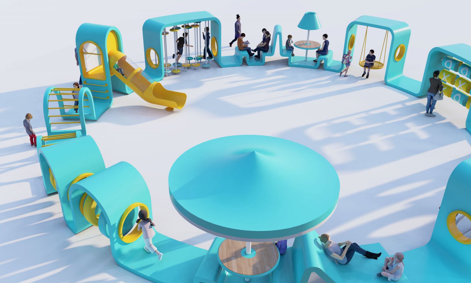 The Explorers’ Ring features a variety of games designed to challenge children to exercise and develop their physical skills while independently exploring the space. Among these features are slides of moderate height, tunnels to traverse, jumping and climbing areas, and safe swings. Additionally, the ring includes games to enhance cognitive thinking, such as a giant bead maze and giant tic-tac-toe, encouraging fine motor skills and cooperation.