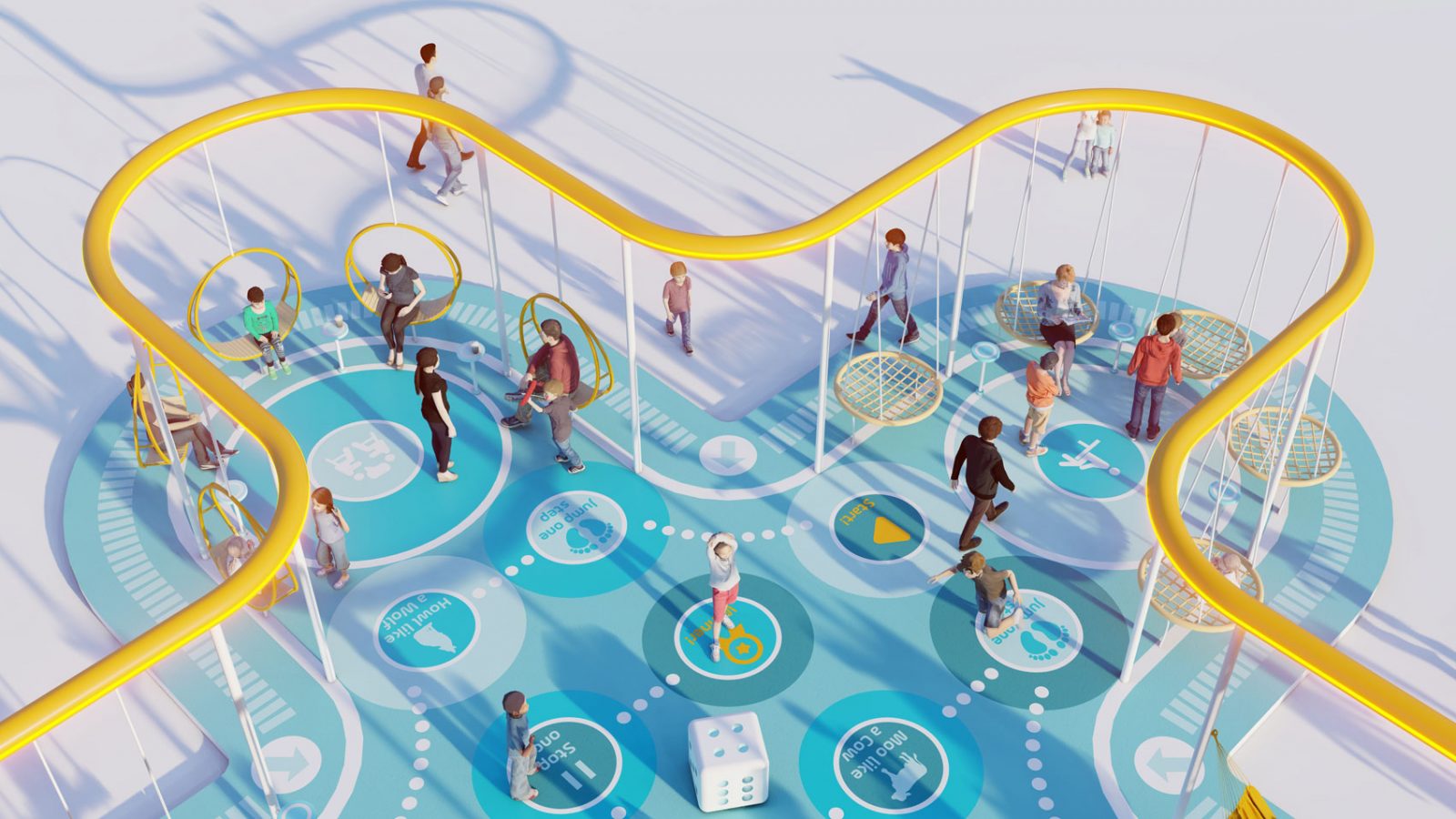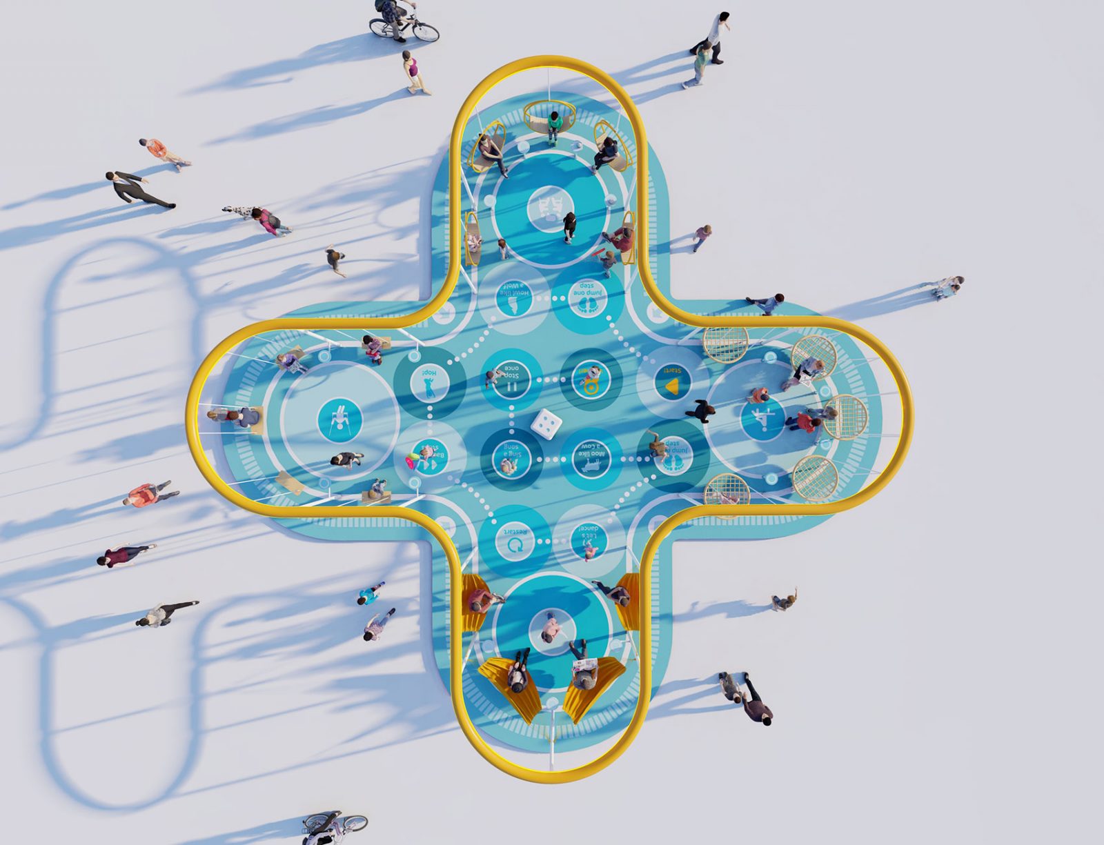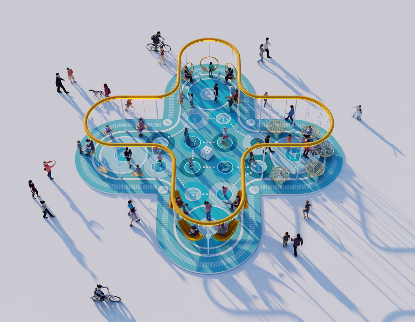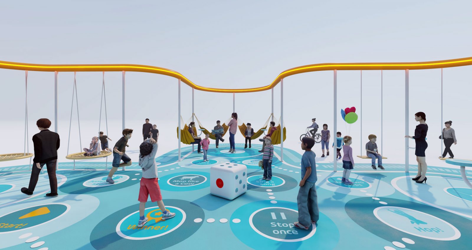 Welcoming users of all ages to relax in the lounging features catering to their interests and abilities, this product is not just for leisure but also encouraging creativity, since the seating features can be used in various ways. At the heart of the park lies a giant board game and dice, adding an element of playfulness to the environment.