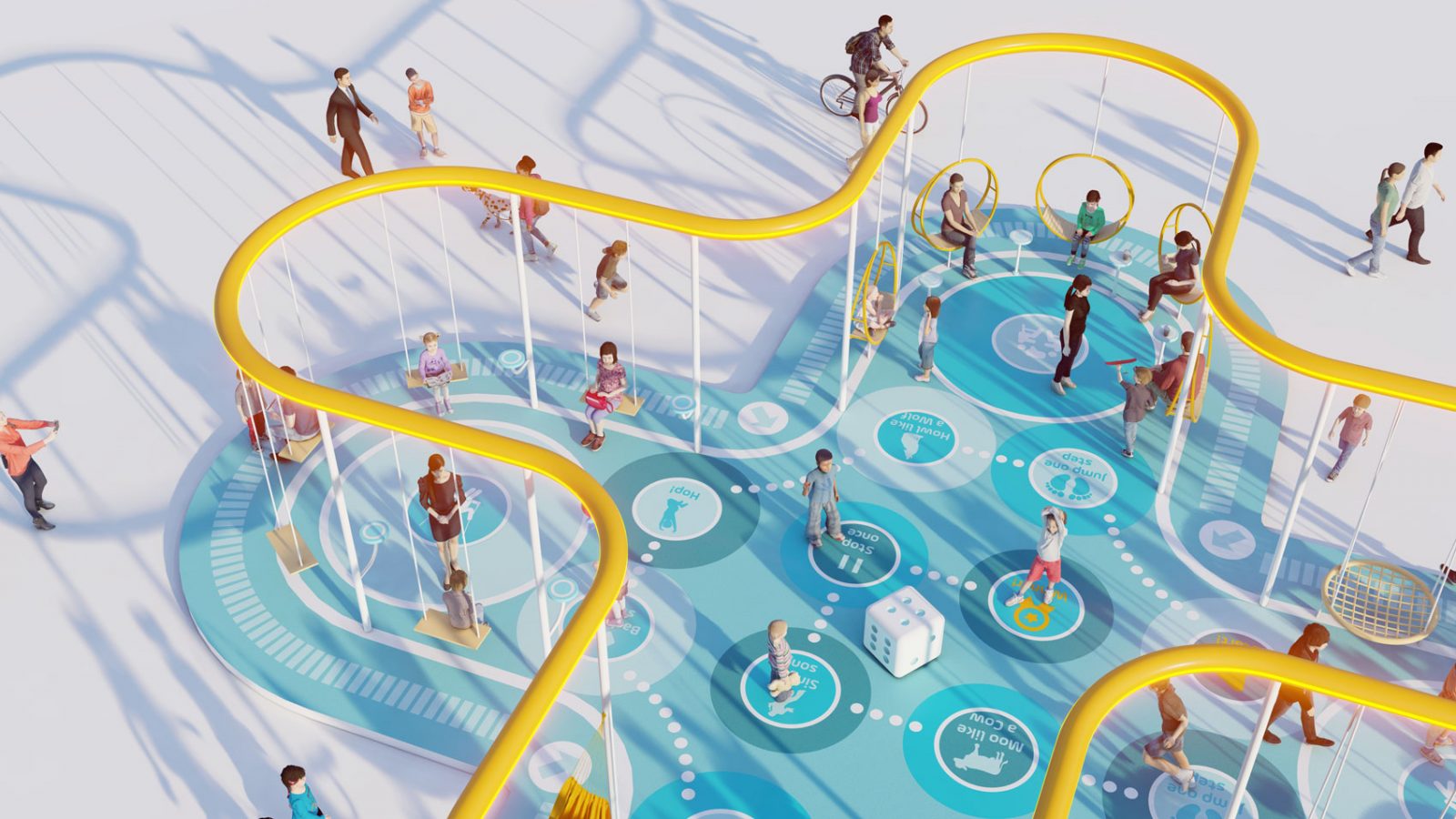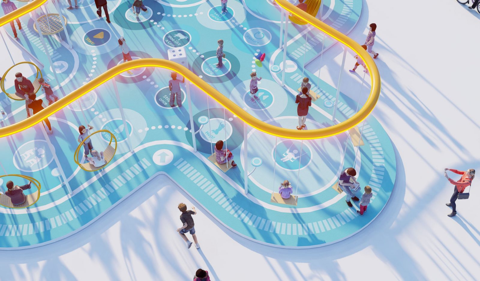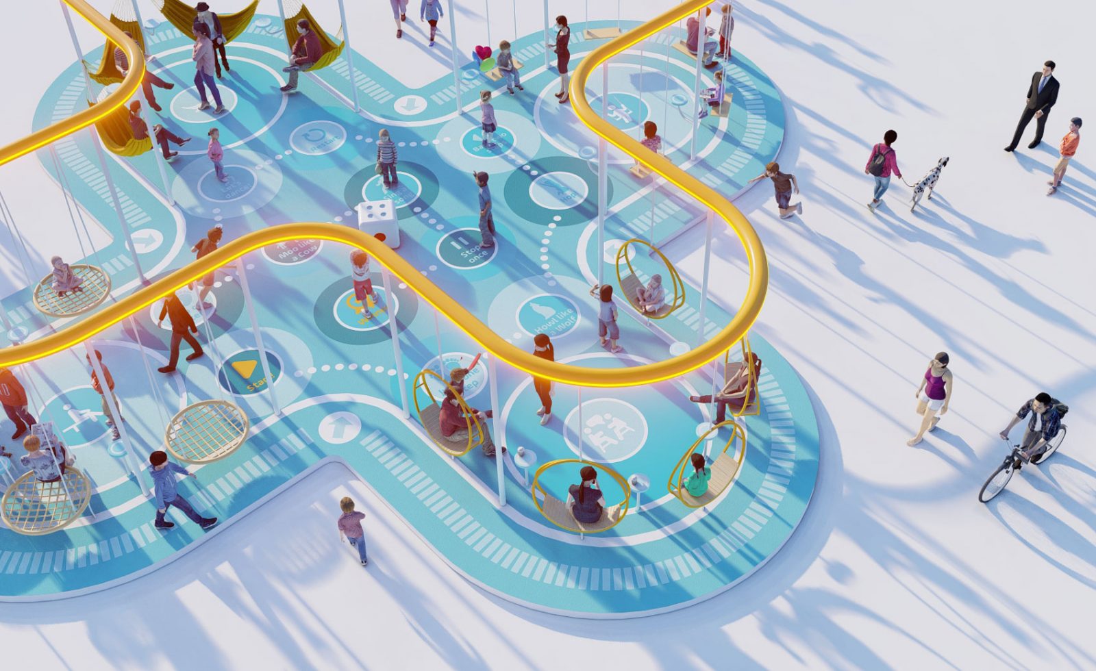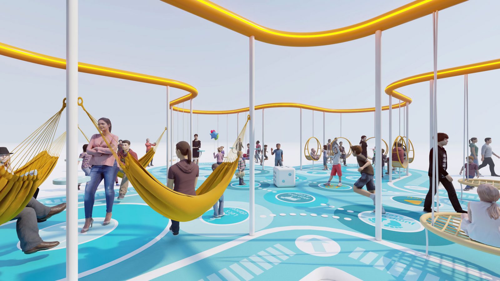 Welcoming users of all ages to relax in the lounging features catering to their interests and abilities, this product is not just for leisure but also encouraging creativity, since the seating features can be used in various ways. At the heart of the park lies a giant board game and dice, adding an element of playfulness to the environment.