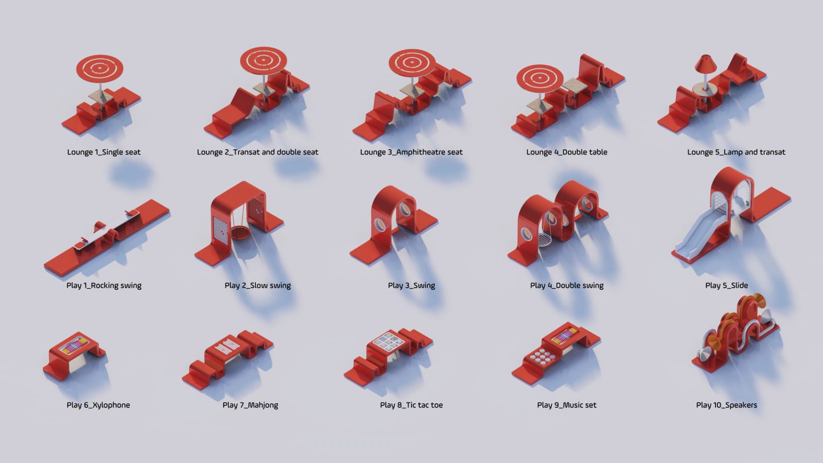 Among the 15 available components, 5 are dedicated to lounging, providing a variety of seating options including various-sized tables, seats of different heights, amphitheater seats, and evening lamps to enhance ambiance. The remaining 10 components focus on creativity and entertainment, offering swings for both children and adults, kids’ features such as slides, and different musical sets including xylophones, speakers, and drums. Additionally, there are games for all generations to enjoy, such as Mahjong and Tic Tac Toe.