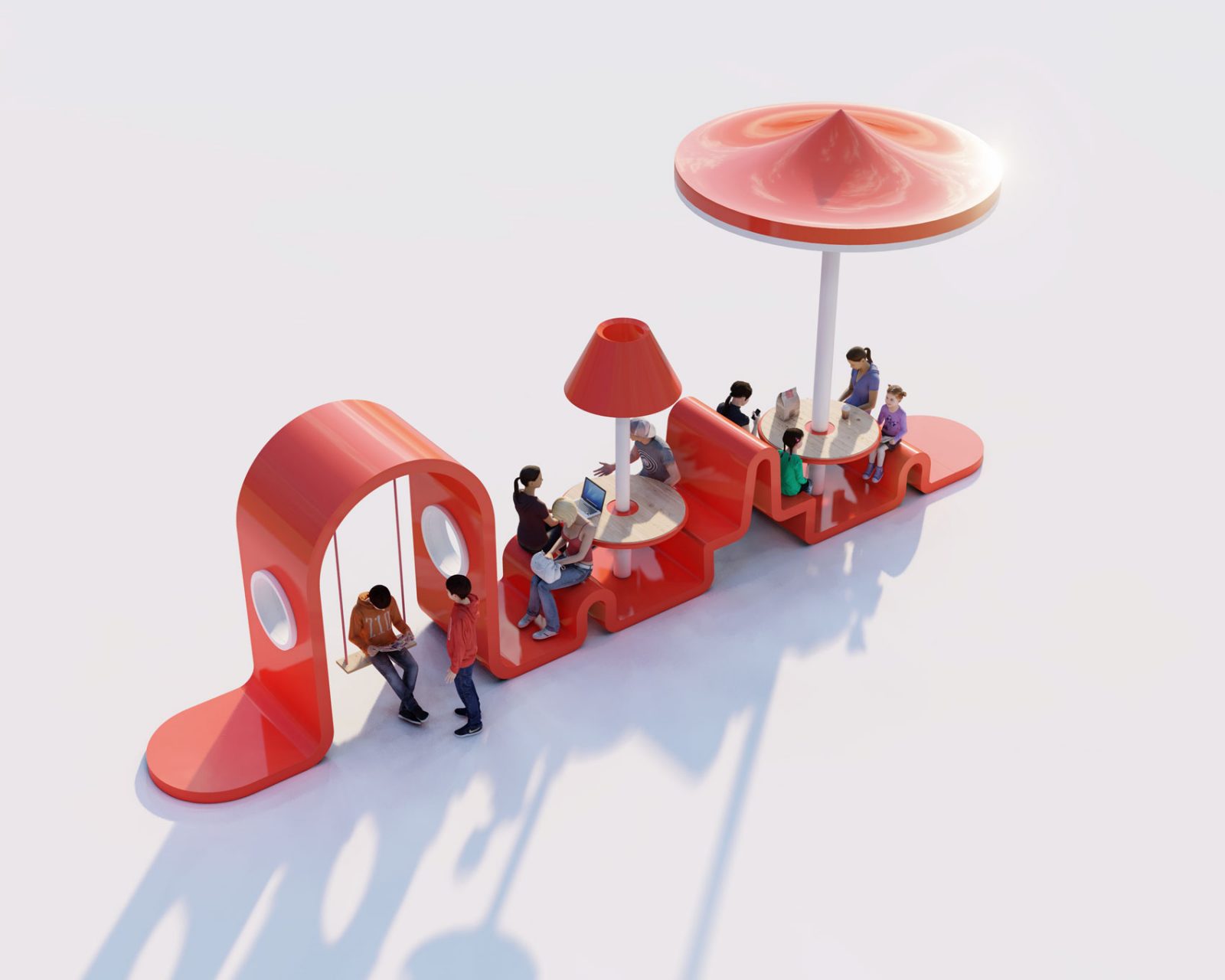 The following examples are composed of 80% lounge and 20% creativity equipment, providing a balanced mix of relaxation and playfulness. These ribbons can be used as standalone installations in small public spaces or combined to create larger resting areas in parks, universities, and other communal sites. Whether installed individually or integrated into a larger landscape, the Lounge Ribbon offers a versatile space for individuals to relax, socialize, and enjoy the public space.