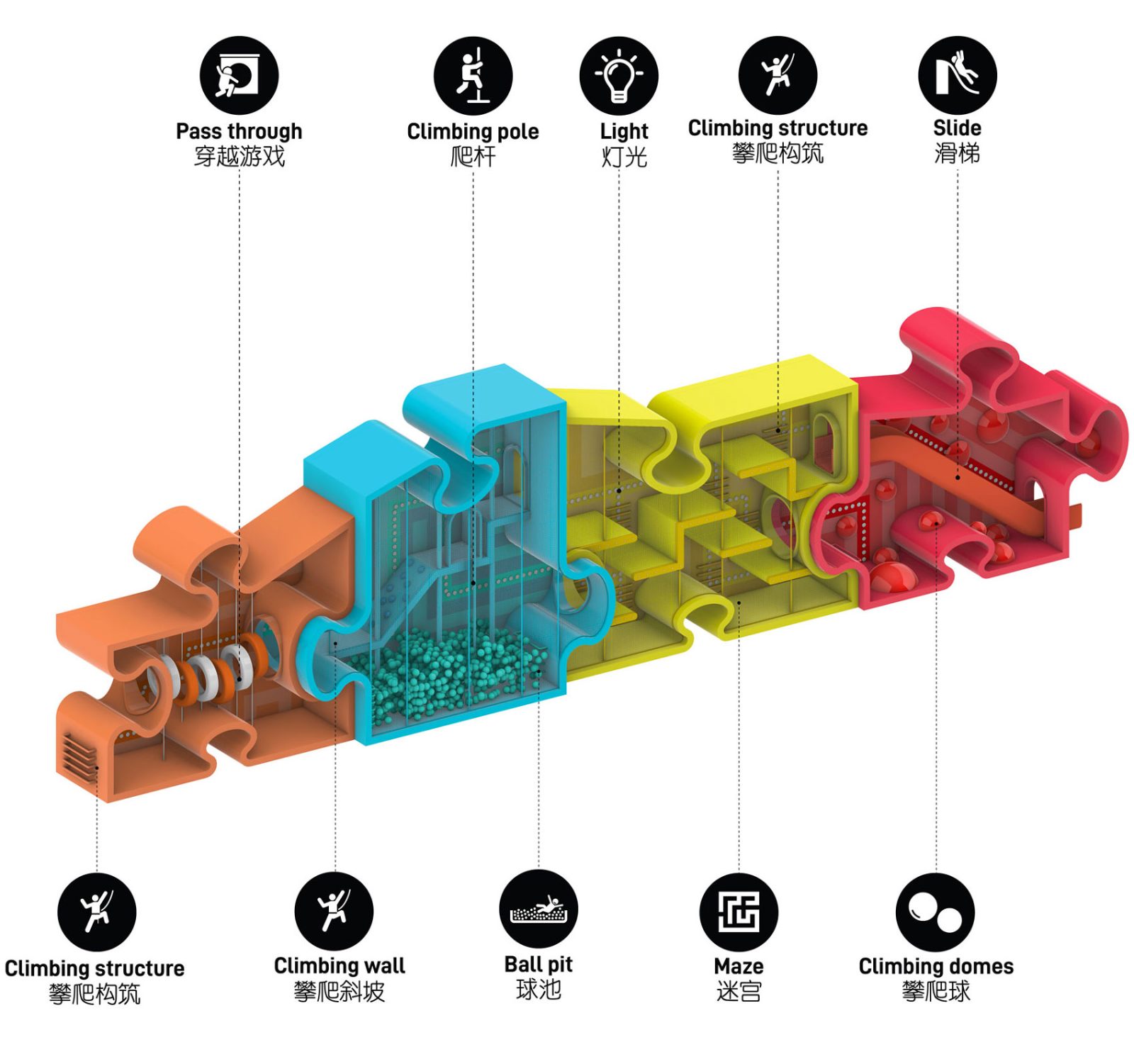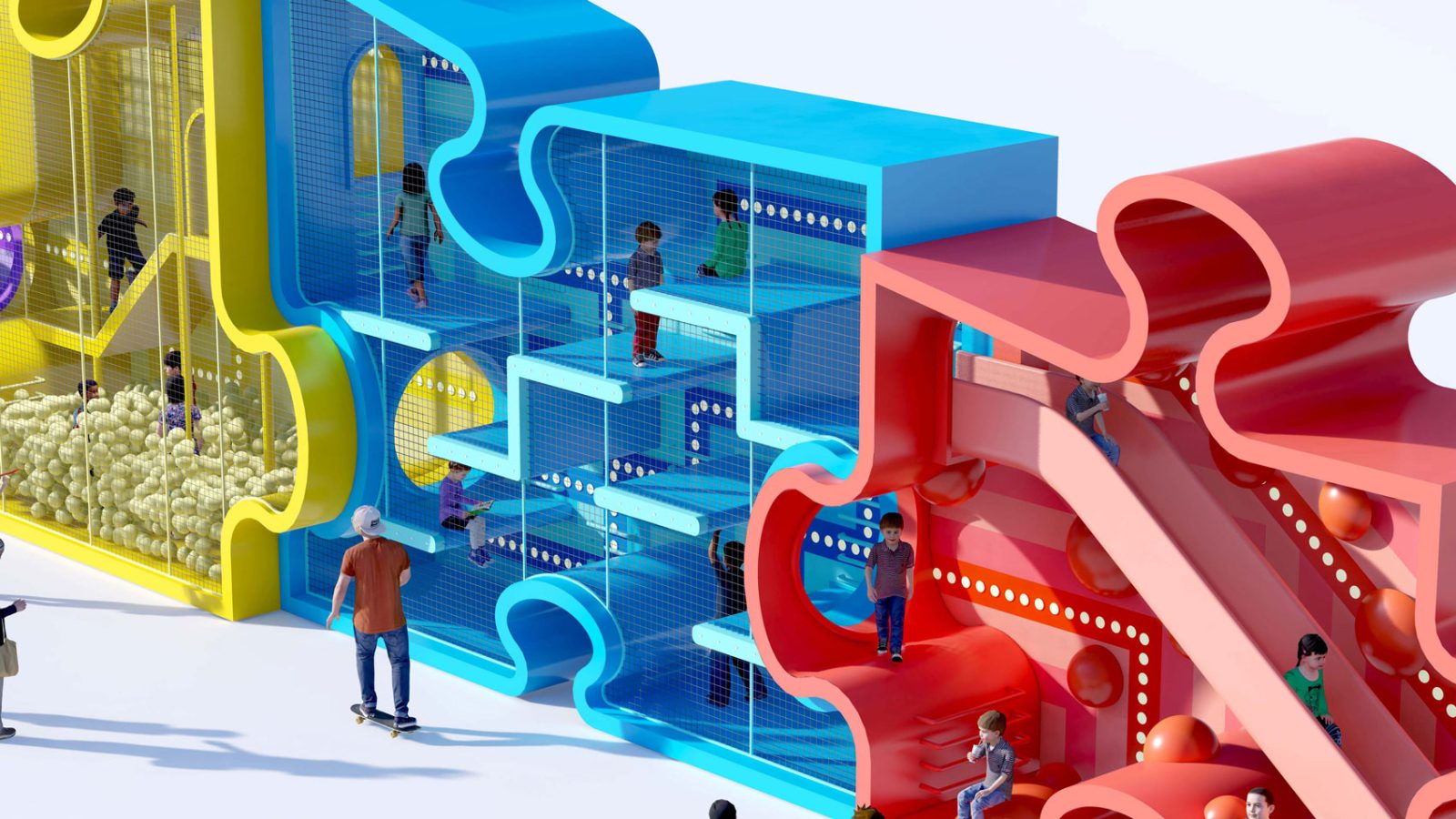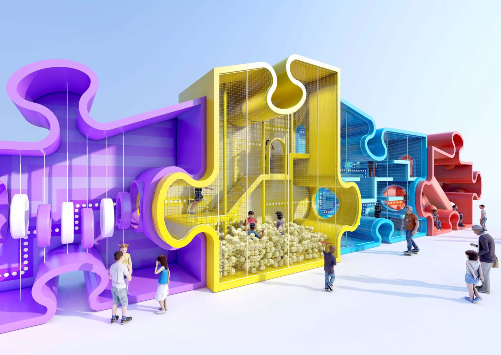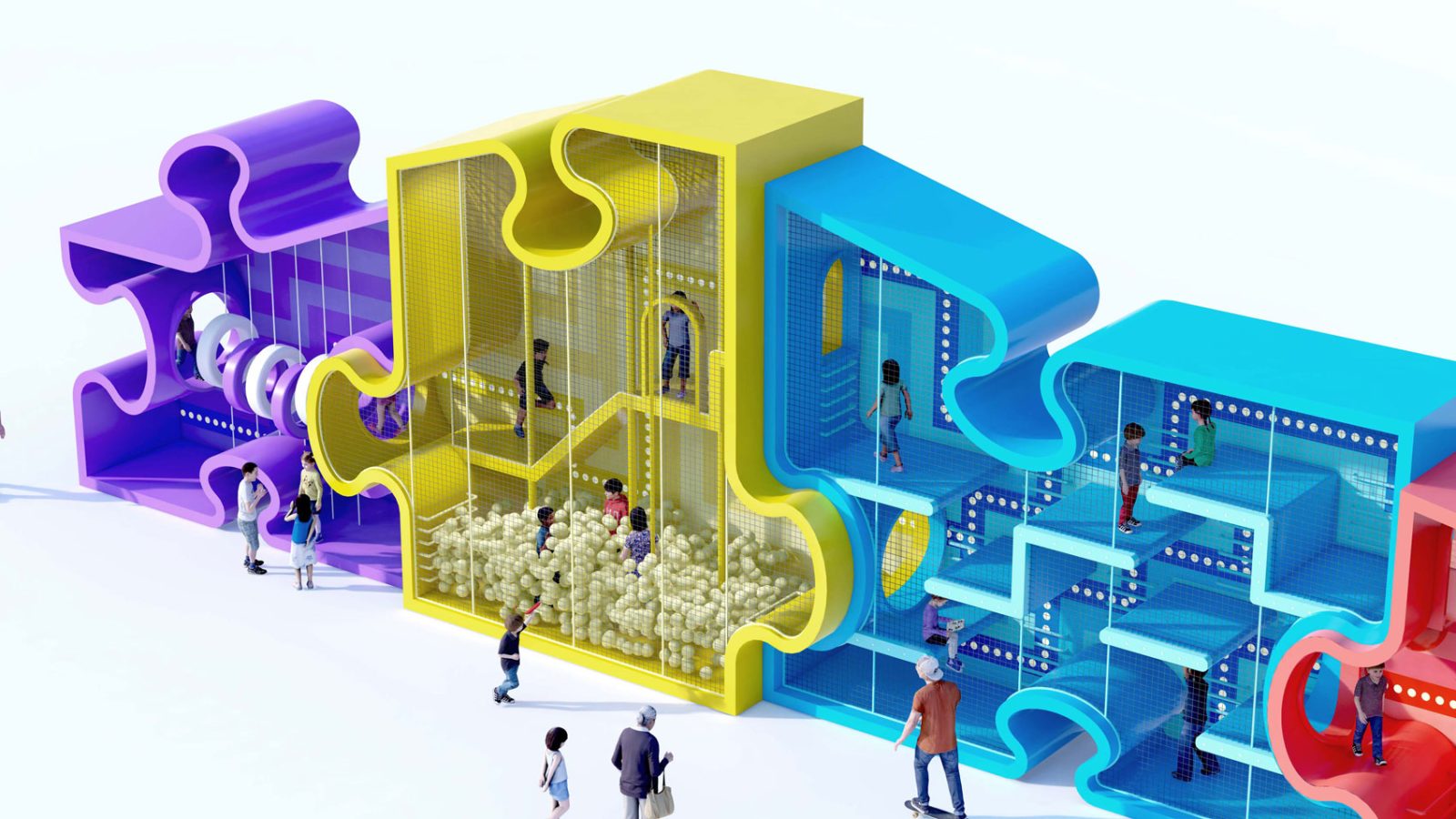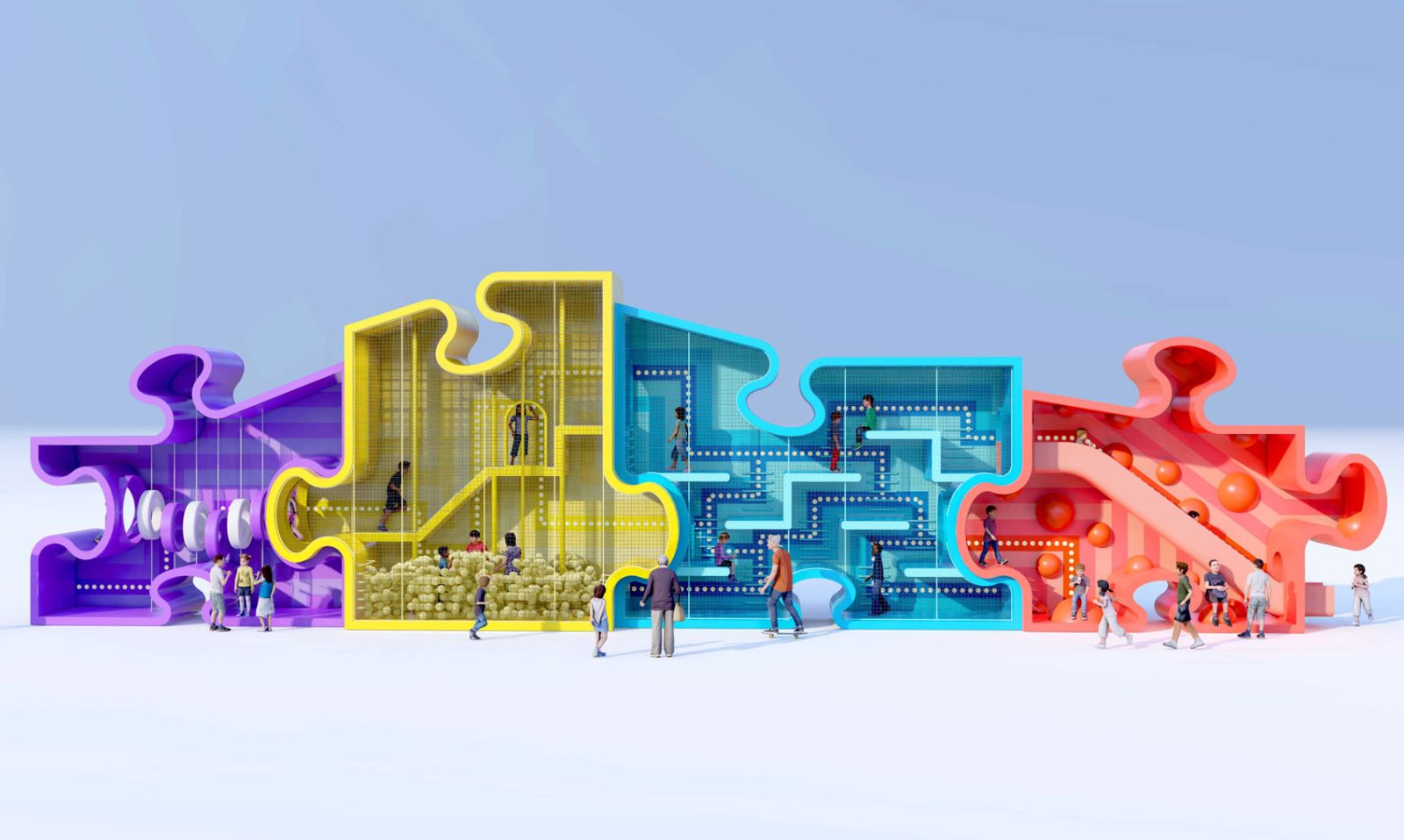 Consisting of four interlocking puzzle pieces, each providing distinct functions including a maze, a ball pit, a pass-through bridge, and a giant slide, alongside additional climbing structures and domes, the Puzzle Maze offers an exciting obstacle course for young adventurers.