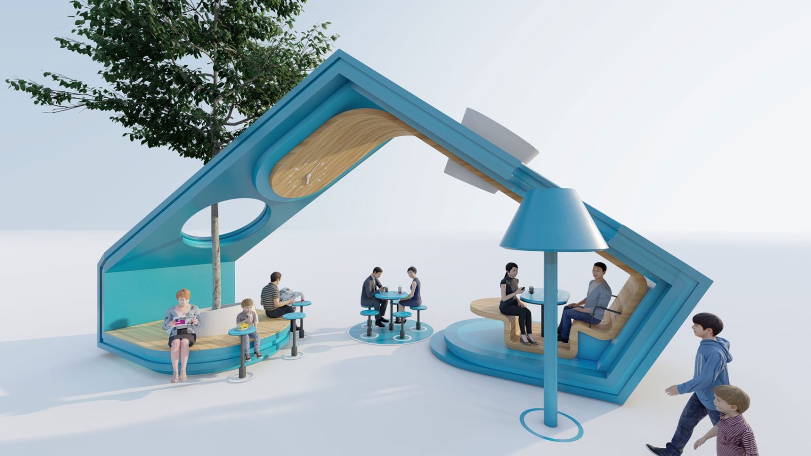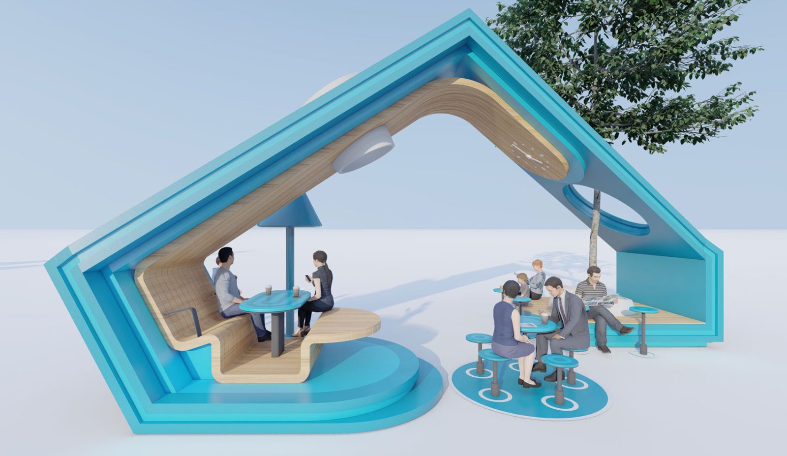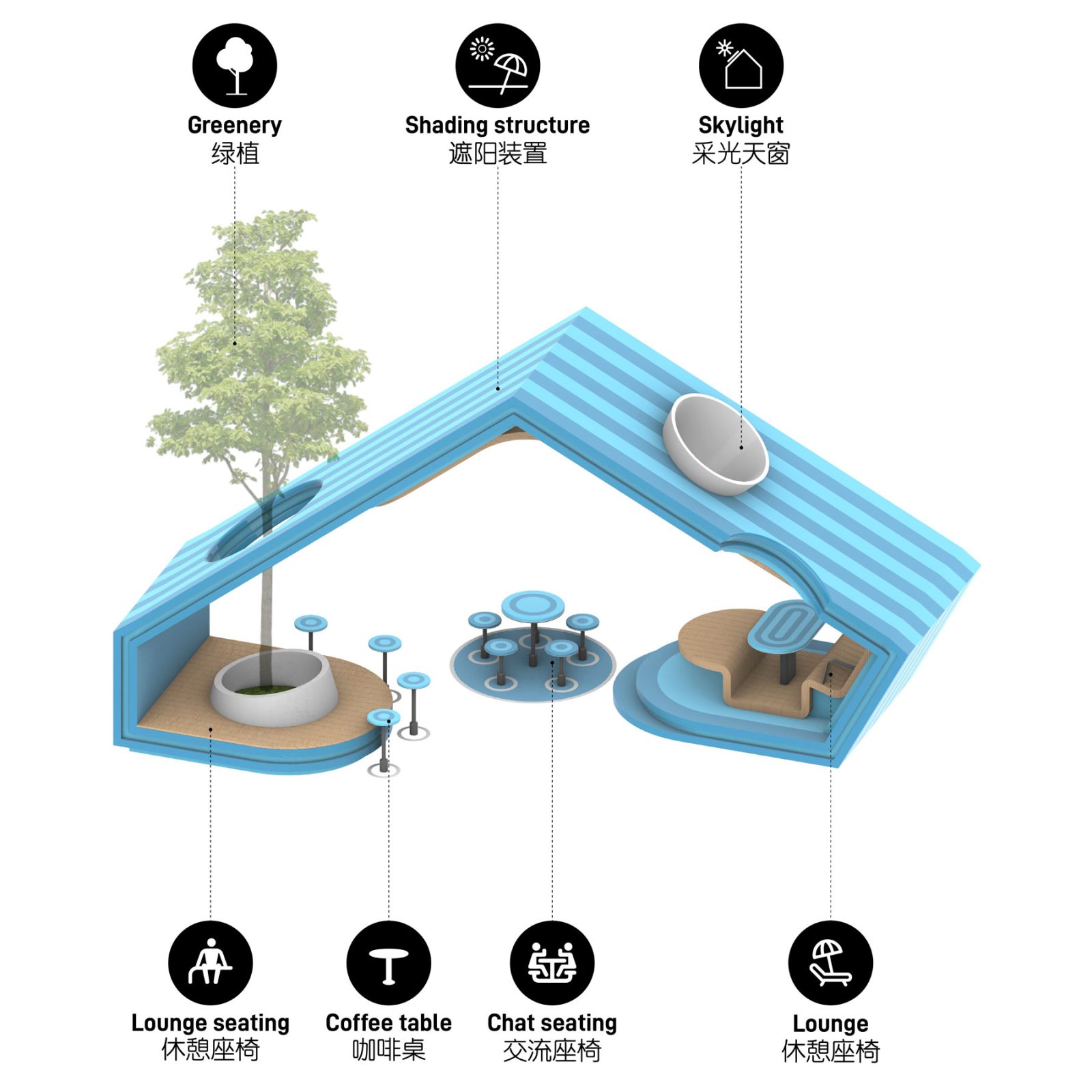 Accessible to pedestrians, it offers refuge from sunlight and rain while featuring facilities reminding an outdoor living room. These include a public clock, lighting lamp, charging spots, tree pots, and various seating arrangements conducive to social interactions