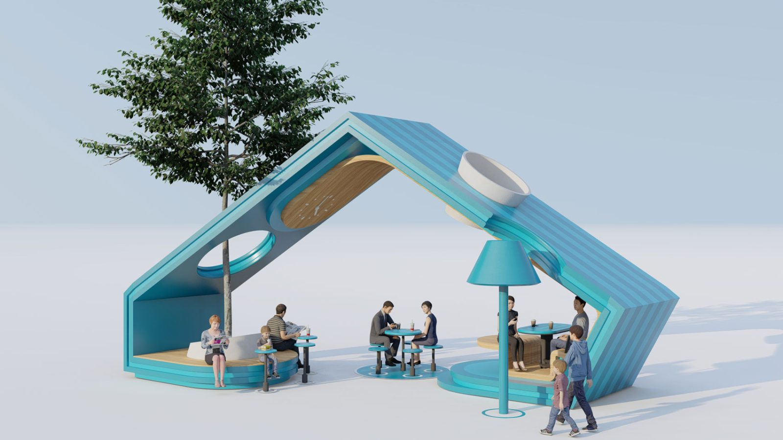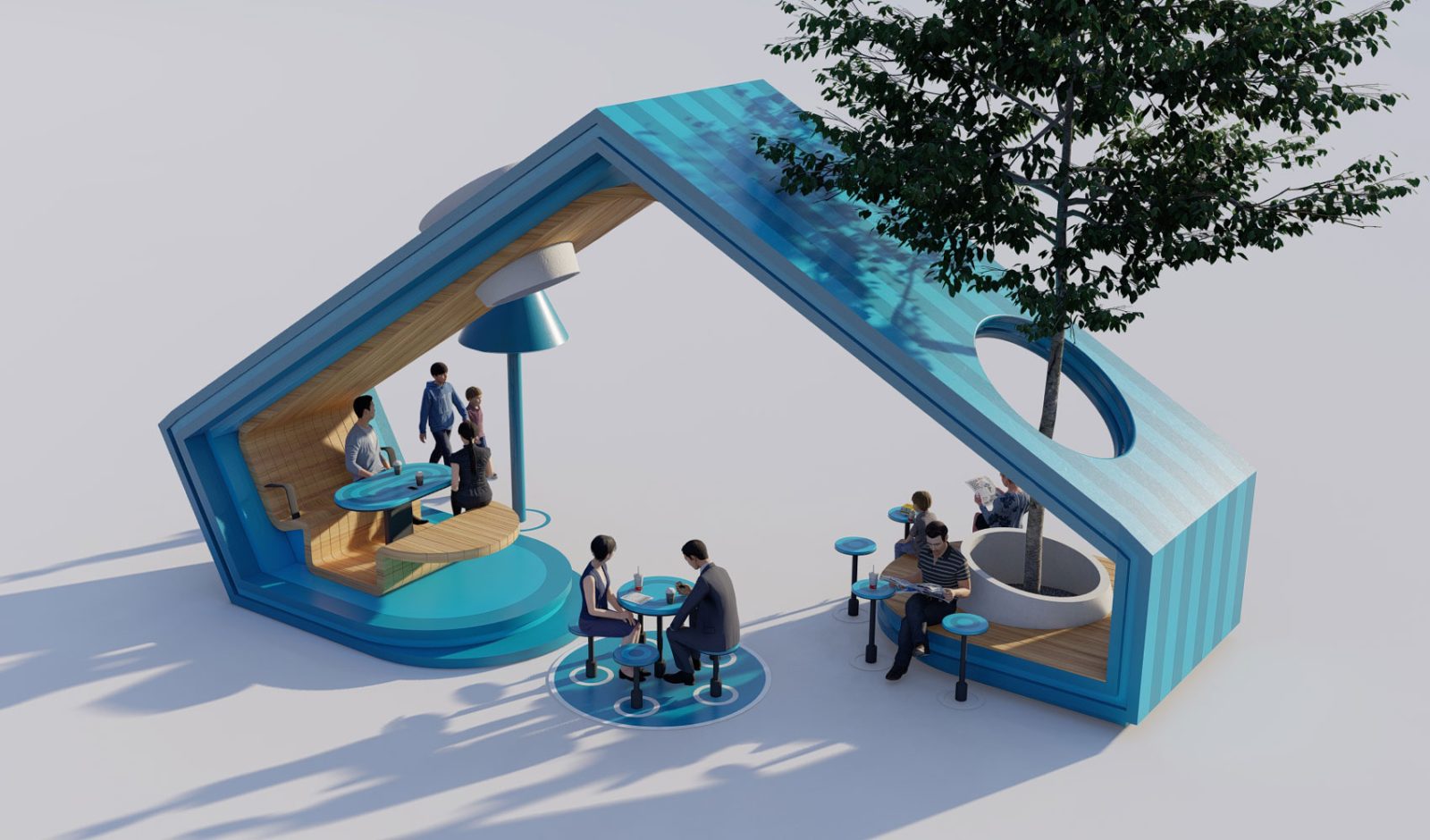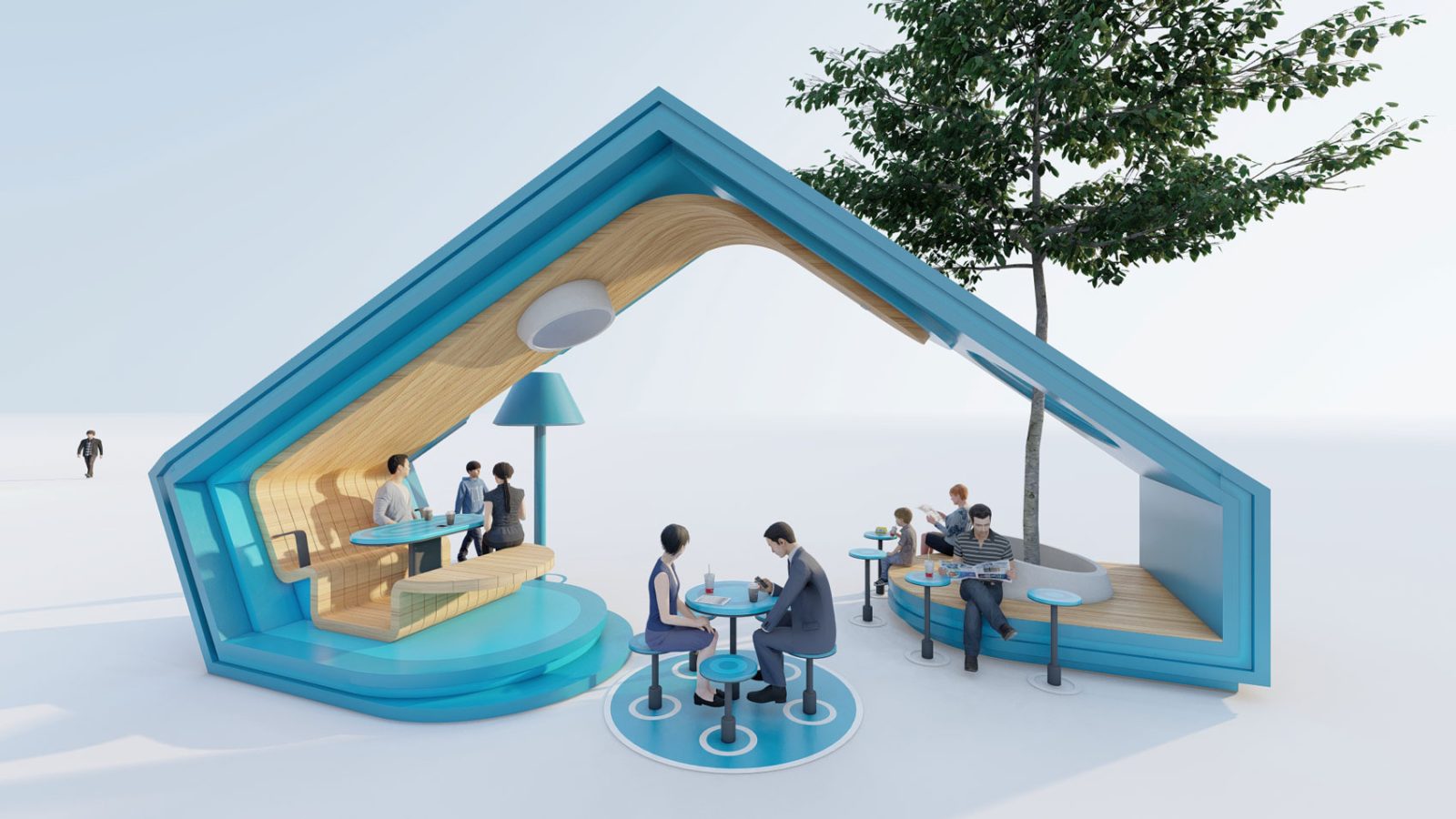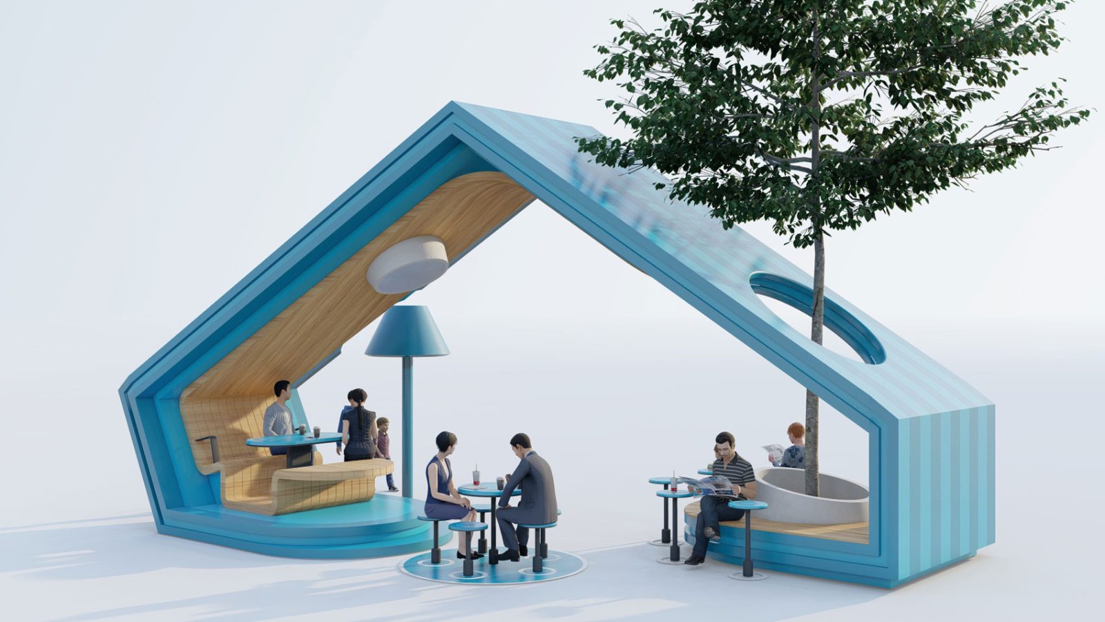 Accessible to pedestrians, it offers refuge from sunlight and rain while featuring facilities reminding an outdoor living room. These include a public clock, lighting lamp, charging spots, tree pots, and various seating arrangements conducive to social interactions