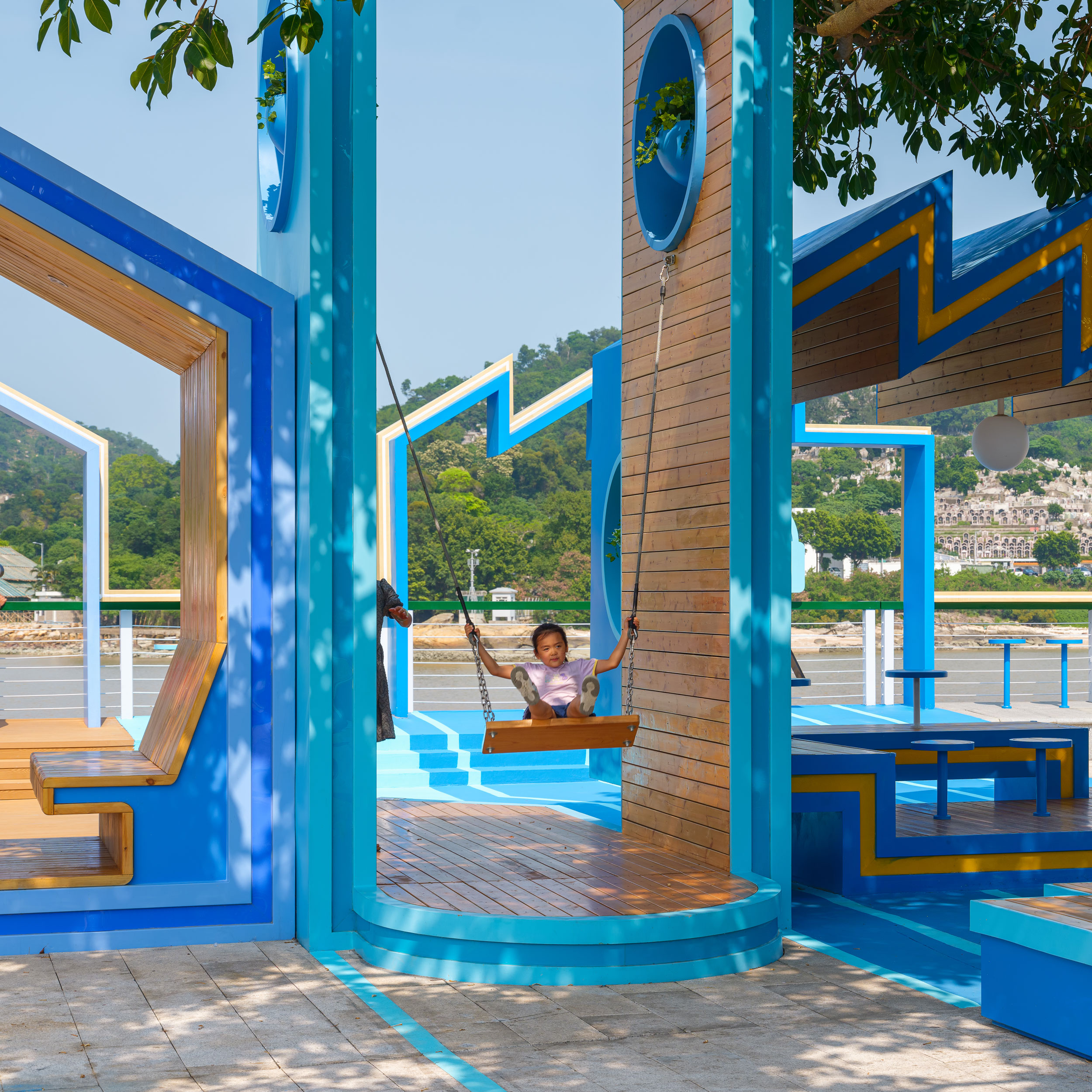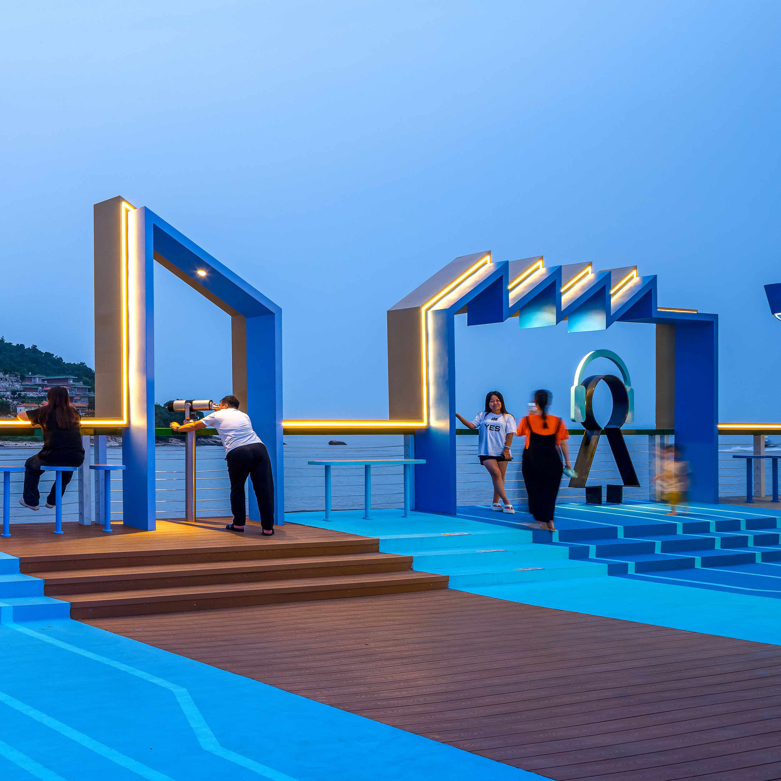 Overlooking Macau from Hengqin Island’s waterfront, ElectroHut introduces essential amenities and striking platforms aimed at fostering an outdoor lifestyle and encouraging social interaction among citizens and tourist. Simultaneously, it establishes a distinctive visual identity for Hengqin Island. This project is part of a broader series of interventions undertaken by 100architects along the Hengqin waterfront.