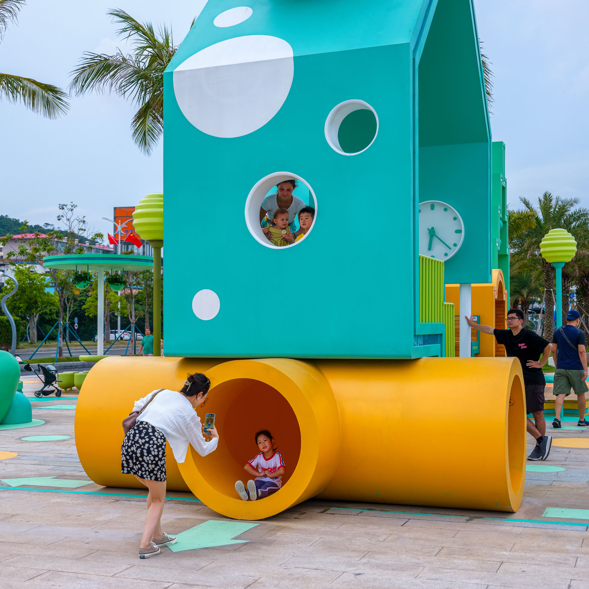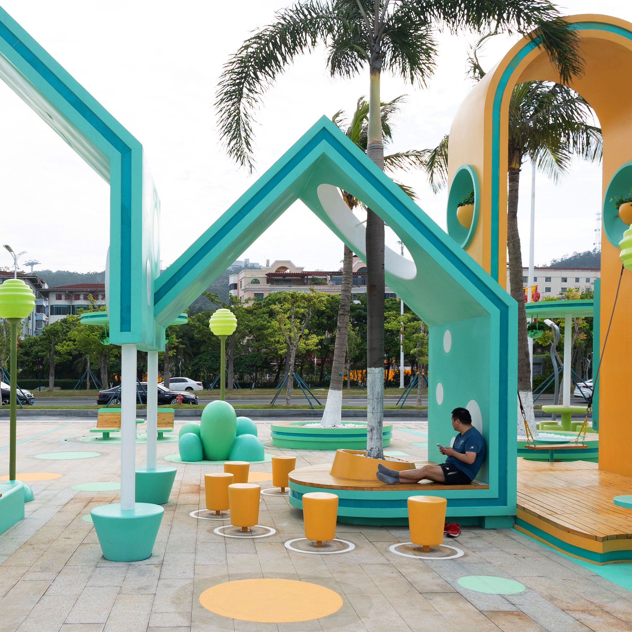 While the outer surfaces are intentionally colorful and captivating, the inner surfaces of the capsules are crafted with warm wood finishings, offering a cozy place to spend some quality leisure time. These capsules serve diverse purposes, while some are intended for social gatherings and casual chats, others are equipped with playful installations like swings, seesaws, and slides, offering leisure and entertainment in equal doses.