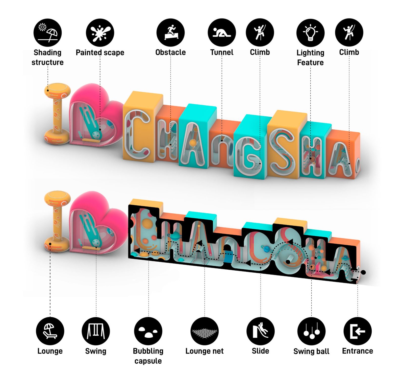 Besides serving as an eye-catching & cheerful logo to be watched and photographed as perfect social media content to be shared, the project also offers play equipment hidden inside the capsules that form the name Changsha, for joy & entertainment of the little ones.