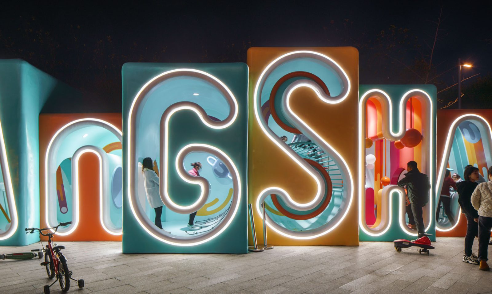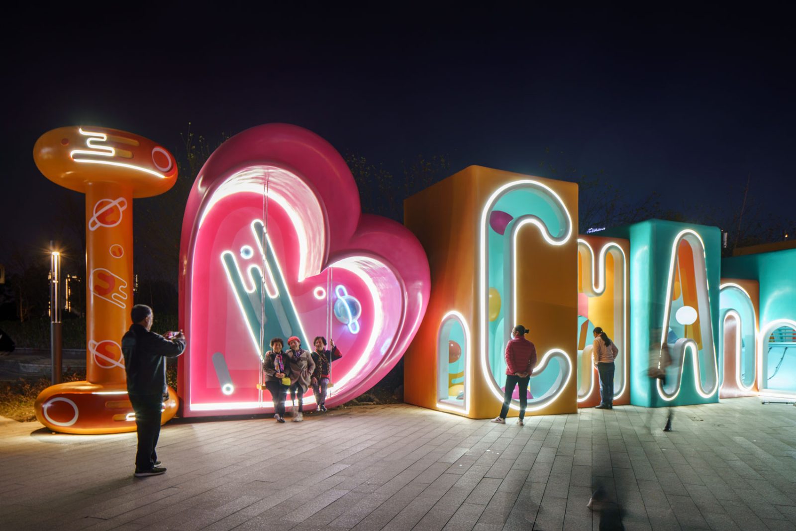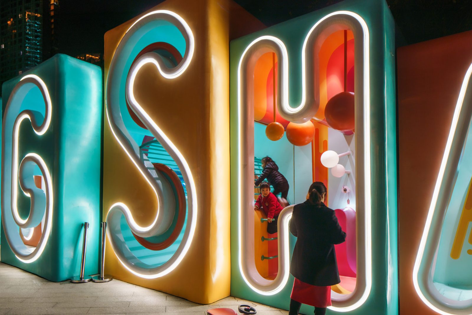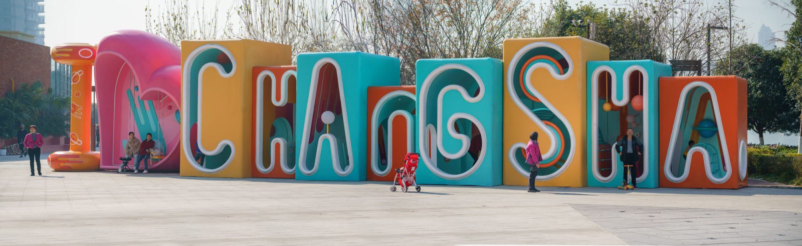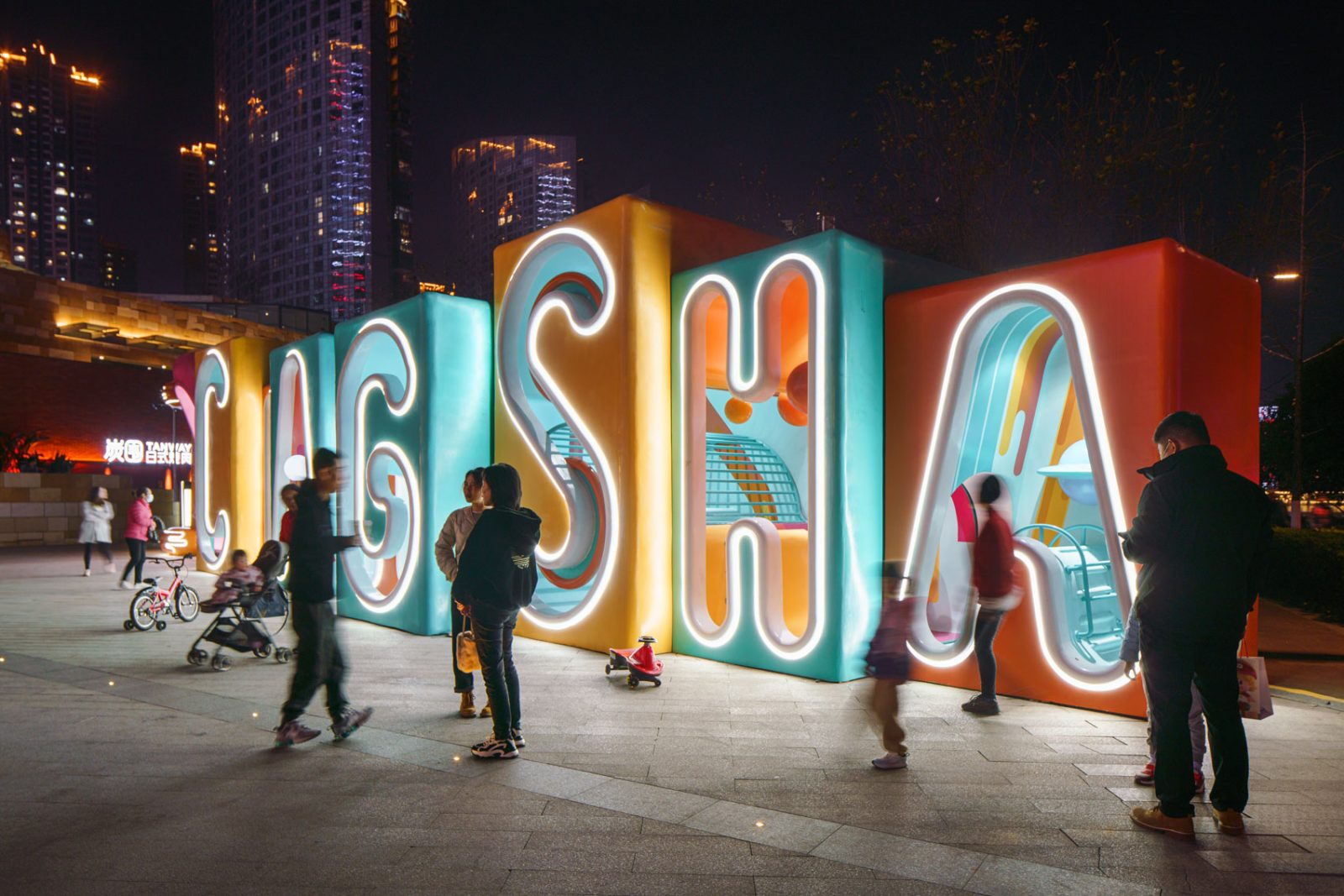 The eye-catching public artwork intends to create a trendy & recognizable urban landmark at the main front plaza, using giant letters as a cheerful IP logo of the city’s name. The artwork is also thought to be a catalyzer for social interactions around it, as an outdoor meeting point and leisure space with privileged views over the Xiang River, enhancing the guest experience of youngsters and families visiting the commercial building in Kaifu District.
