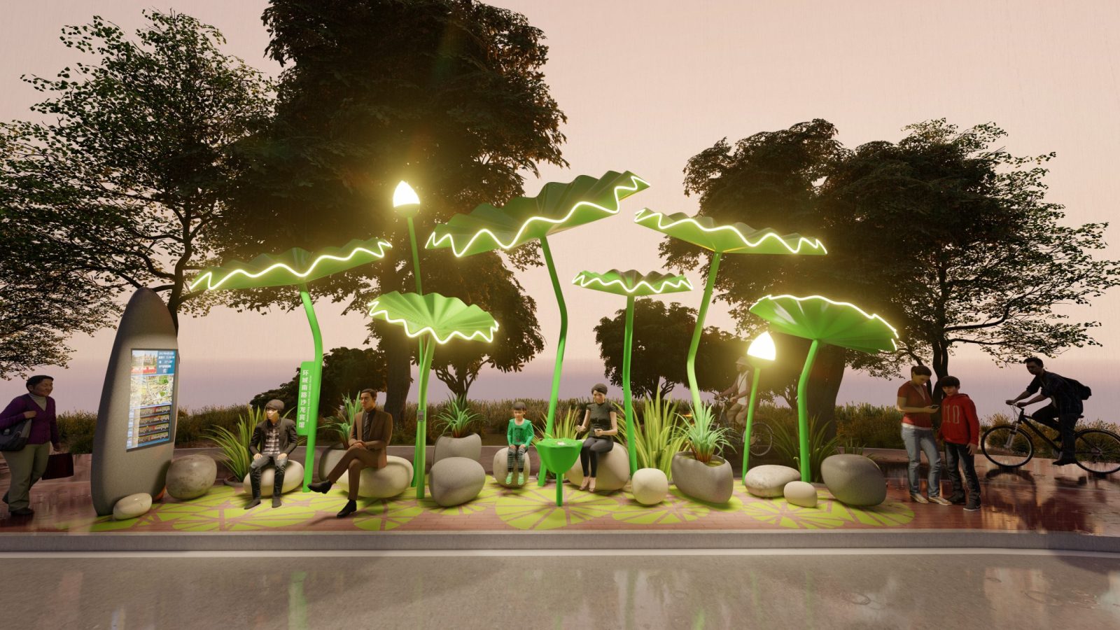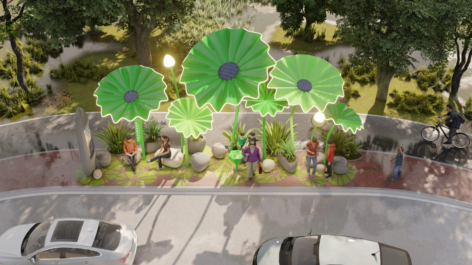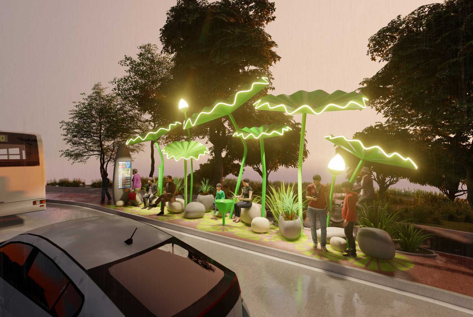 An eye-catching proposal inspired by the lotus flower that collects the rain water and solar energy. A new generation of bus stops in Jiaxing, Zhejiang Province, China