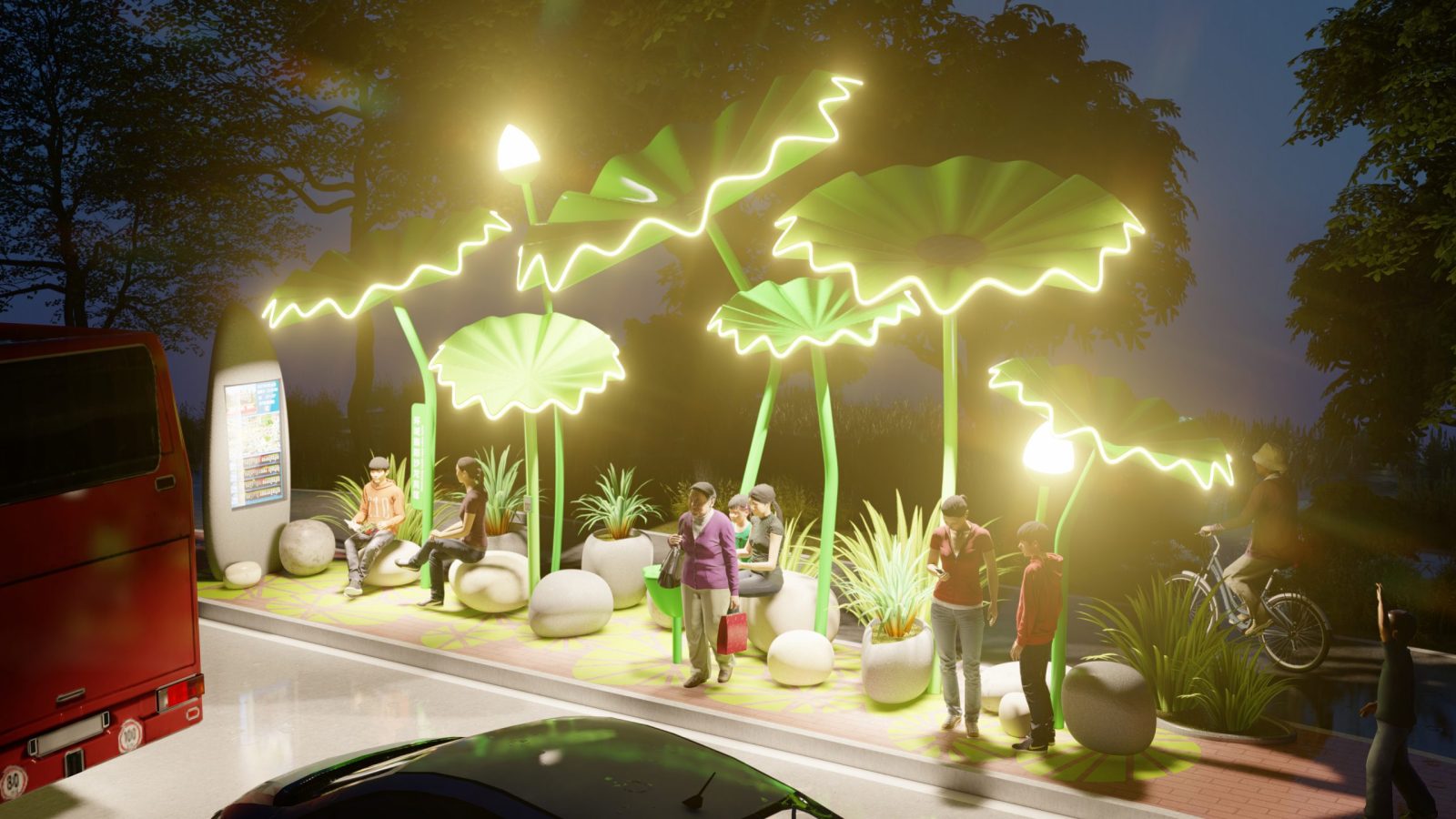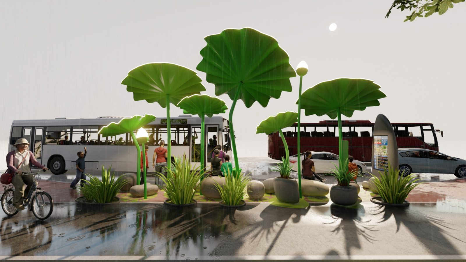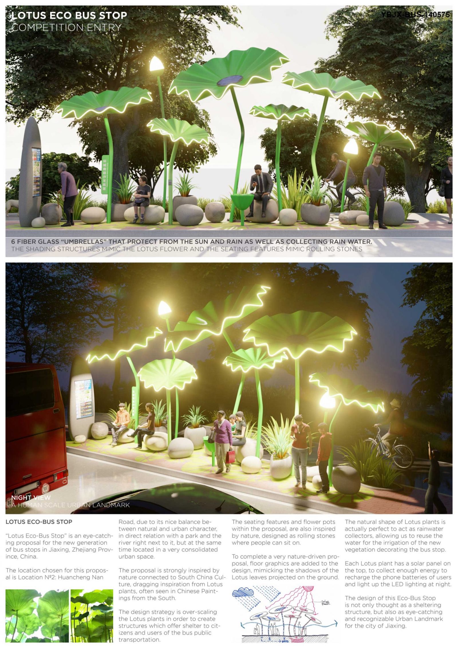The proposal is strongly inspired by nature connected to South China Culture, dragging inspiration from Lotus plants, often seen in Chinese Paintings from the South.The design strategy is over-scaling the Lotus plants in order to create structures which offer shelter to citizens and users of the bus public transportation.