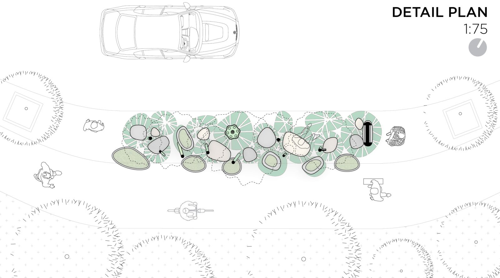 The seating features and flower pots within the proposal, are also inspired by nature, designed as rolling stones where people can sit on. To complete a very nature-driven proposal, floor graphics are added to the design, mimicking the shadows of the Lotus leaves projected on the ground.