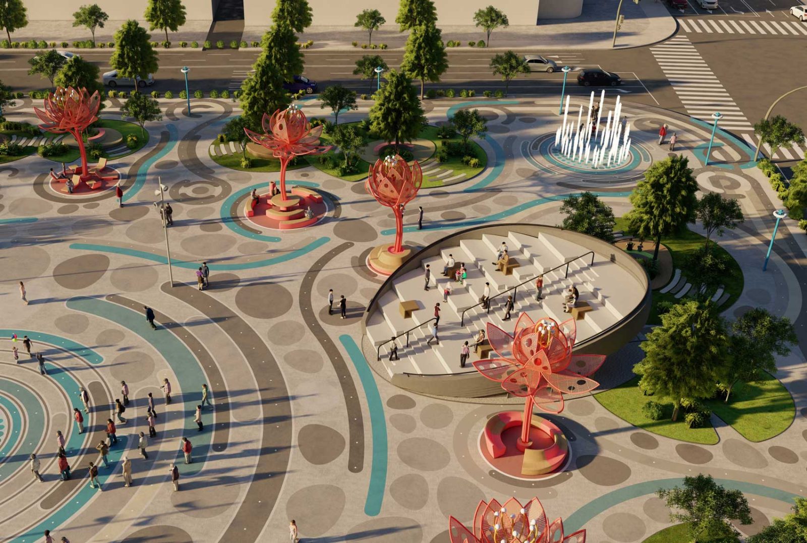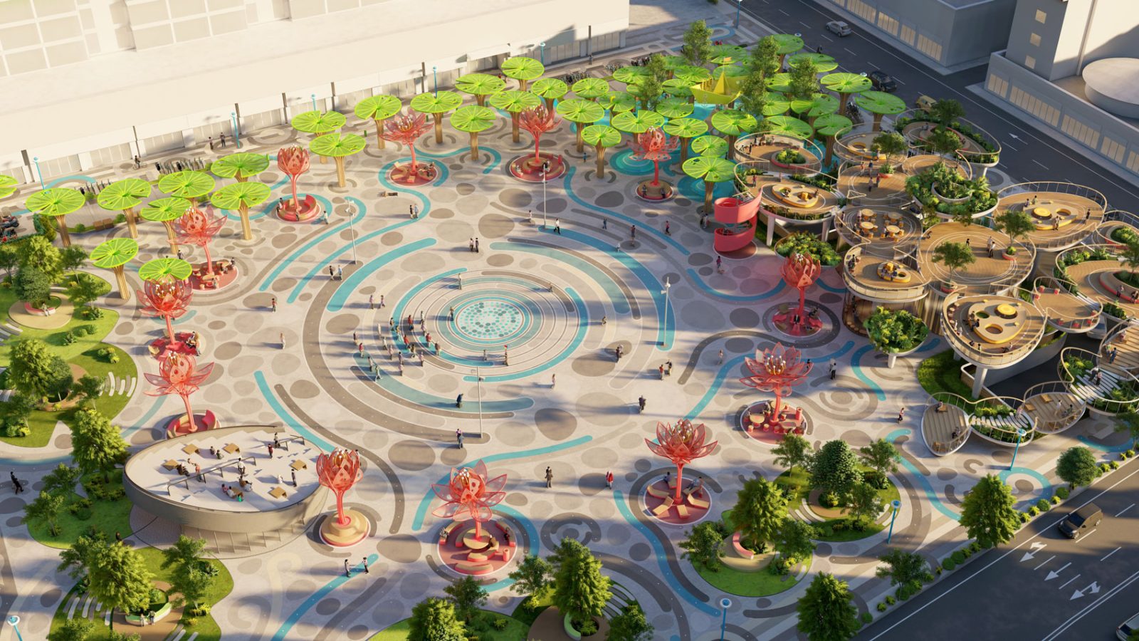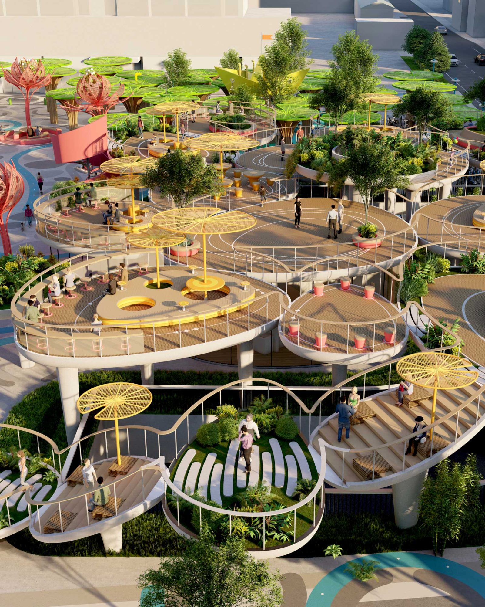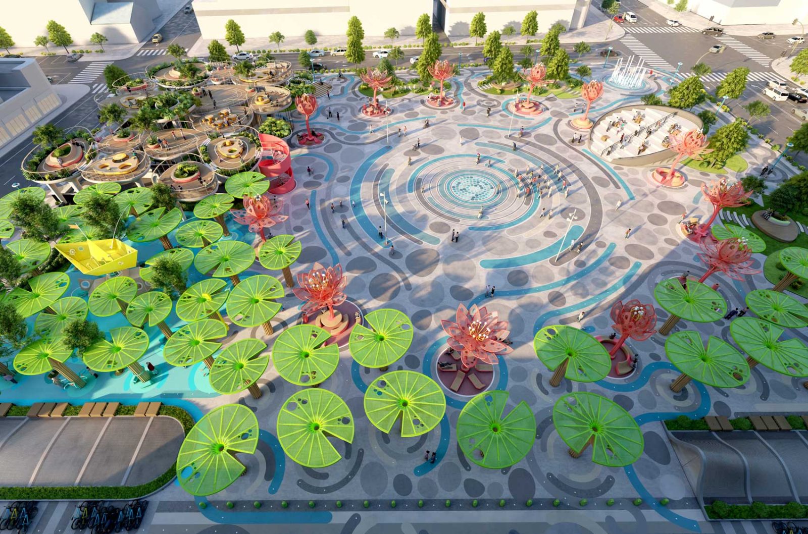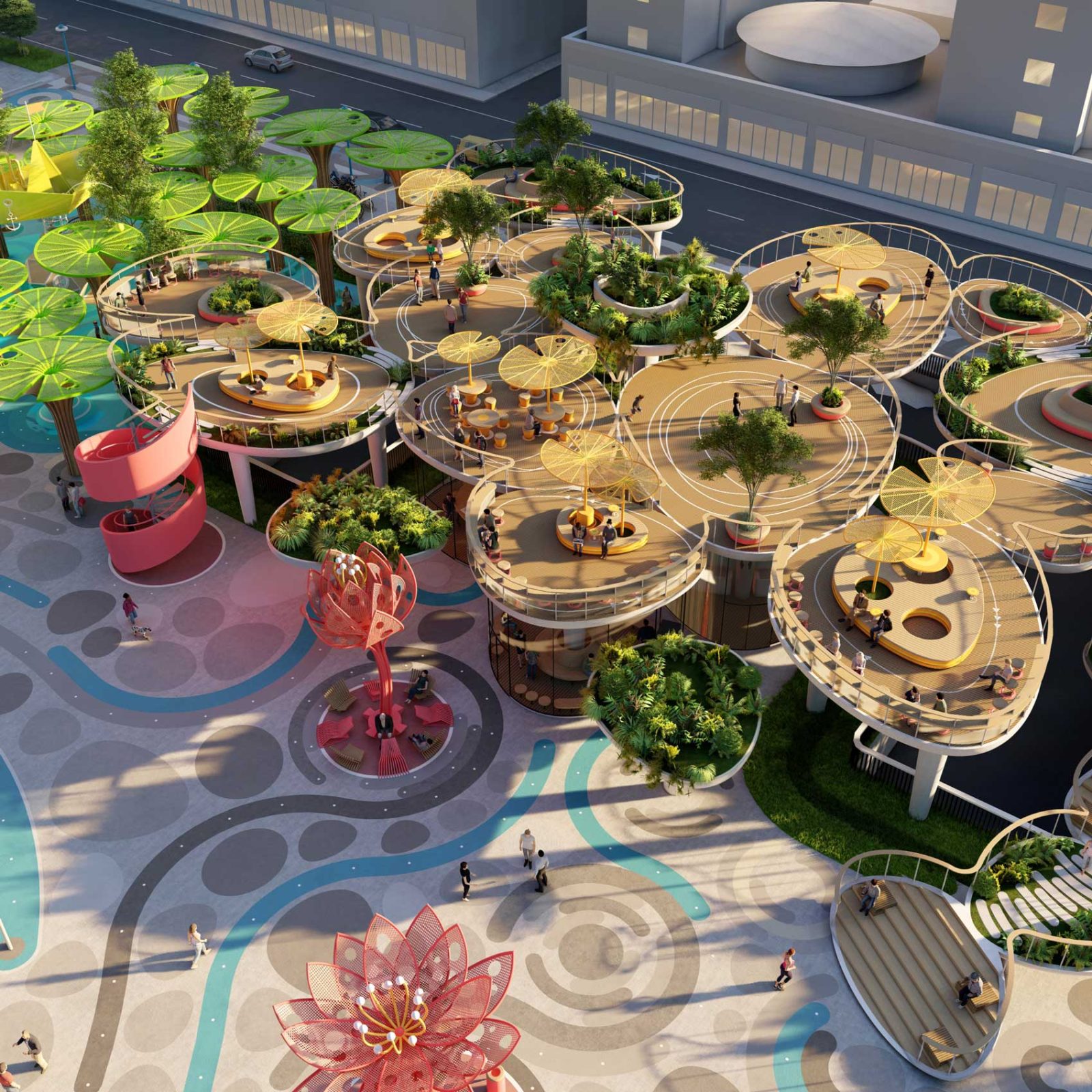 Around that central core of public activity, we laid out a resting ring composed by a series of 12 colorful and sculptural canopies in the shape of lotus flowers in different blooming stages, which, in addition to being decorative elements, provide shelter to the resting mini-plazas hosted beneath them.