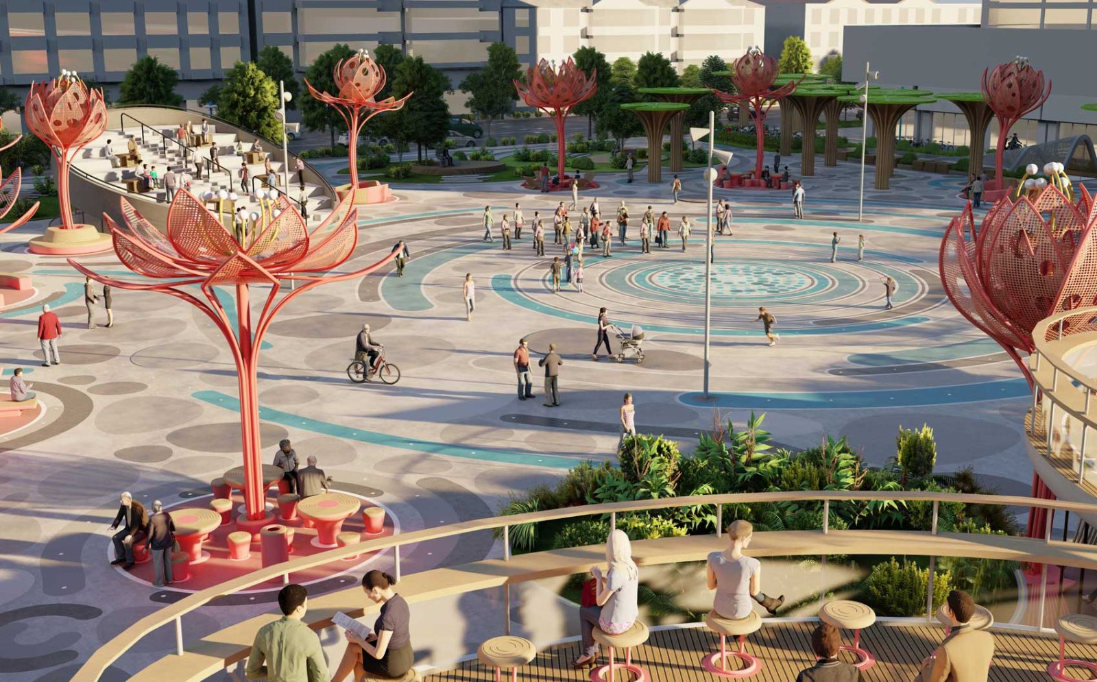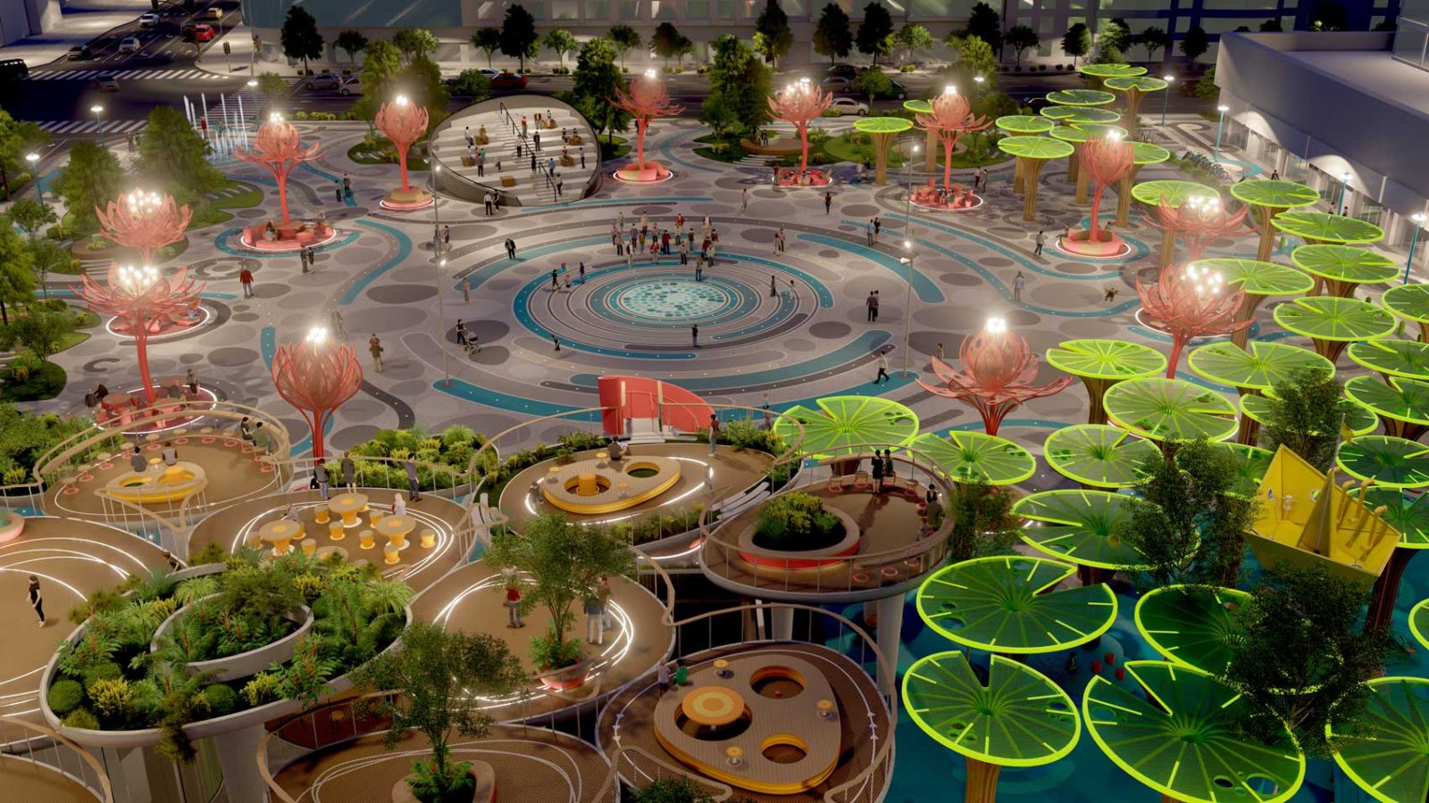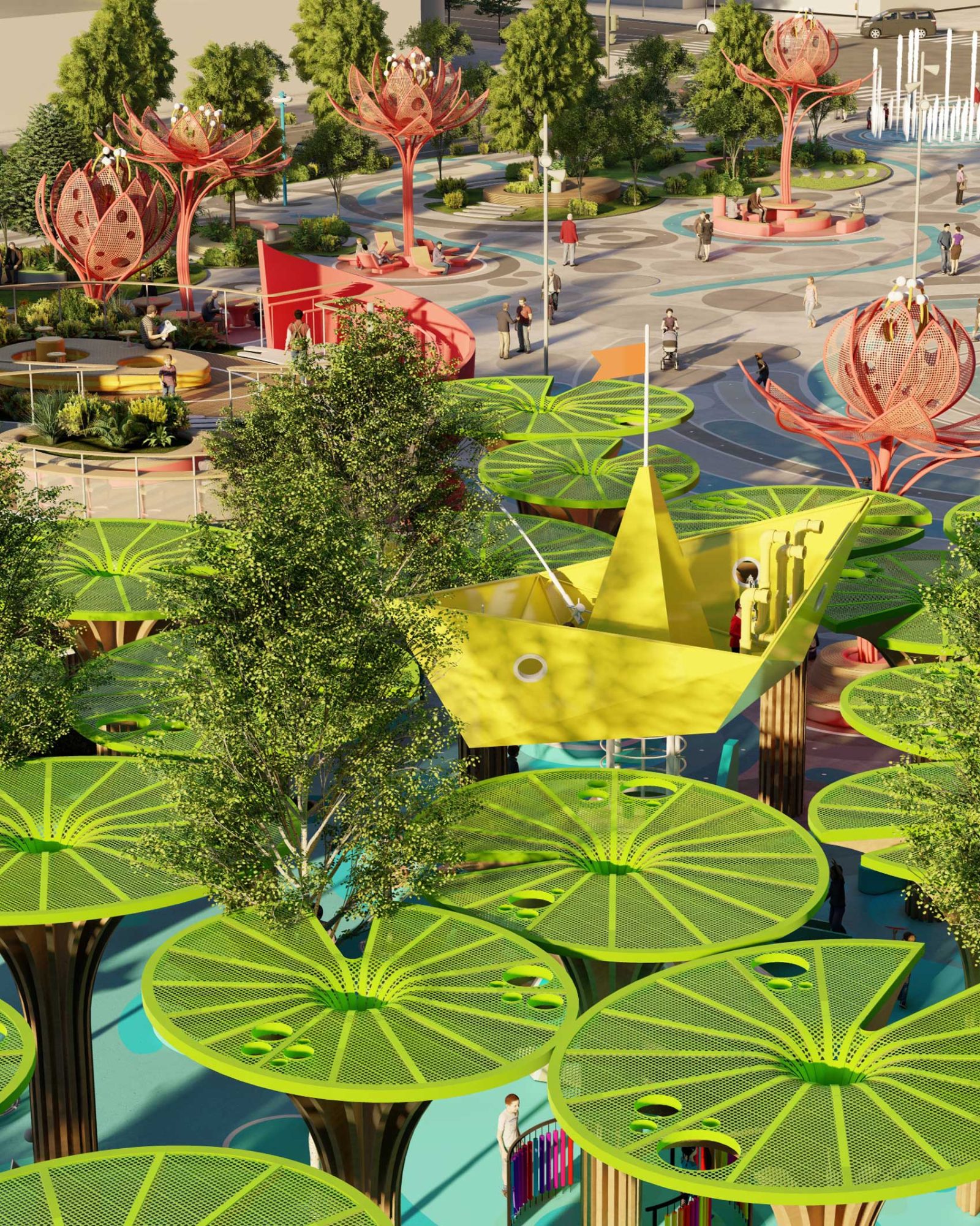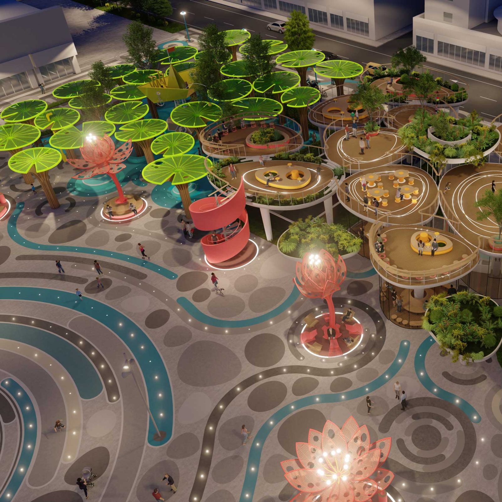 Around that central core of public activity, we laid out a resting ring composed by a series of 12 colorful and sculptural canopies in the shape of lotus flowers in different blooming stages, which, in addition to being decorative elements, provide shelter to the resting mini-plazas hosted beneath them.