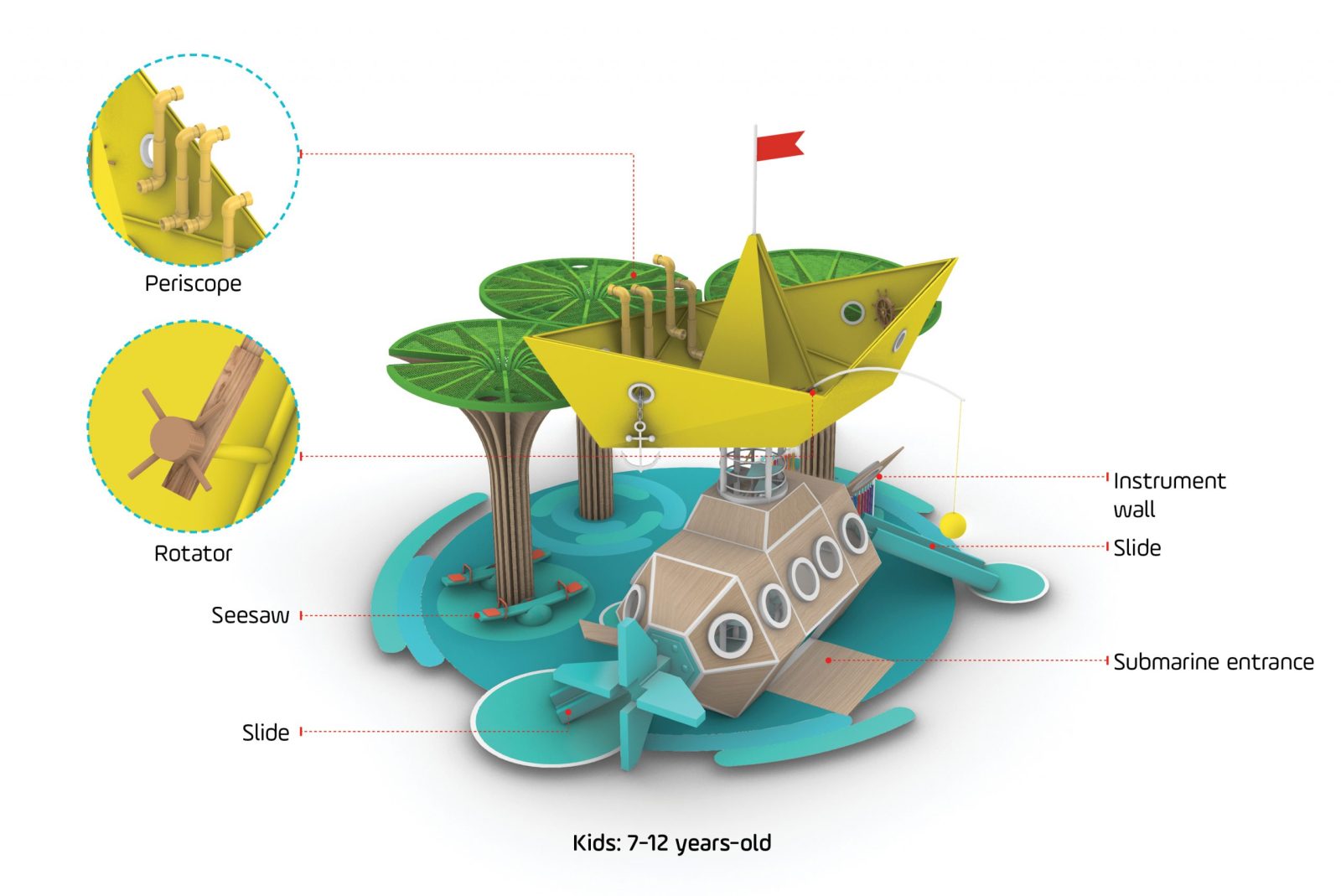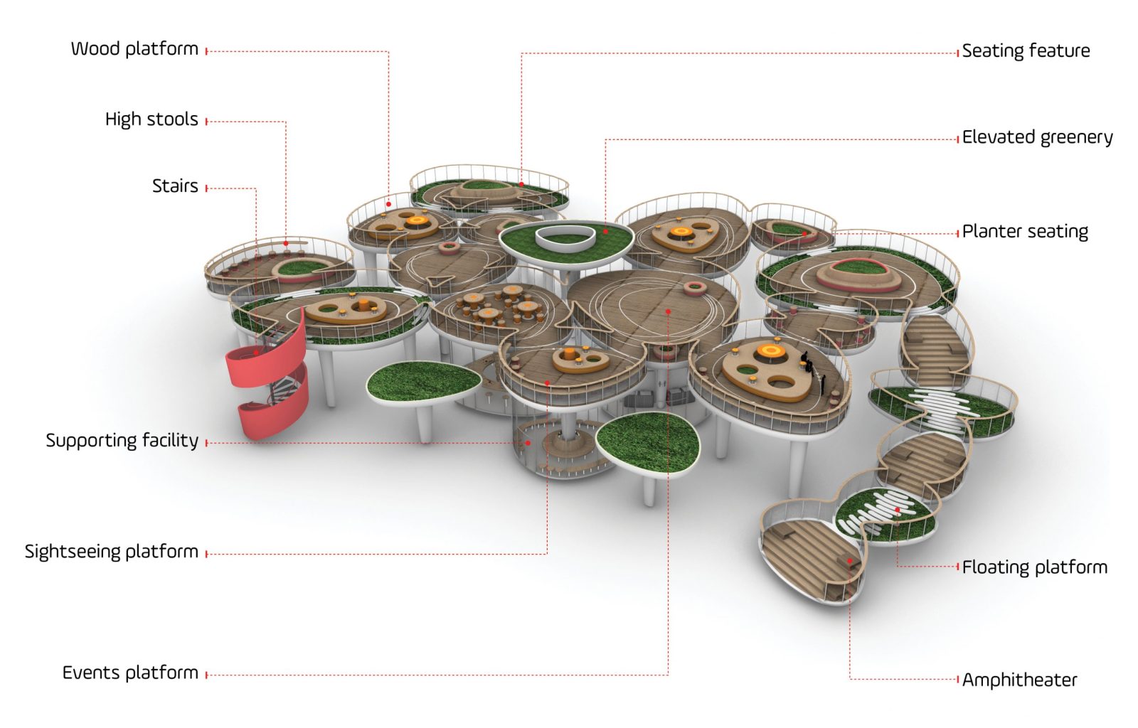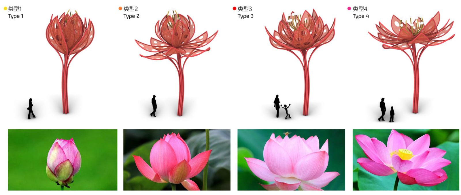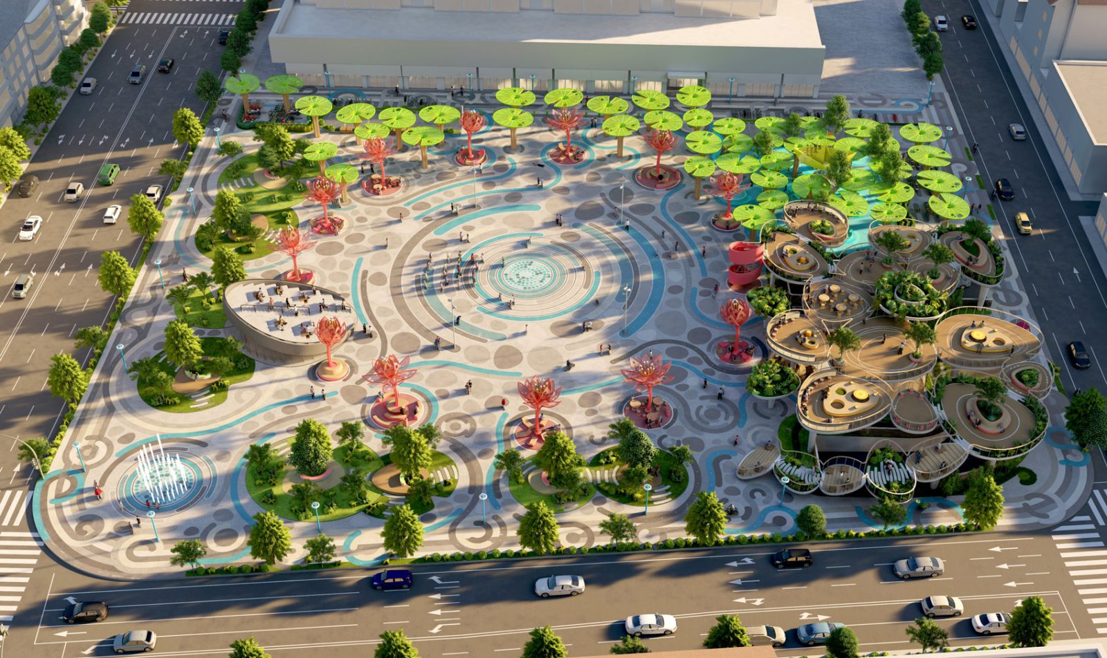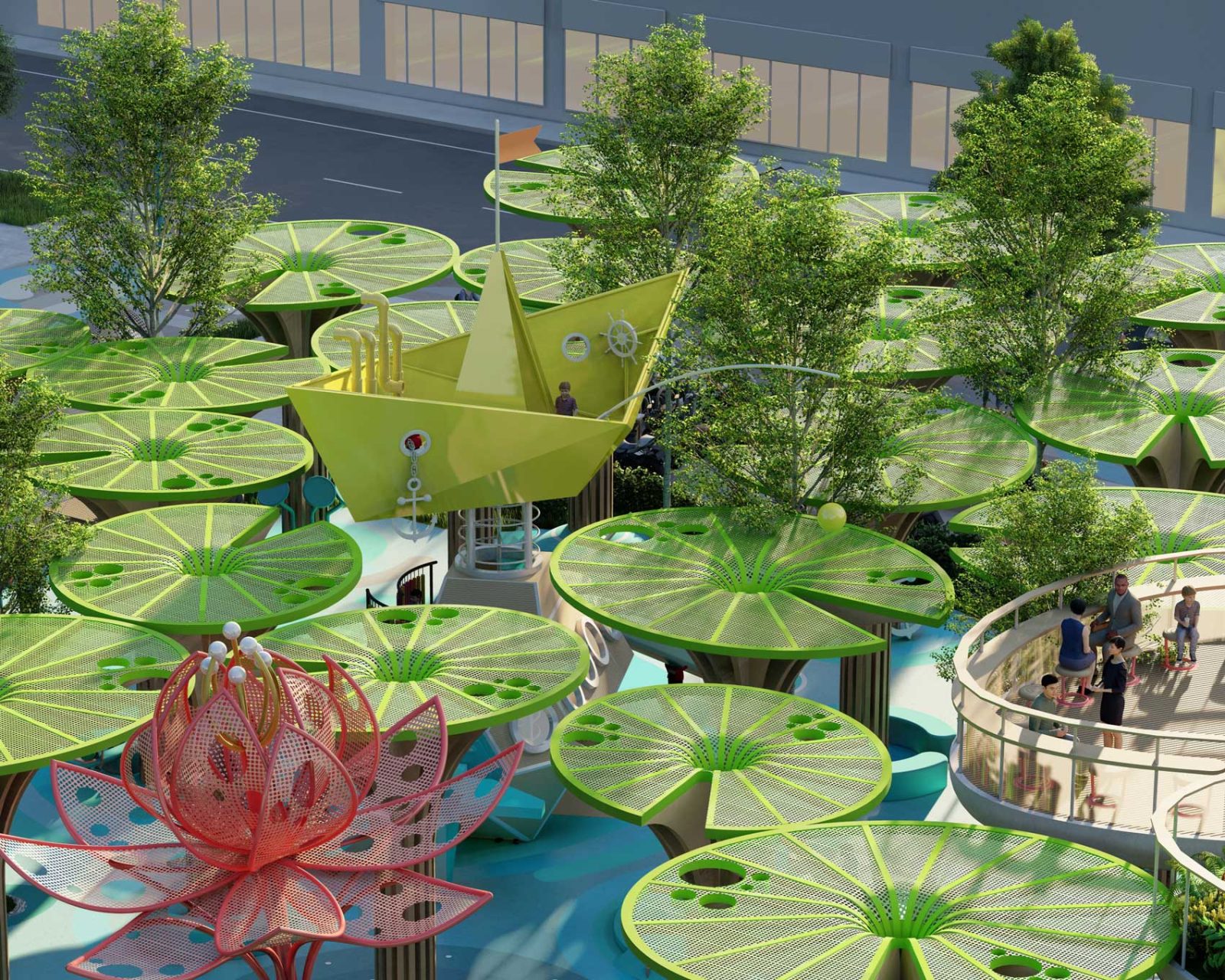 Around that central core of public activity, we laid out a resting ring composed by a series of 12 colorful and sculptural canopies in the shape of lotus flowers in different blooming stages, which, in addition to being decorative elements, provide shelter to the resting mini-plazas hosted beneath them.