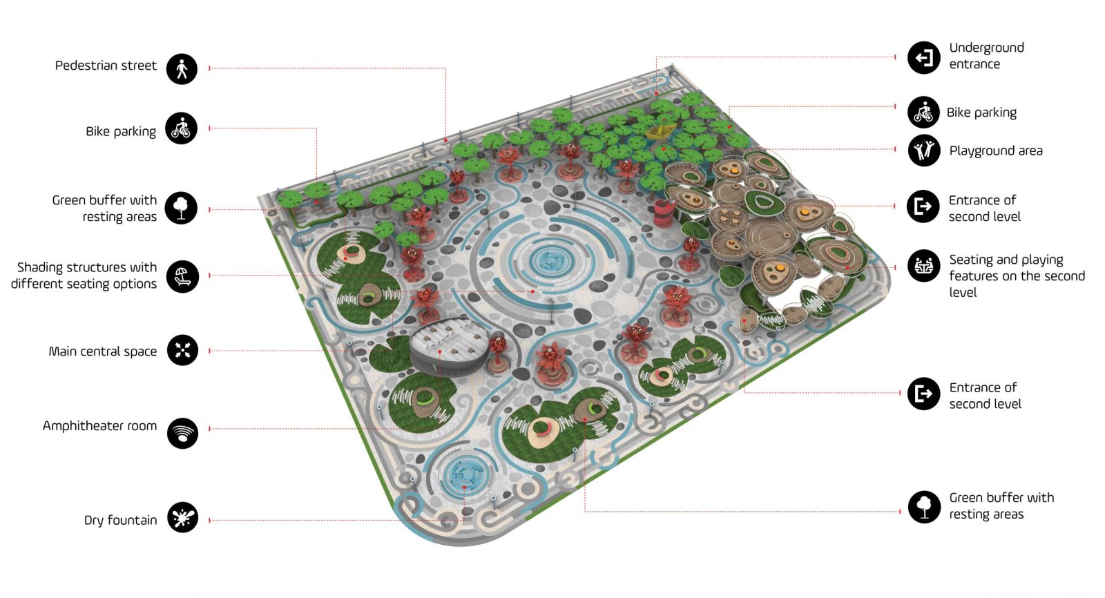 The most spectacular and significant addition to this new version of the Plaza, is a new Sky Park, a system of elevated platforms is the shape of rolling stones, thought to comply with 3 functions. Firstly, covering both entry & exit car ramps leading to the underground parking lot, allowing us to get rid of the existing constructions built for that purpose, and consequently opening up the square towards that service road with important F&B character. Secondly, hosting underneath 3 covered pavilions for relocating the public WC, an indoor Aced resting area for elders, and a rentable commercial space to equip the square with a small convenience store. And last but most innovative, an elevated walkable park equipped with resting and gathering areas besides lush greenery as a new platform for pleasant social interactions, offering new and interesting visuals over the main central performance space and the city itself.