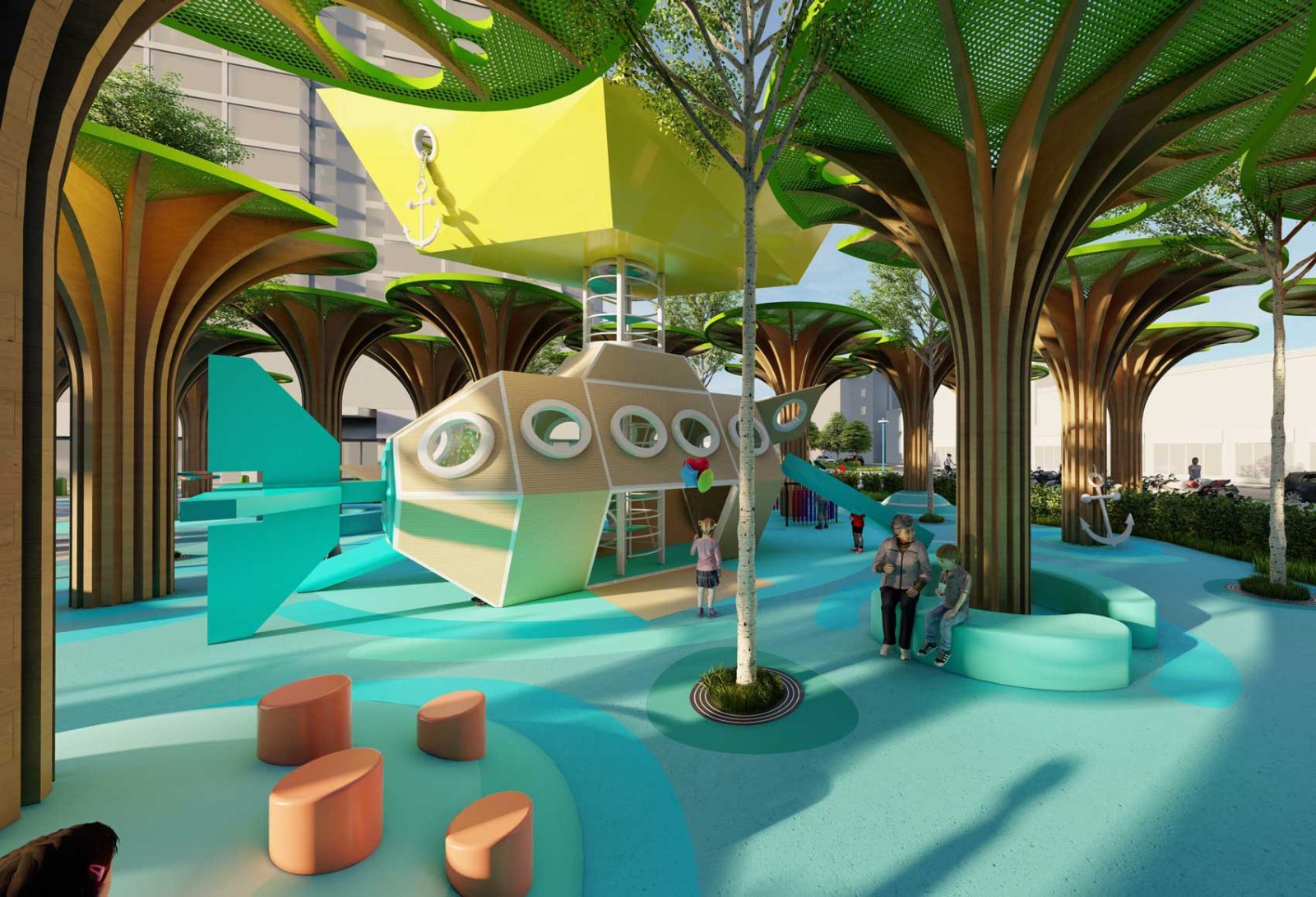 The new proposal will also count with a dedicated Children Play Area, strategically located in the safest corner of the Square, away from the main roads with heavy traffic and protected by the existing construction that gives vehicles access to the underground parking lot. In order to protect kids from sun and rain, the entire playground is covered with green canopies in the shape of water lilies, conceding an interesting forest-like appearance to kids playing inside. Those green canopies are then multiplied along the retail street adjacent to the residential tower, setting the border between square and retail street.