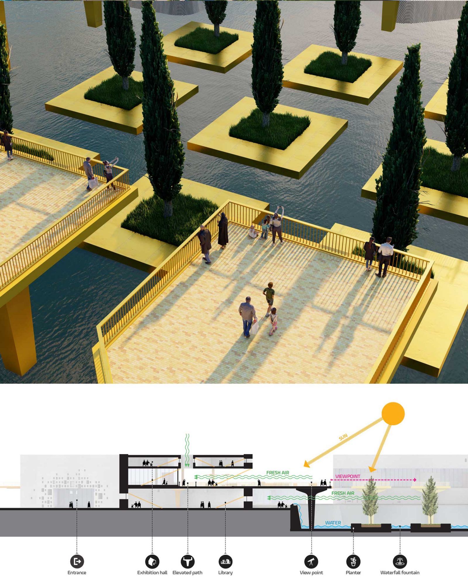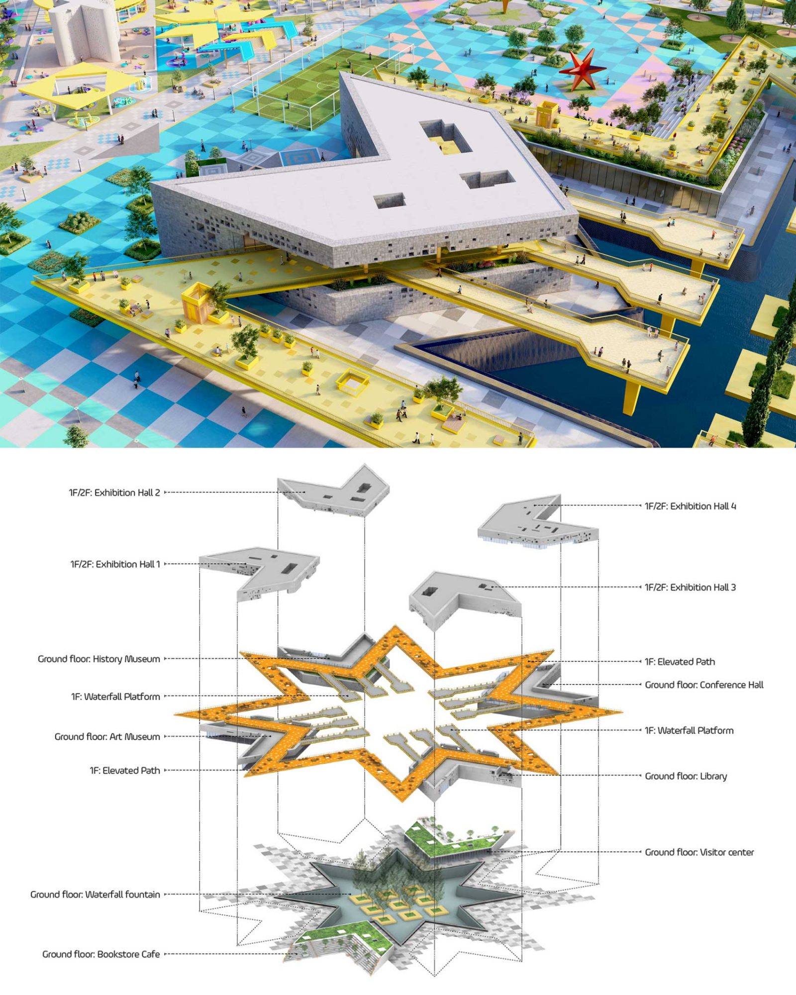 At the center of the project stands the monumental memorial complex, symbolizing the soul of the country. Four grand buildings — an art museum, a history museum, a library, and a conference hall — occupy the ground floor, forming the cultural heart of the site. On the second floor, four large exhibition halls are connected by an elevated green pathway that crosses through each building.