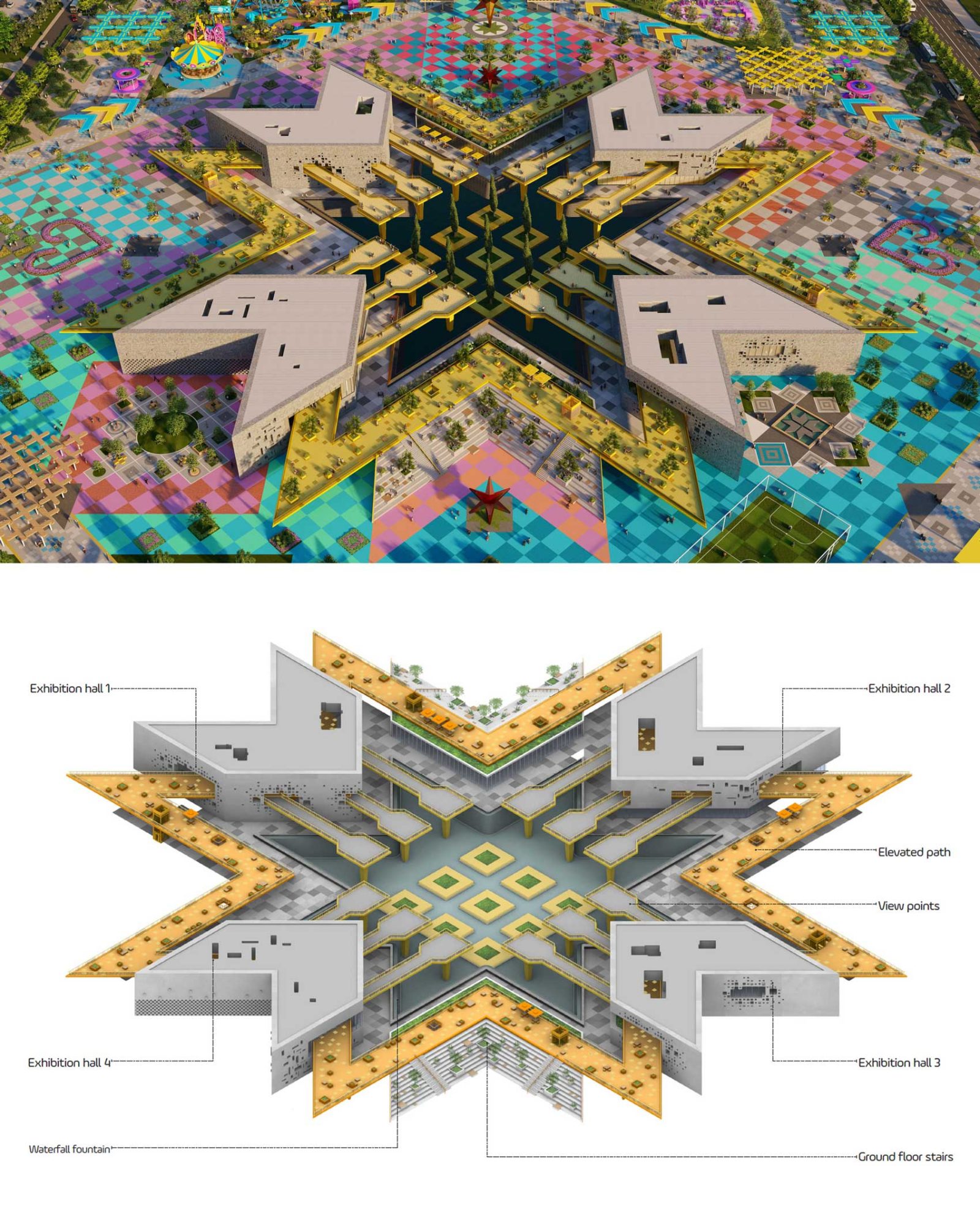 This grand intervention, also referred to as the Juldyz Memorial and Entertainment Hub, transforms traditional Kazakh ornamental patterns into contemporary geometric abstractions. These patterns define floor graphics, landscape elements, and architectural forms, creating a rich visual identity that feels both timeless and innovative.