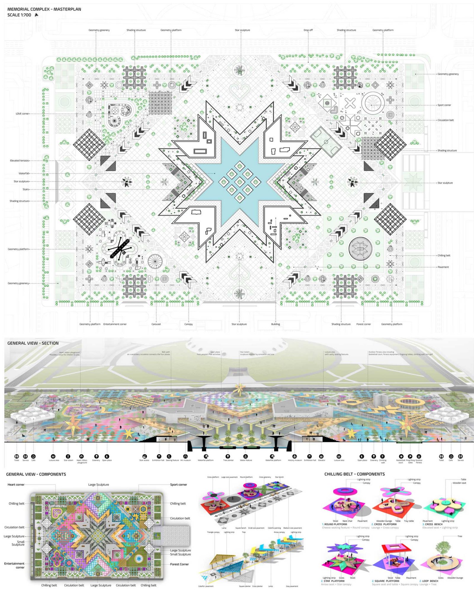 The layout of Nomad’s Carpet is structured around four distinct corners, each dedicated to a specific function. One corner becomes a vibrant sports hub with courts, fields, and workout zones. Another is transformed into an urban forest for relaxation. A third hosts a playful theme park for family entertainment, while the fourth offers a peaceful green park for gatherings and leisure. Each corner is complemented by a service building providing key amenities such as a training center, arcade, co-working space, and indoor gym, ensuring the site serves the community on multiple levels.