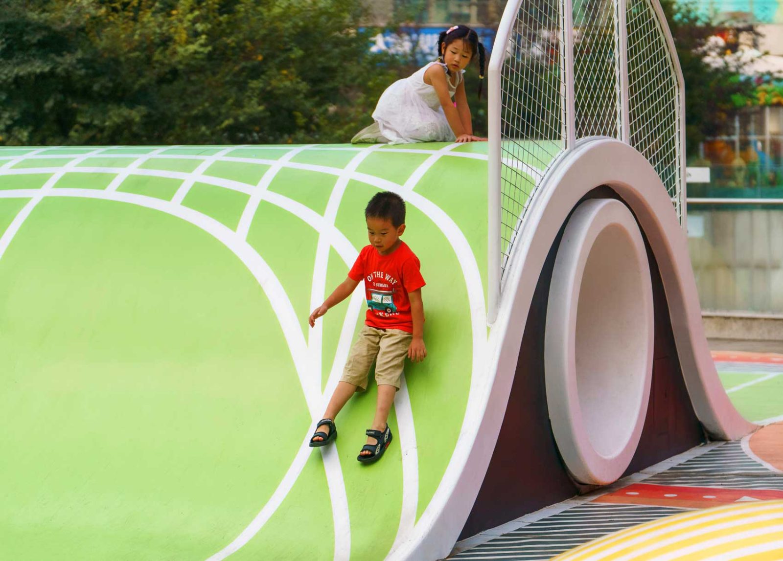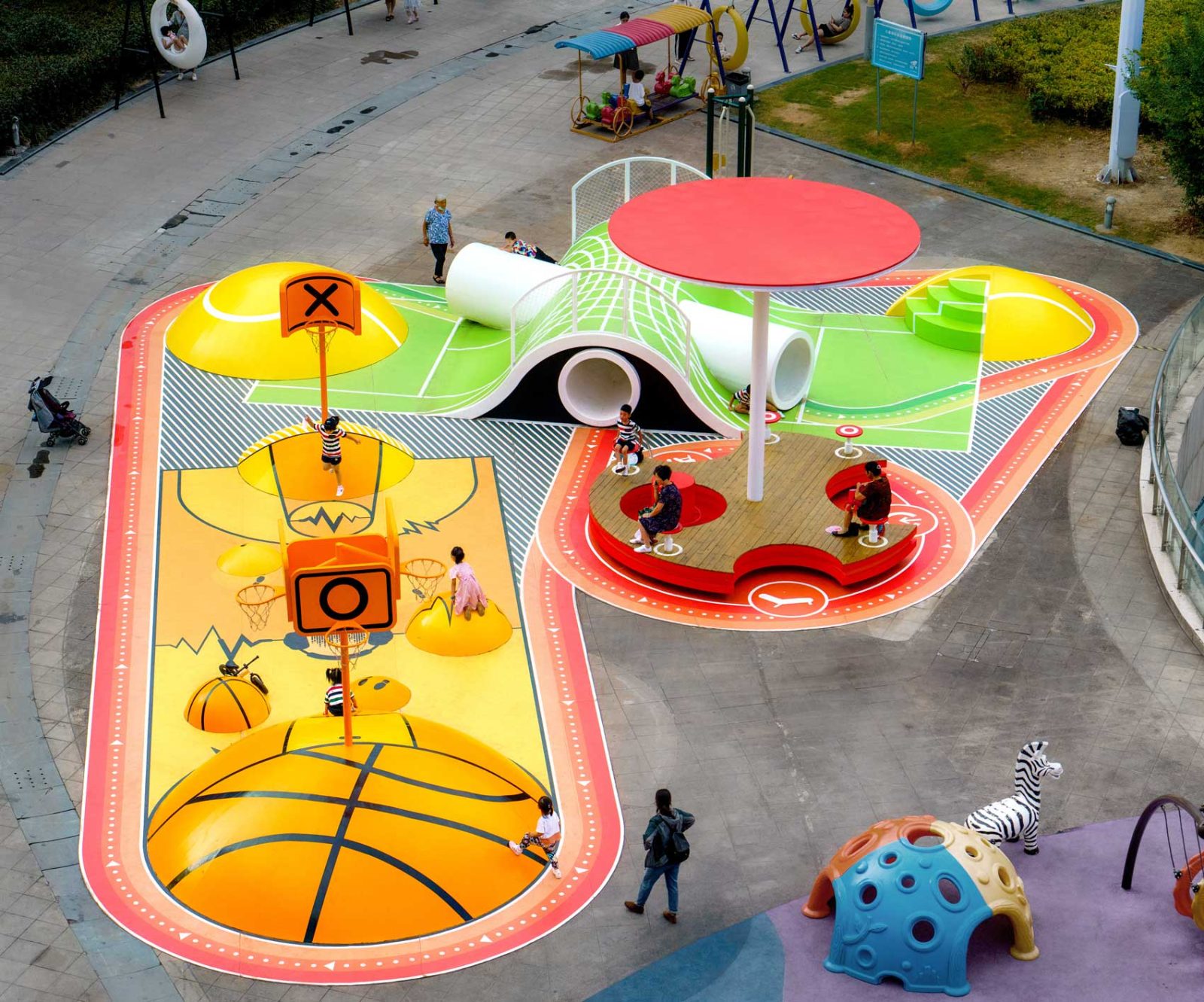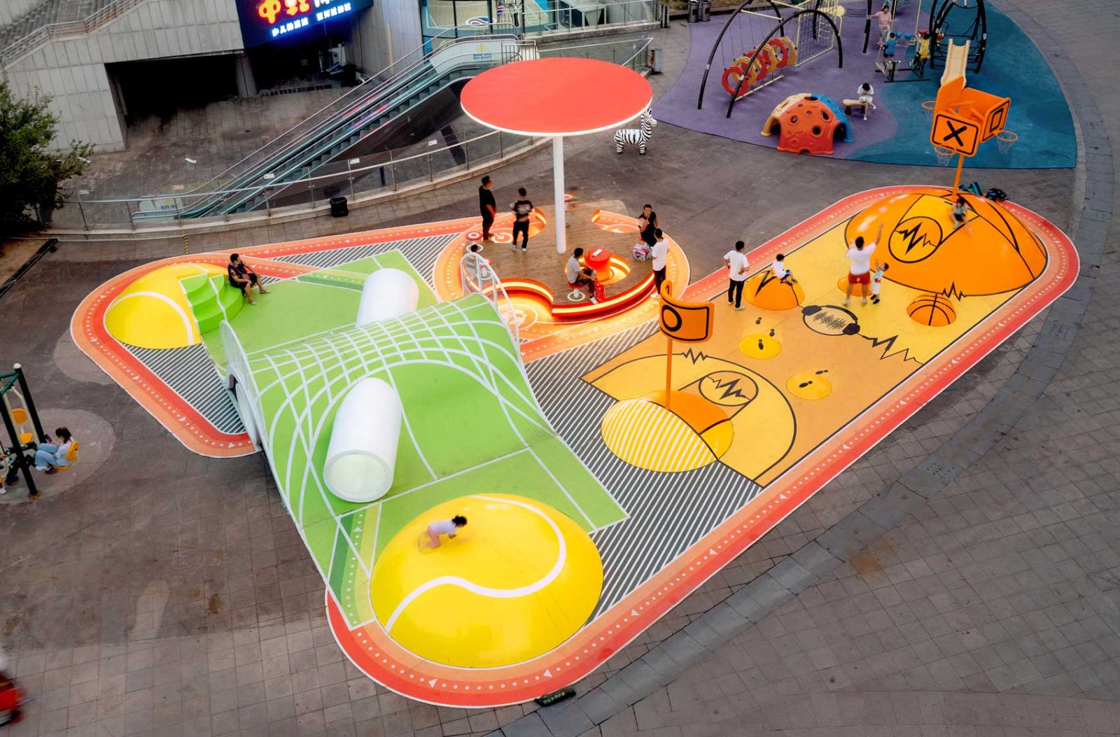 Those surreal sports fields are linked together by a running track, providing play opportunities for kids, as well as resting opportunities on an innovative “bitten” wooden deck that acts as public furniture and meeting point for adults and other social groups, fostering social interactions within the installation.