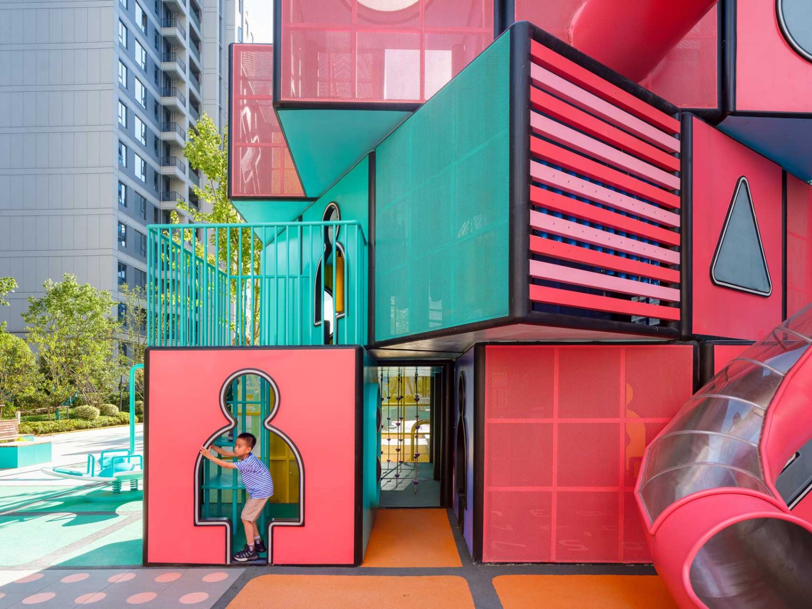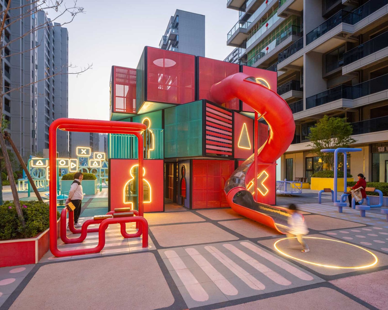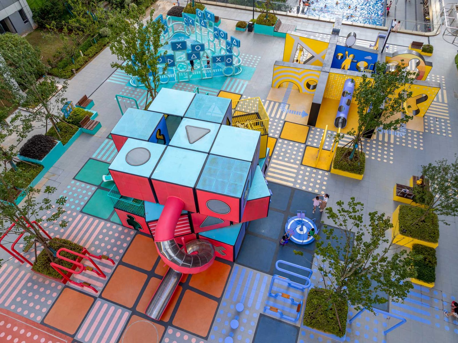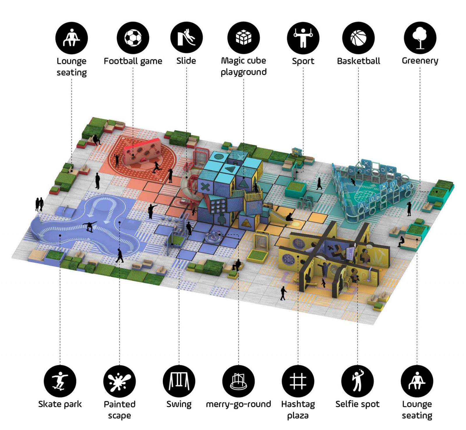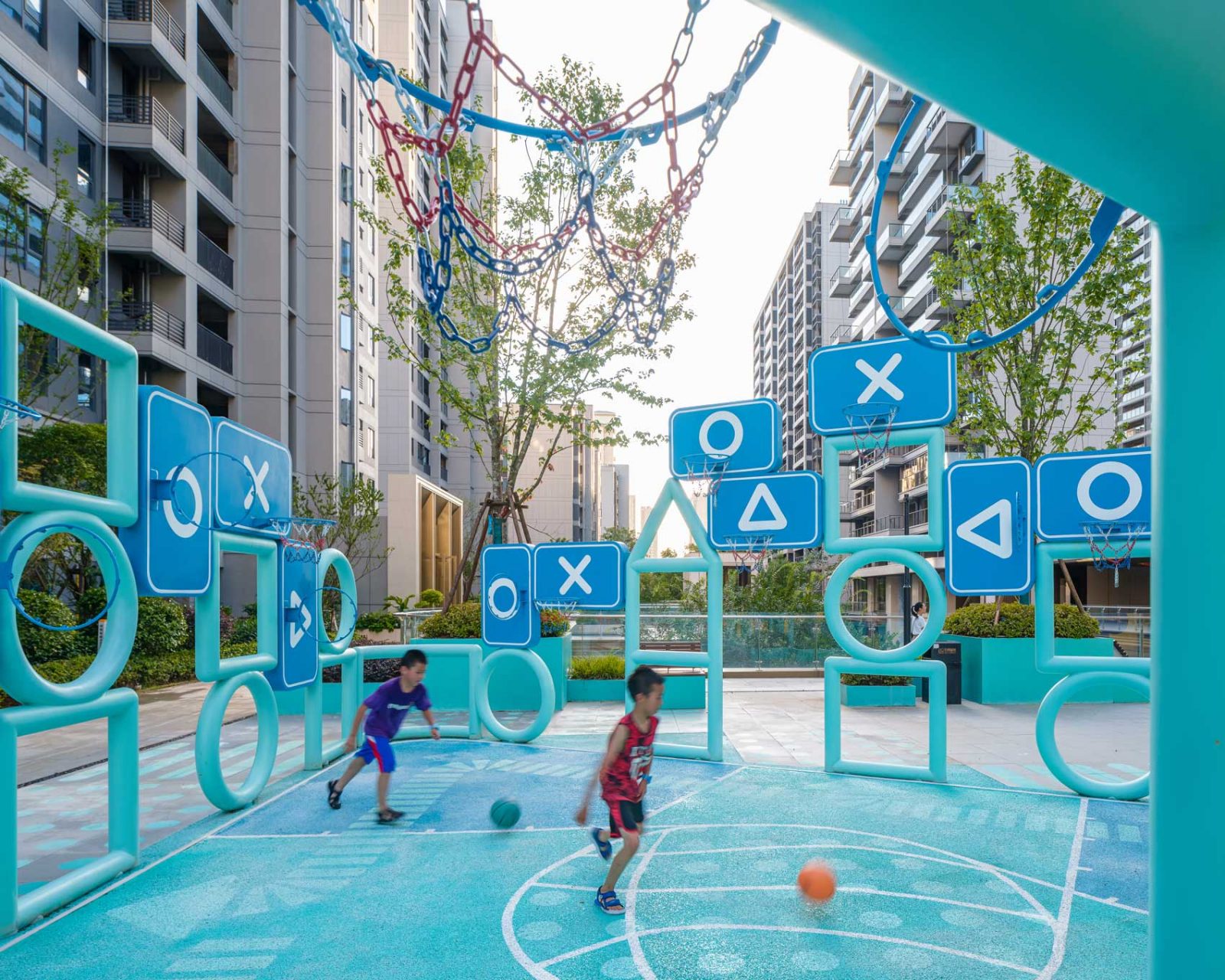 Rubix Square is a hyper-stimulating public space located in Fuzhou, China, nestled within a residential area and surrounded by residential buildings. The project is composed of five distinct installations, each inspired by a sport or specific activity, designed to engage visitors in a unique and playful environment.