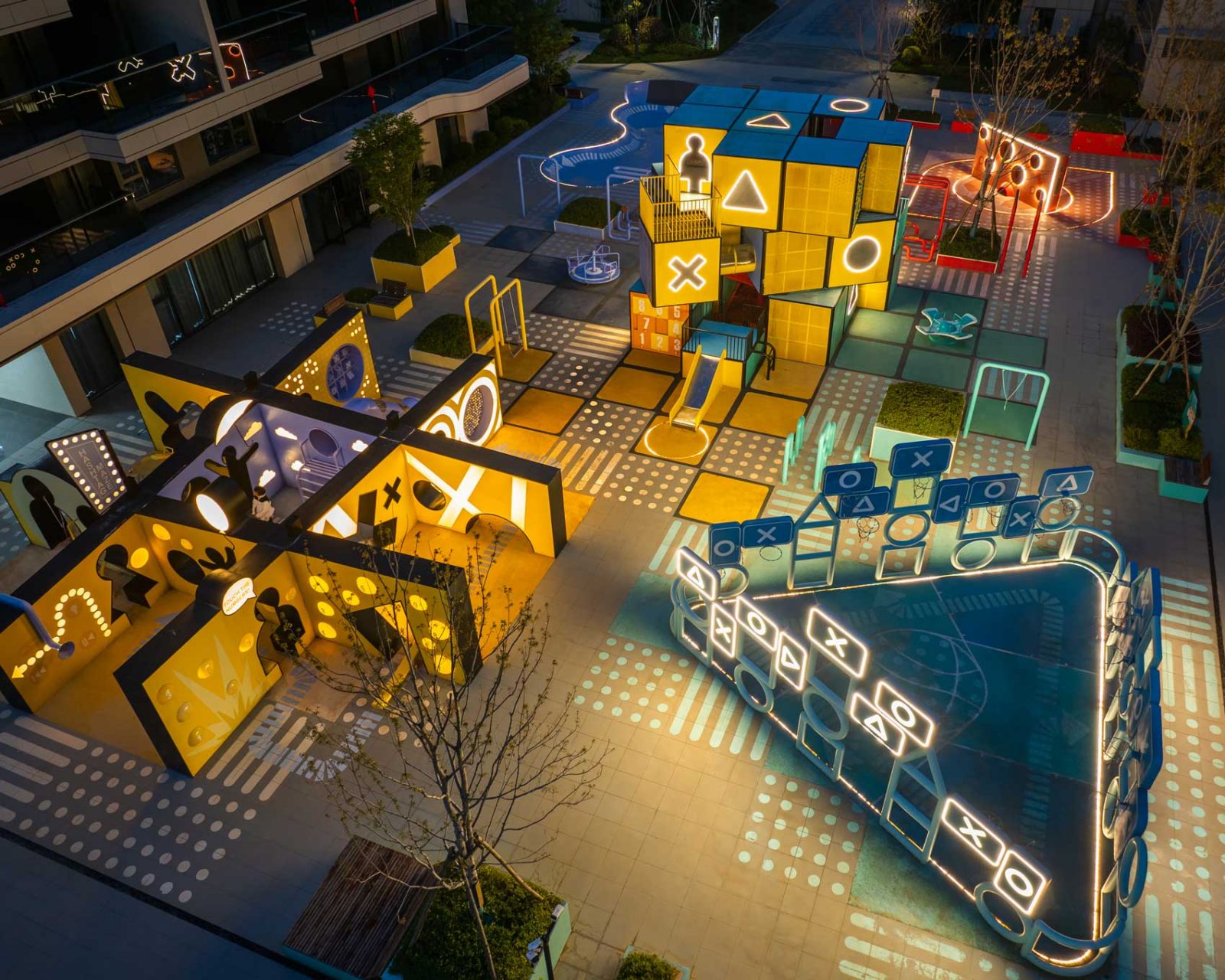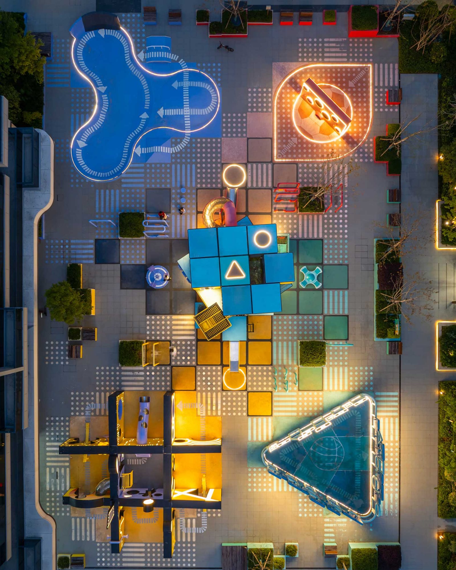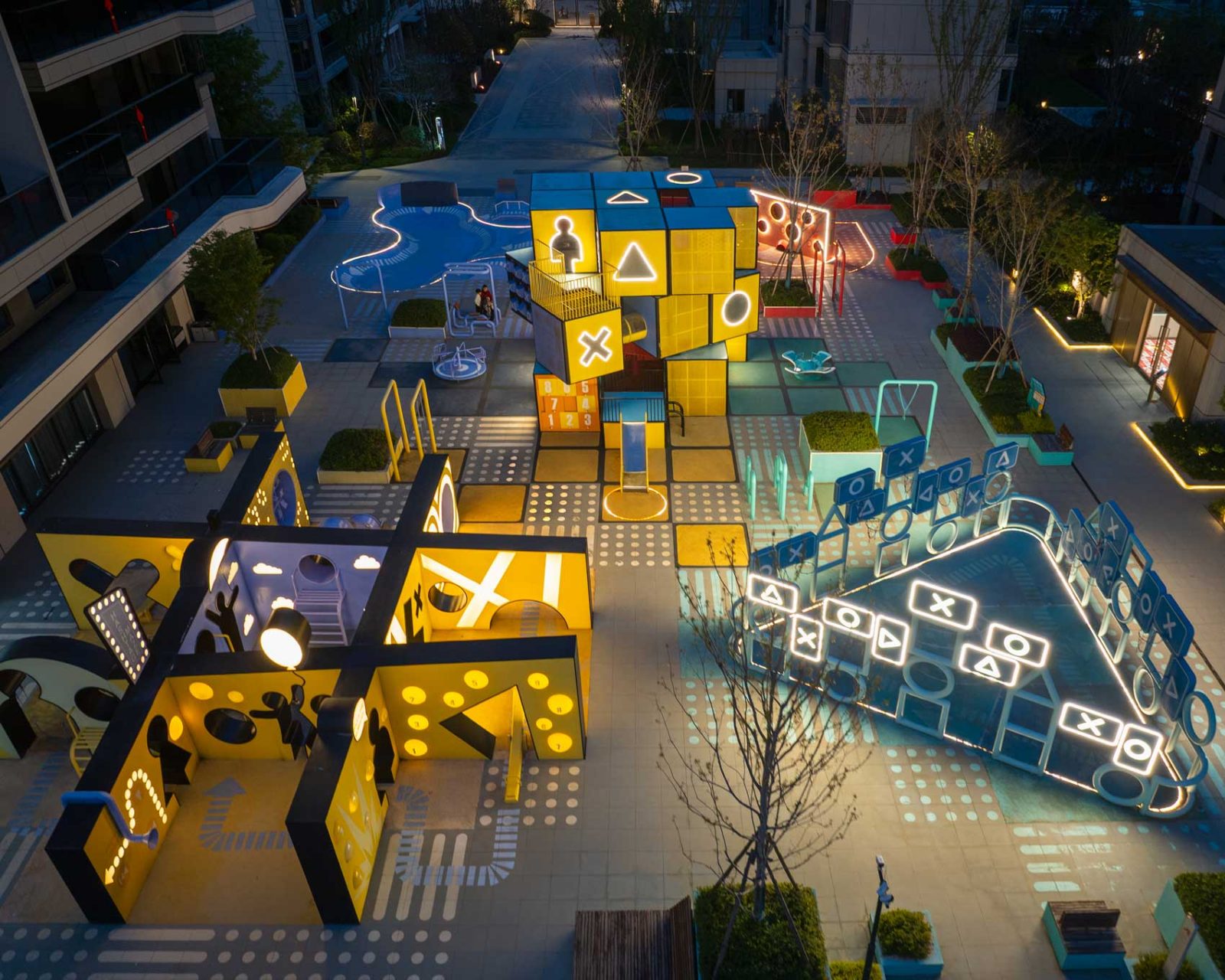 As daylight fades, the entire playscape shifts into a surreal, glowing environment. Embedded lighting outlines the geometry of each installation, transforming the square into a luminous dreamworld that feels lifted from a digital fantasy.