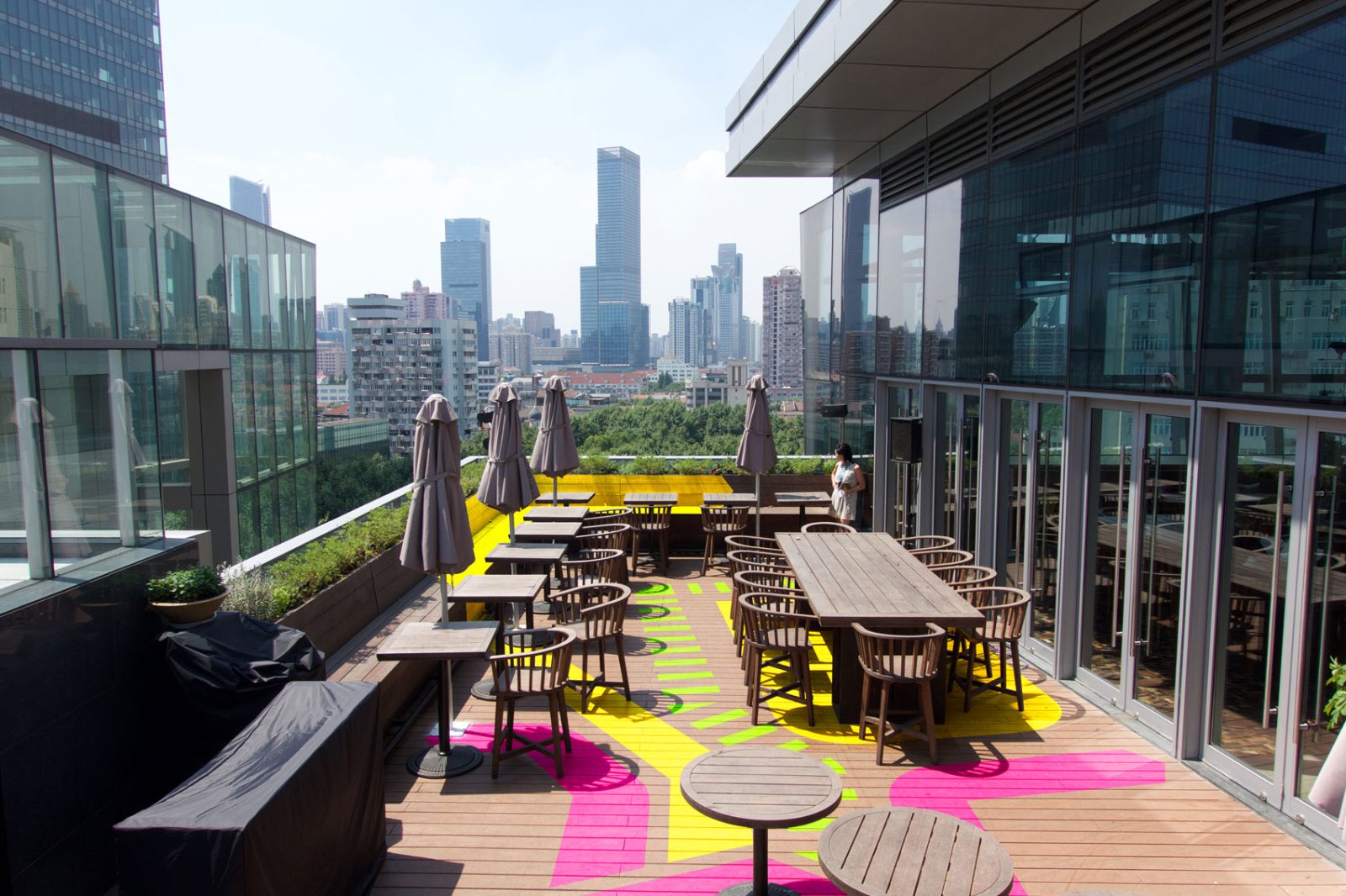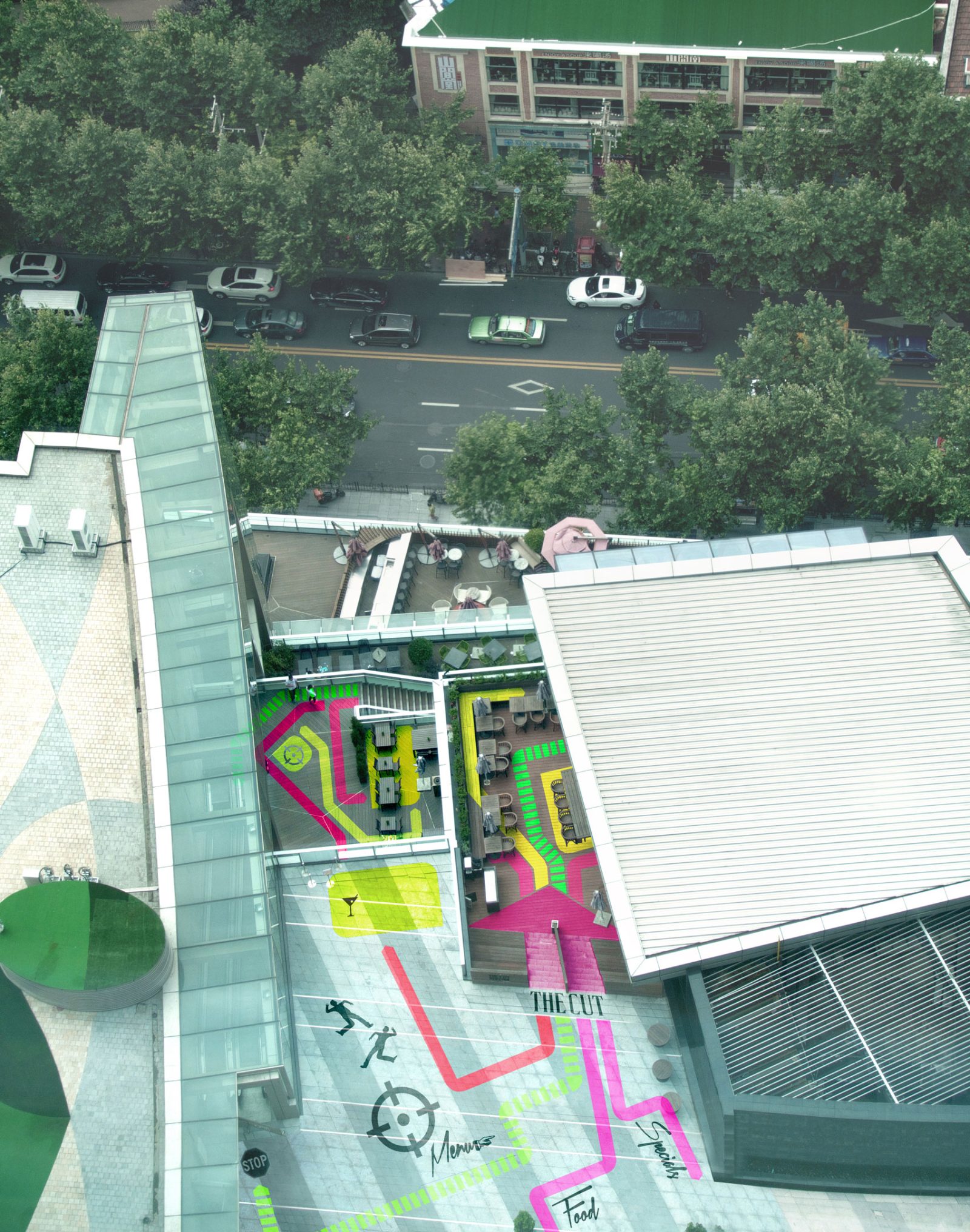 Using painted landscapes as architectural catalysts involved using paint or coatings to partially cover intervention areas. This approach influenced the conception and usage of space, adding personality to it. Take The Cut, for example. The restaurant is located within a renowned complex in Shanghai, which includes a large shopping center called IAPM, featuring an extended semi-public terrace facing Huaihai Road. At the top of the podium are two office towers.