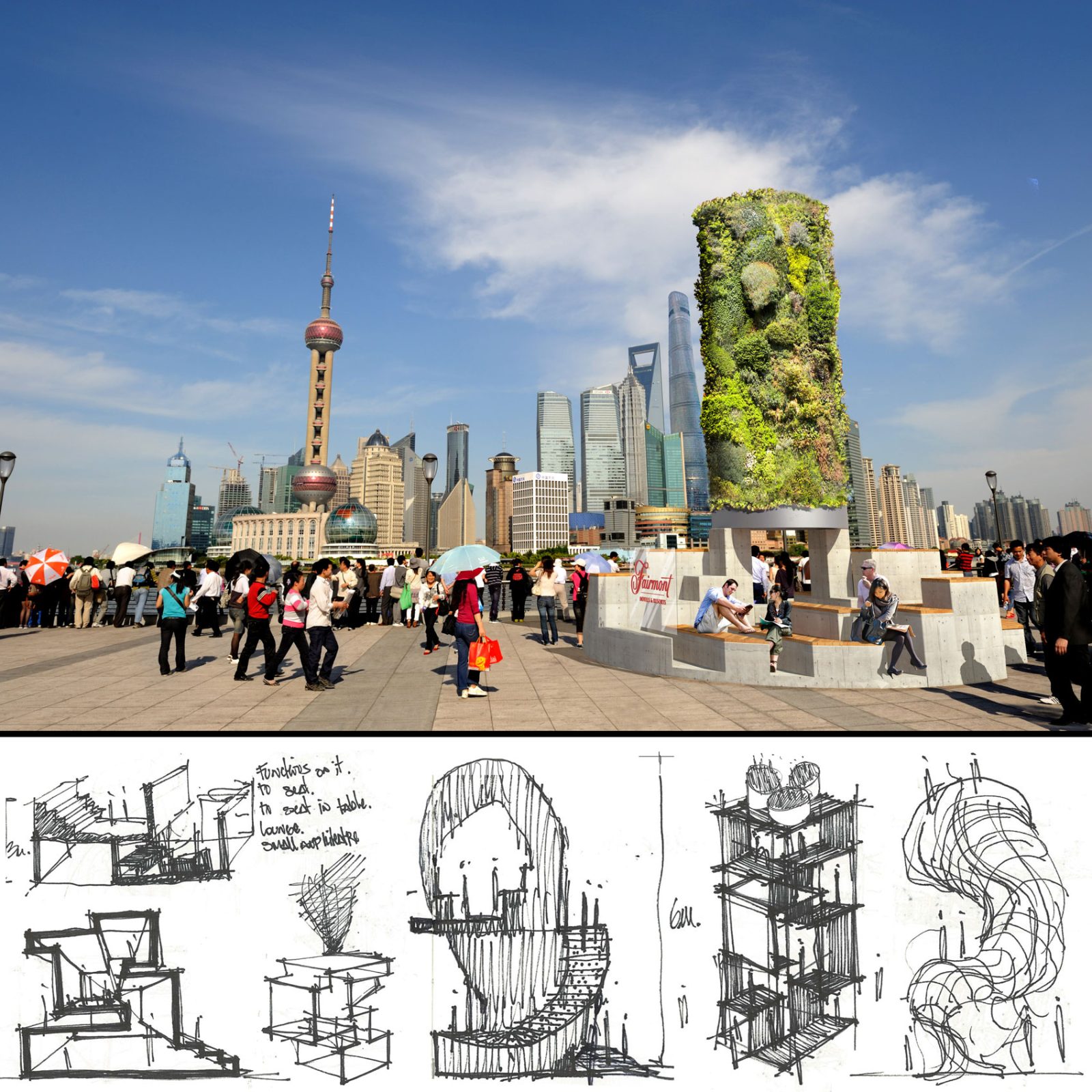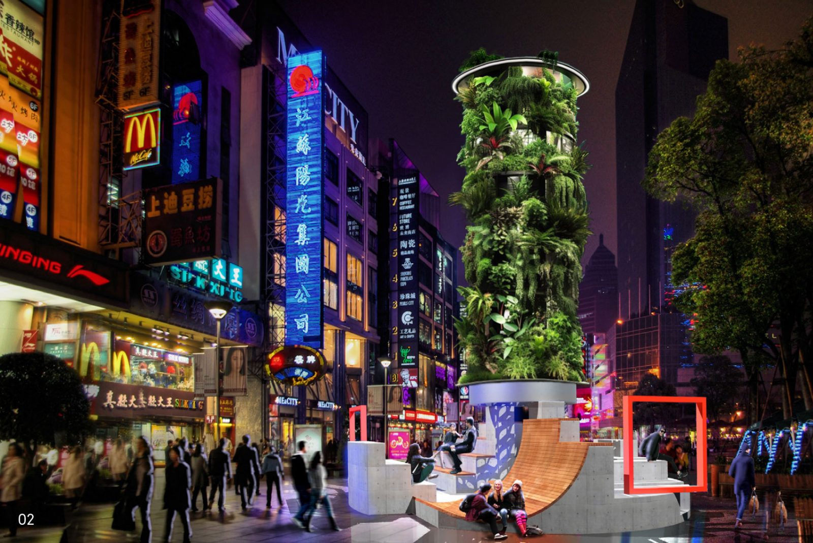 Above the object-plaza rests the cylindrical green lung, a vertical structure standing 6 meters tall, extending the total height to 8.4 meters. This green cylinder serves as a vertical wall, creating a refreshing and unconventional space that acts as a natural absorber of smog, particles, and other pollutants commonly found in polluted cities.