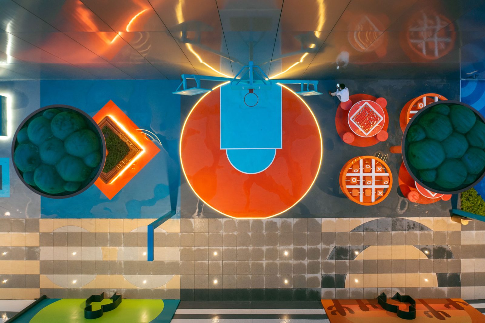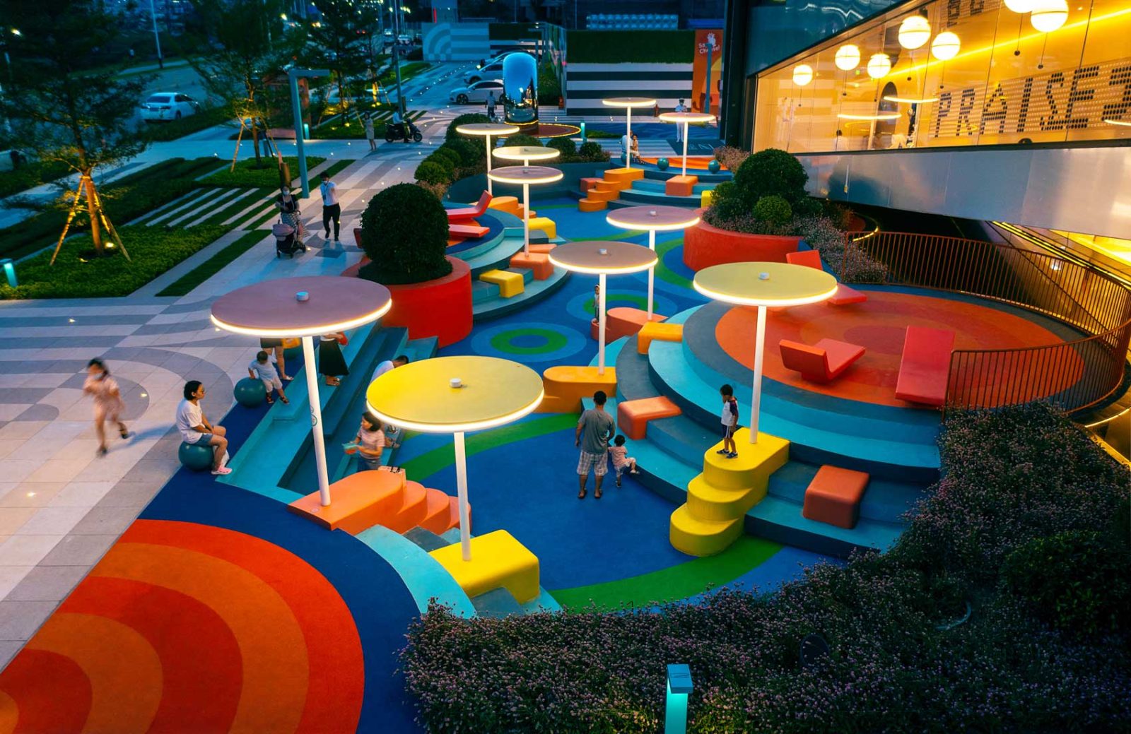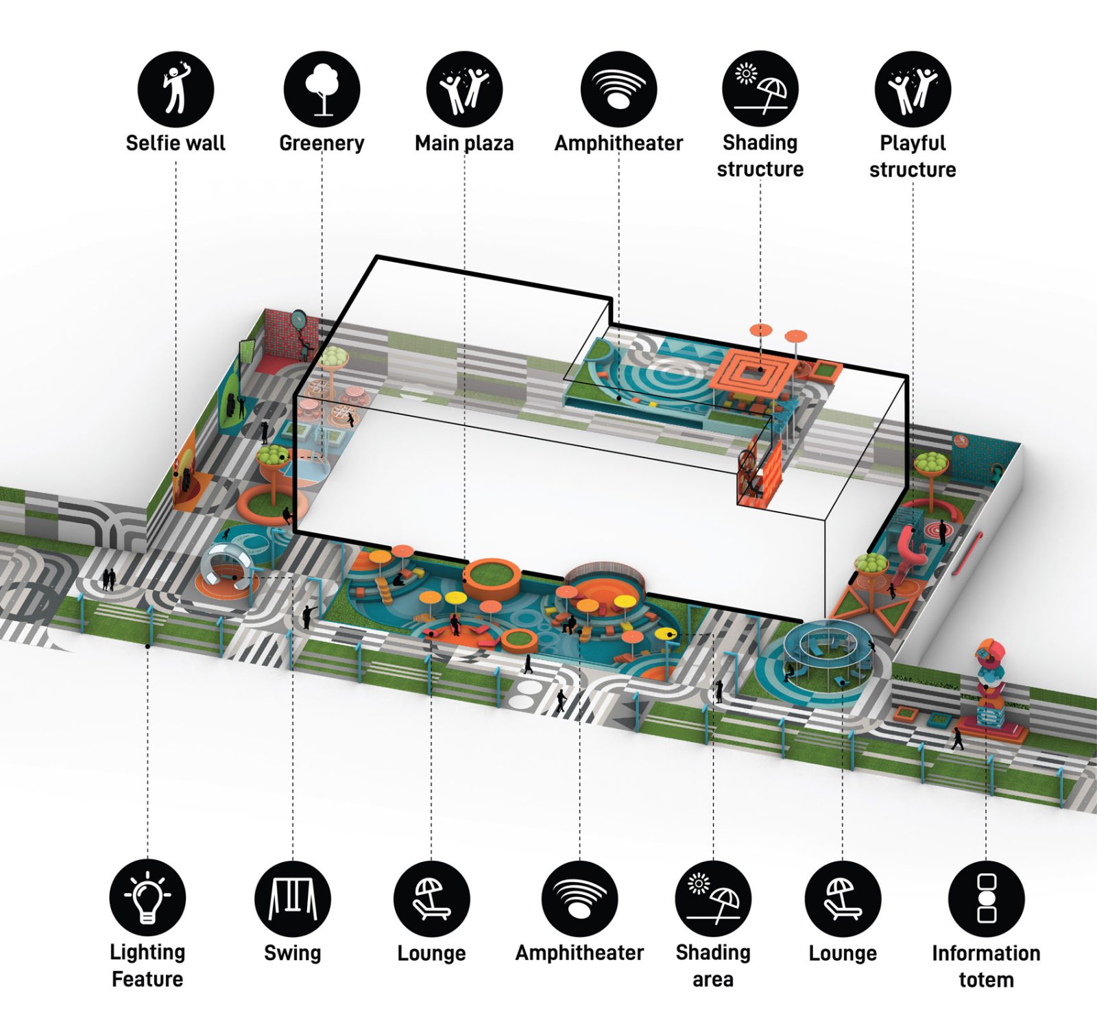 Urban Ripple is equipped with several sitting features, amphitheaters for gathering or public performances, lounge areas, stools & tables under canopies to rest under shadows, as well as playful and interactive features, offering joyful and entertainment spaces for all kind of age groups.