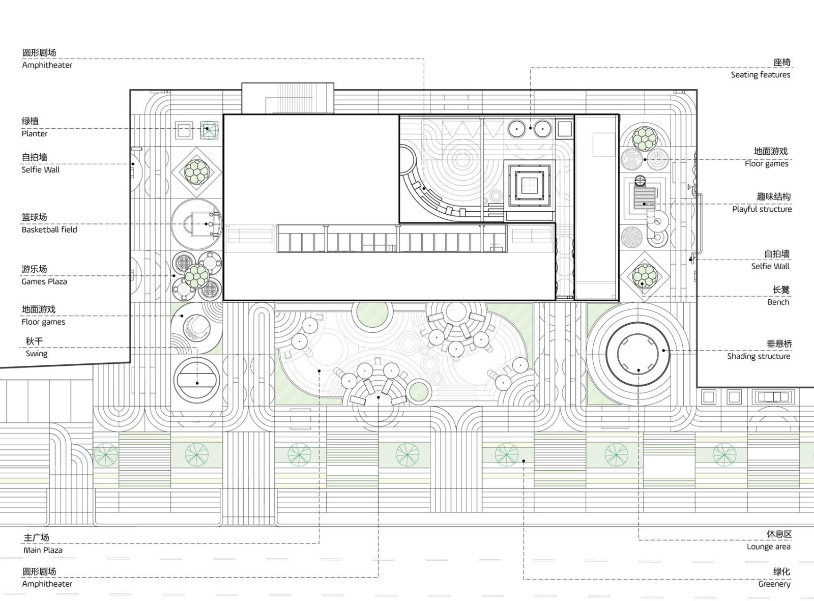 The project is inspired by the famous Zhujiang River (Pearl River), one of the most important and proud icons of Guangzhou, which also gives name to the client’s company. It features a simple yet striking combinative system of geometrized water ripples, where the main public functions for social interaction are placed, and striped urban corridors resembling the flow of the river while suggesting and encouraging pedestrian circulation.