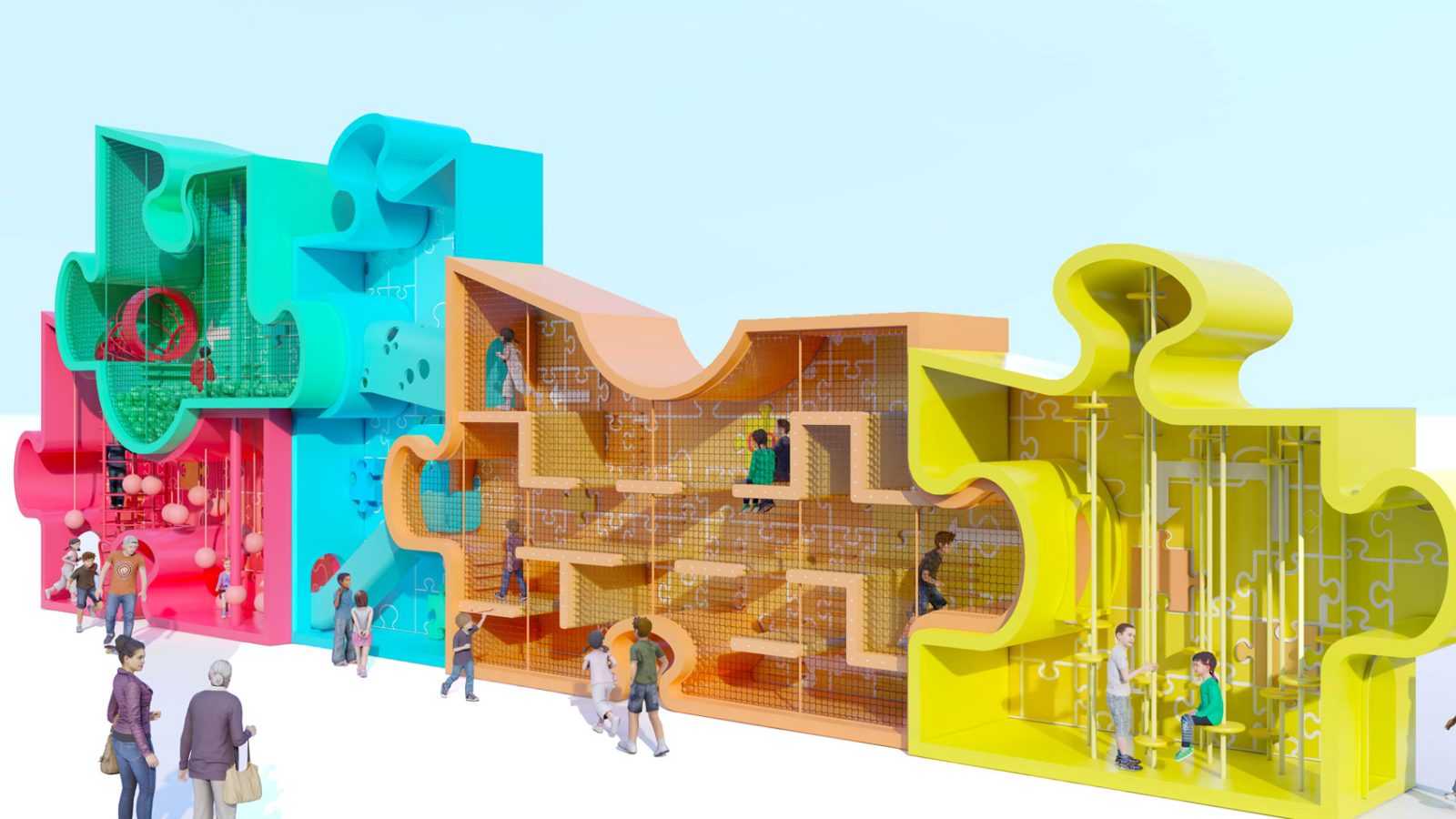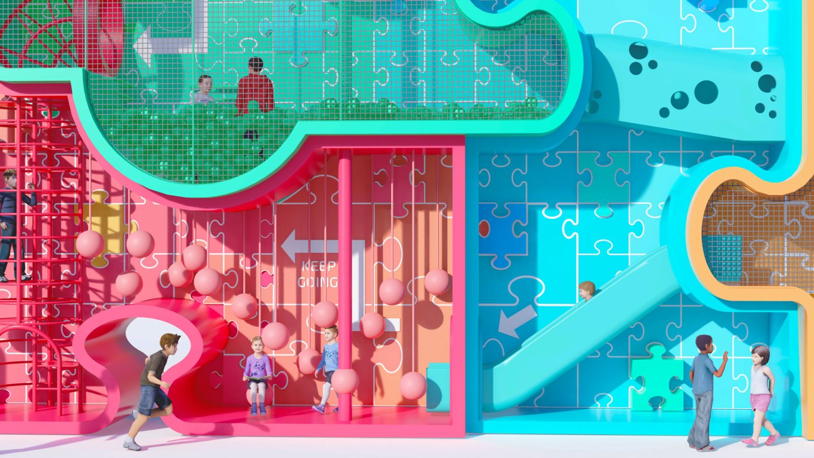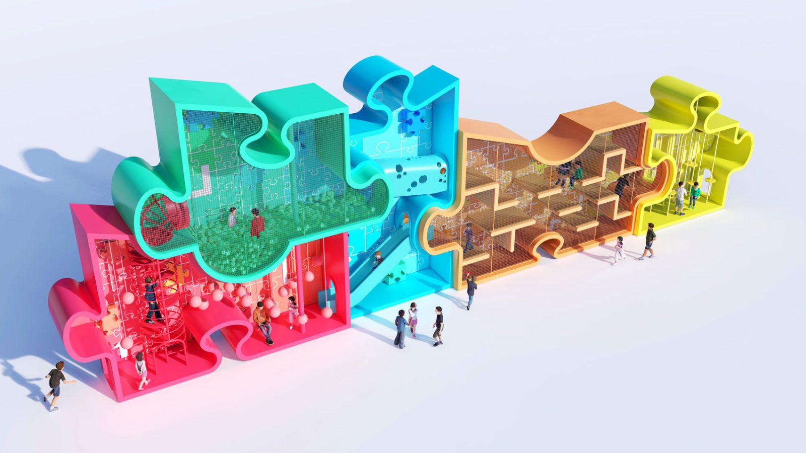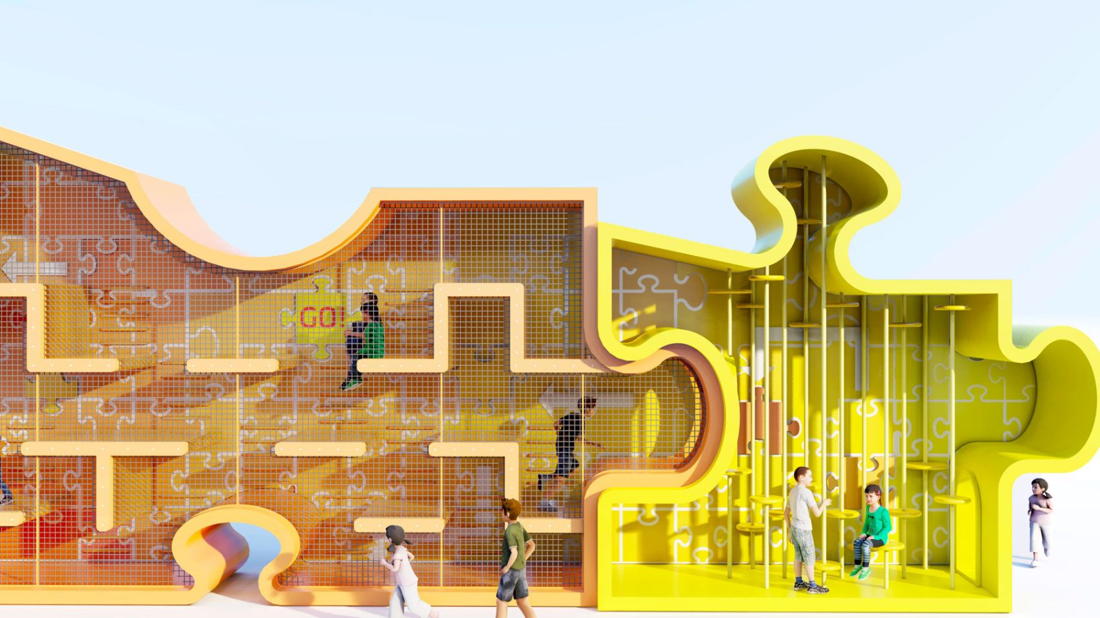 天天向上共由5个代表不同功能和活动的拼图造型结构嵌套而成。主要的活动功能包括:迷宫,海洋球池,秋千球,攀爬平台与滑梯。