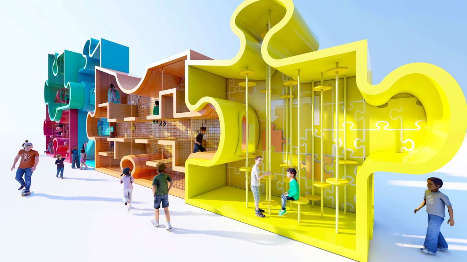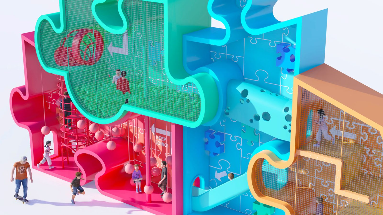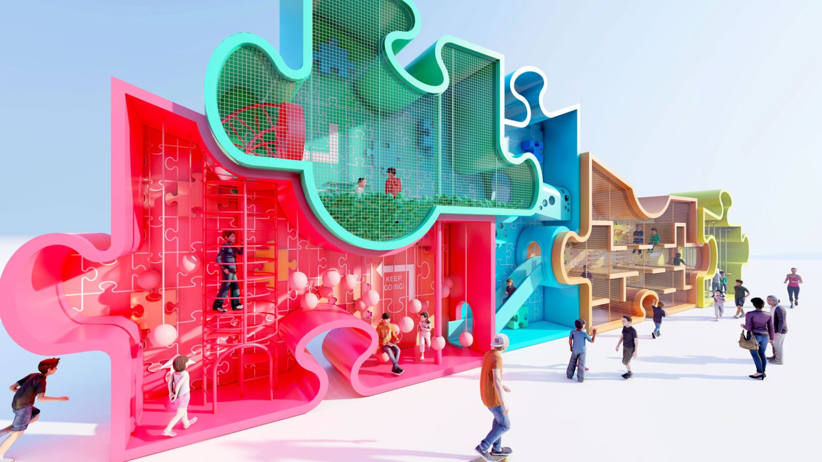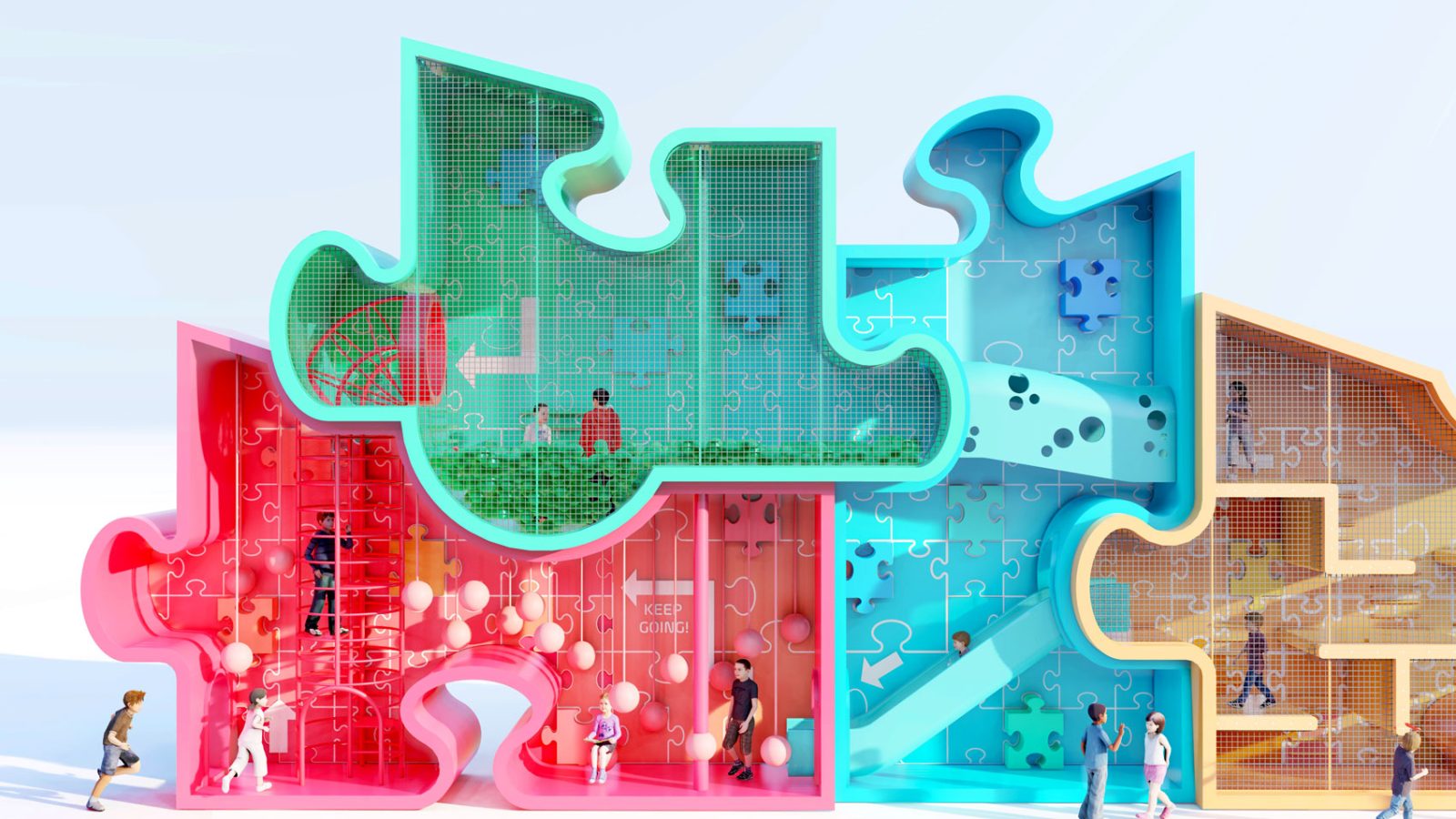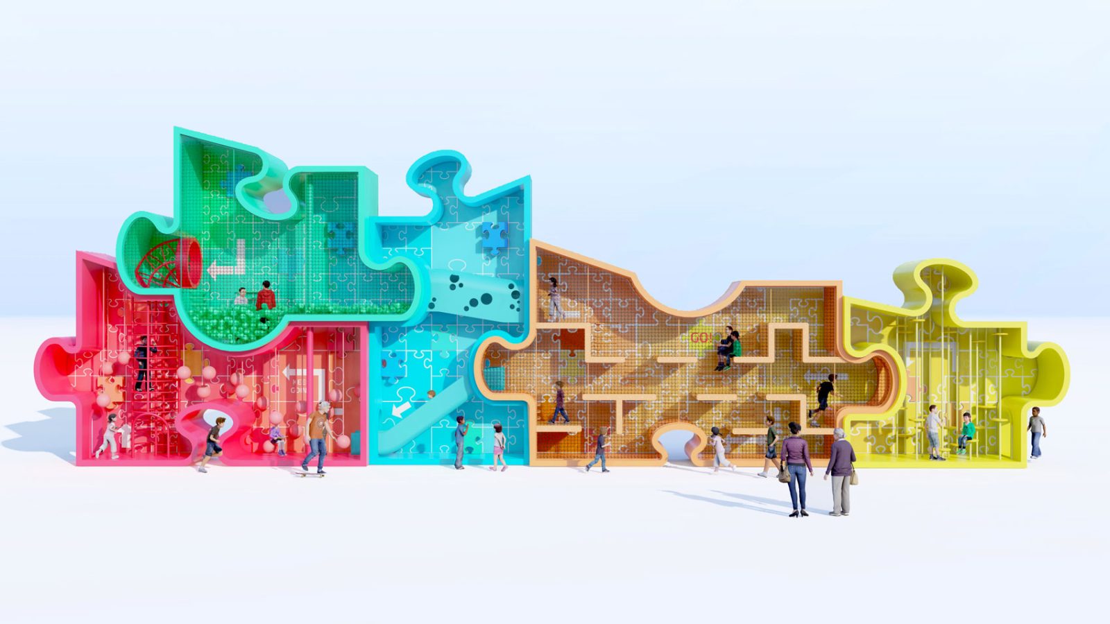 天天向上共由5个代表不同功能和活动的拼图造型结构嵌套而成。主要的活动功能包括:迷宫,海洋球池,秋千球,攀爬平台与滑梯。