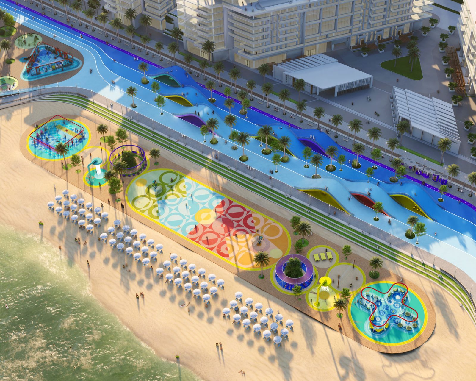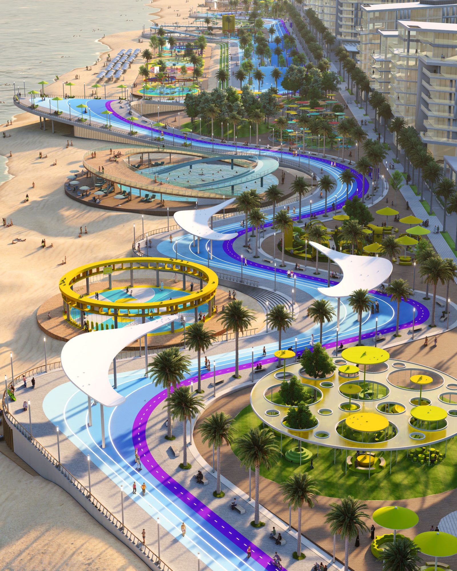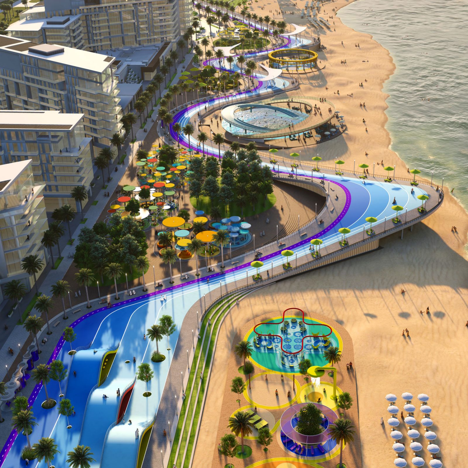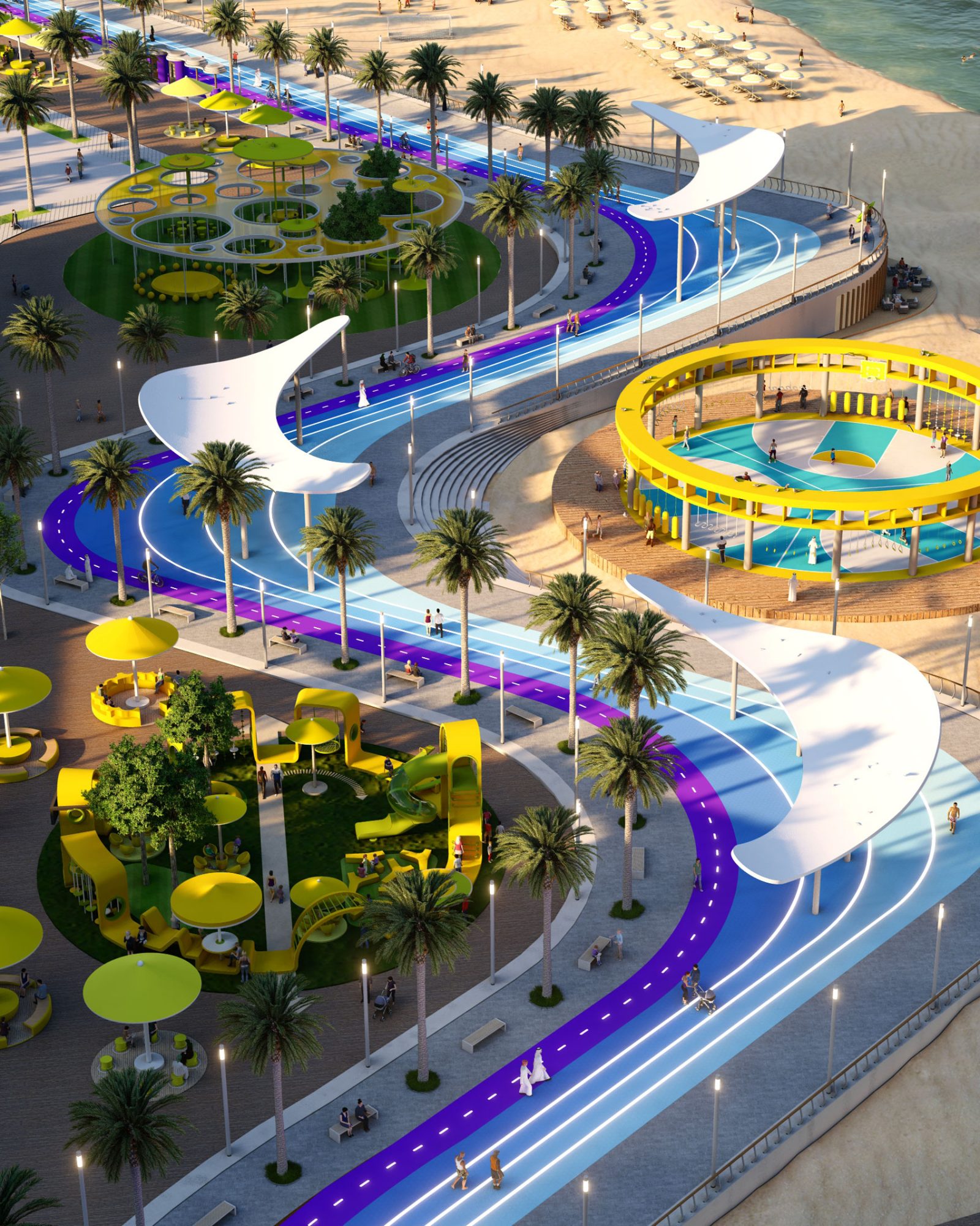 该项目经过精心策划,被巧妙地划分为多个各具特色的区域,旨在满足不同人群的兴趣爱好。活力四射的海滩区专为年轻人量身打造,提供丰富的体育设施、攀岩墙以及户外活动的社交空间。继续前行,水上运动区则为家庭和孩子们带来既有趣又放松的绝佳体验,这里设有水上活动、泳池和游乐场。而在海滨长廊的尽头,码头成为了兴奋与欢乐的汇聚地,设有观景台、日光浴露台以及宽广的活动区,非常适合举办大型活动和表演,其背景则是萨迪亚特岛上标志性的文化地标,如古根海姆博物馆和扎耶德国家博物馆。