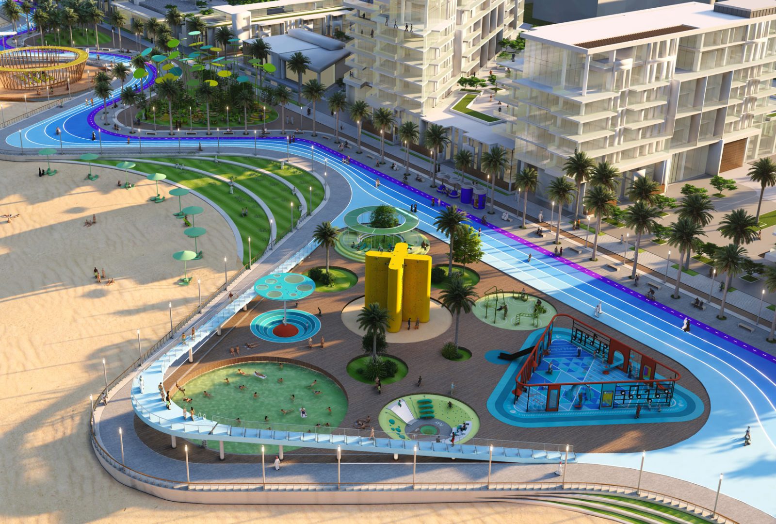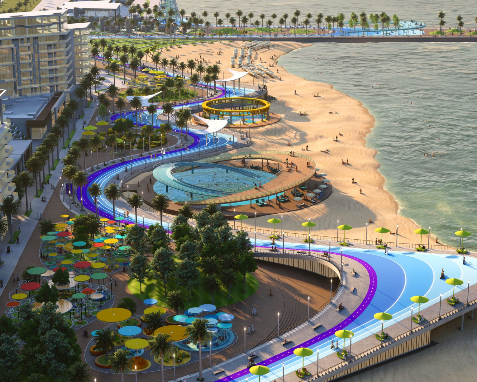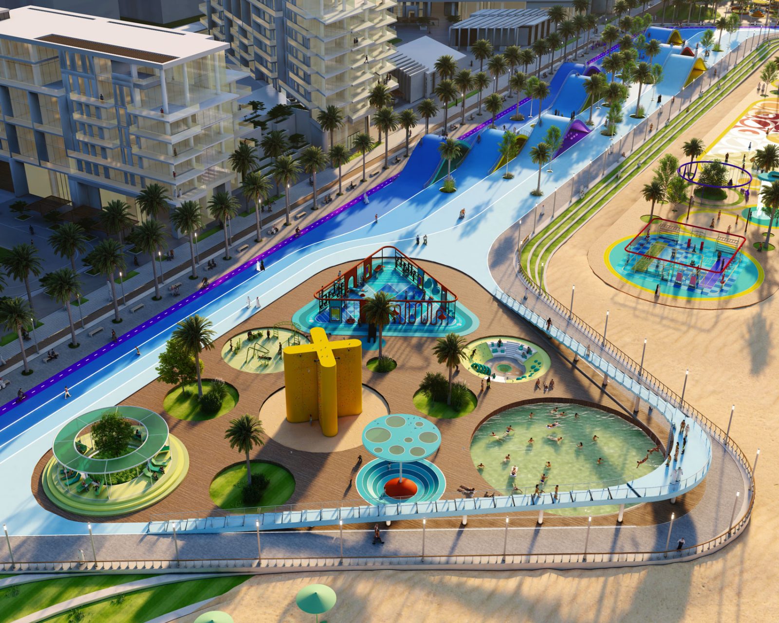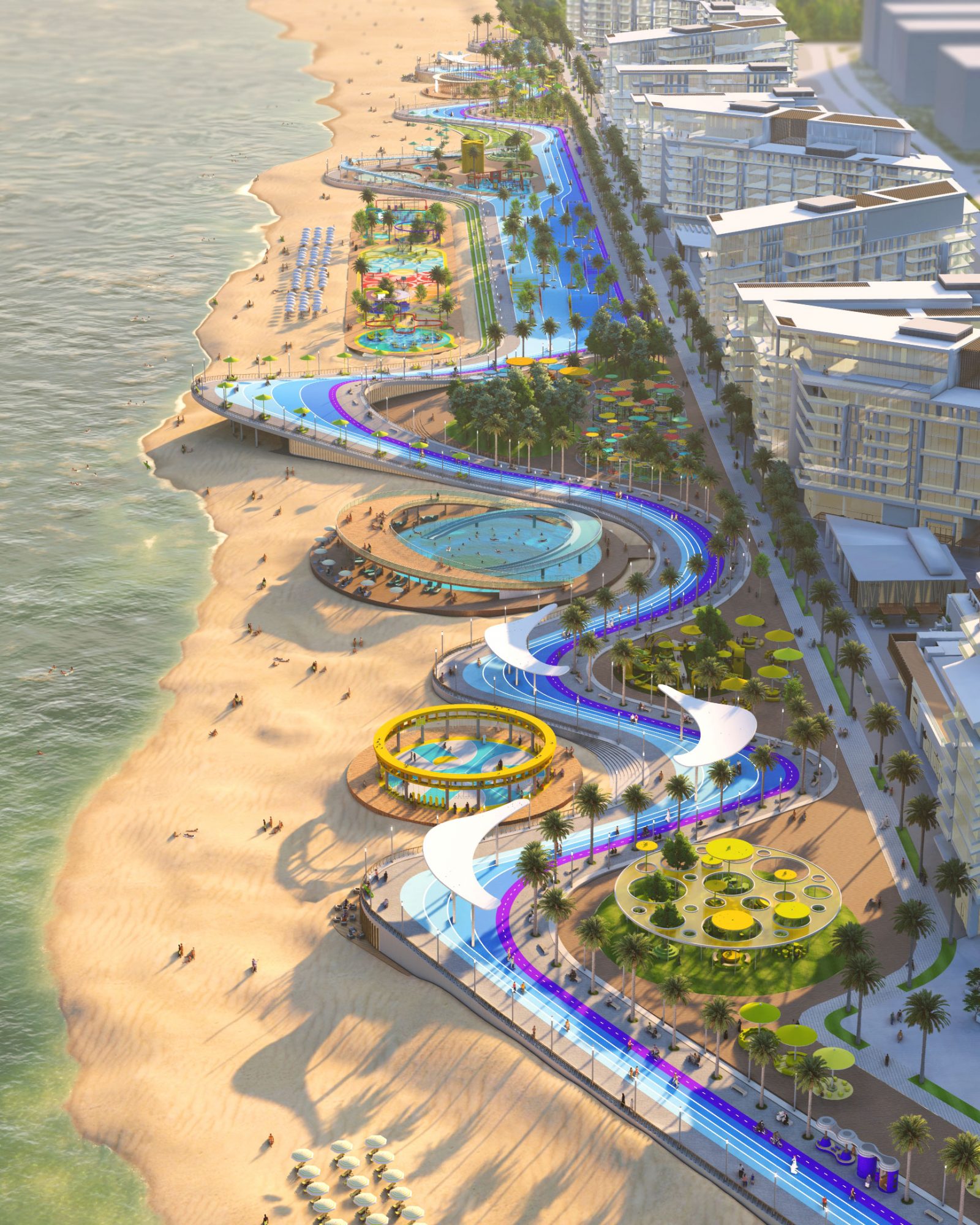 该项目经过精心策划,被巧妙地划分为多个各具特色的区域,旨在满足不同人群的兴趣爱好。活力四射的海滩区专为年轻人量身打造,提供丰富的体育设施、攀岩墙以及户外活动的社交空间。继续前行,水上运动区则为家庭和孩子们带来既有趣又放松的绝佳体验,这里设有水上活动、泳池和游乐场。而在海滨长廊的尽头,码头成为了兴奋与欢乐的汇聚地,设有观景台、日光浴露台以及宽广的活动区,非常适合举办大型活动和表演,其背景则是萨迪亚特岛上标志性的文化地标,如古根海姆博物馆和扎耶德国家博物馆。