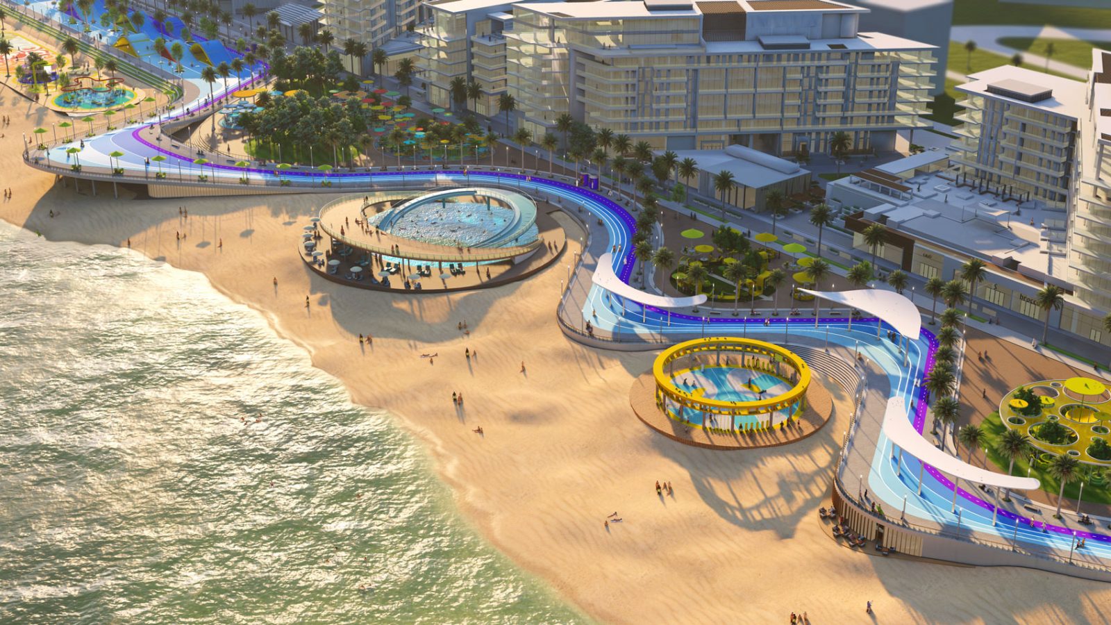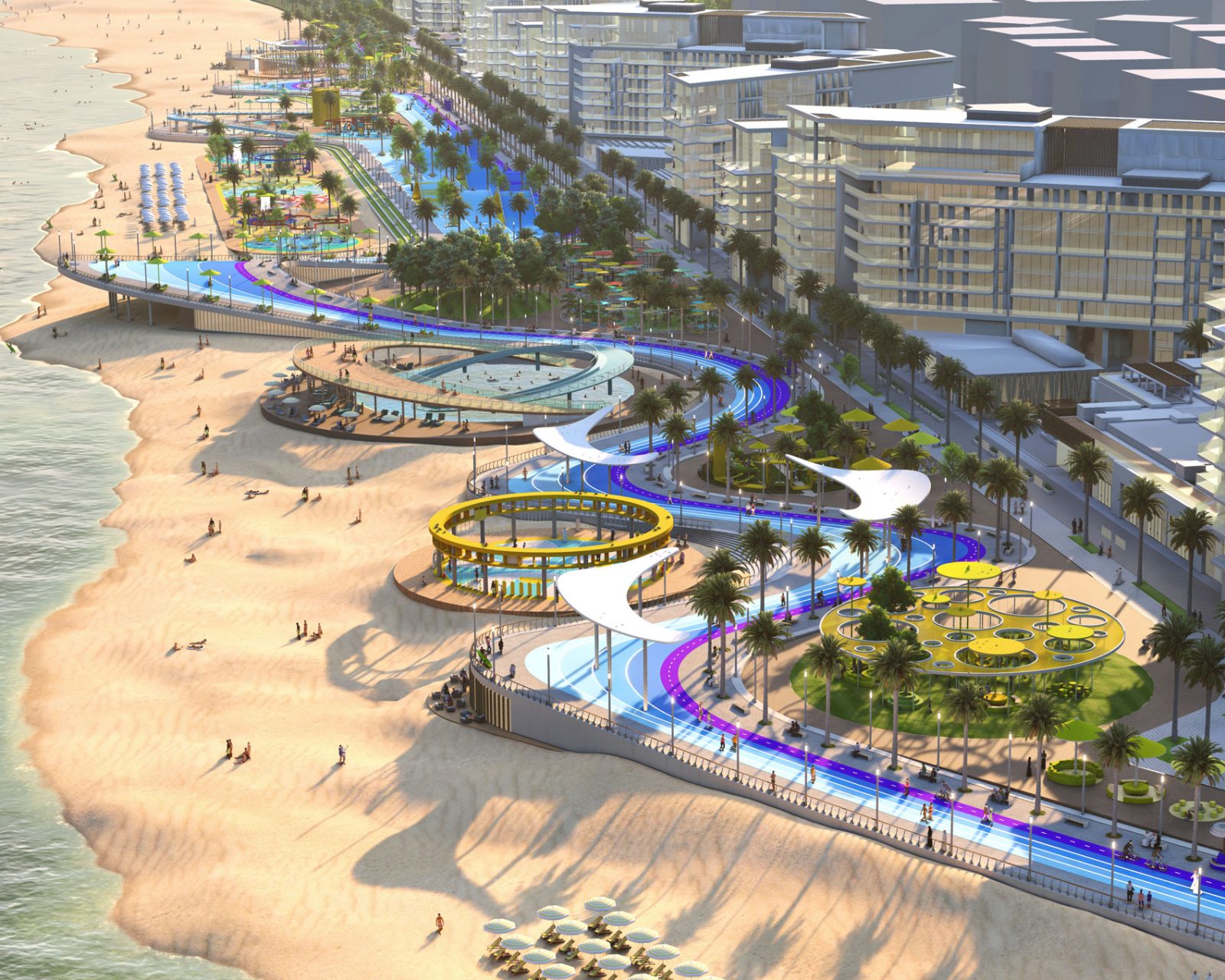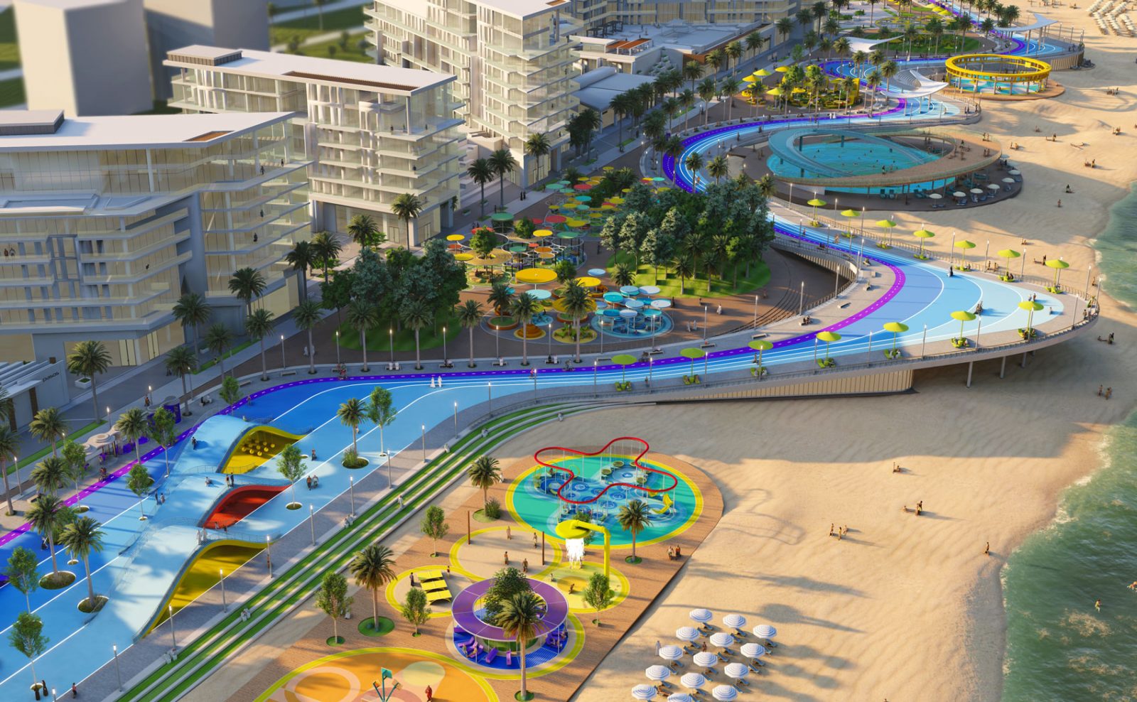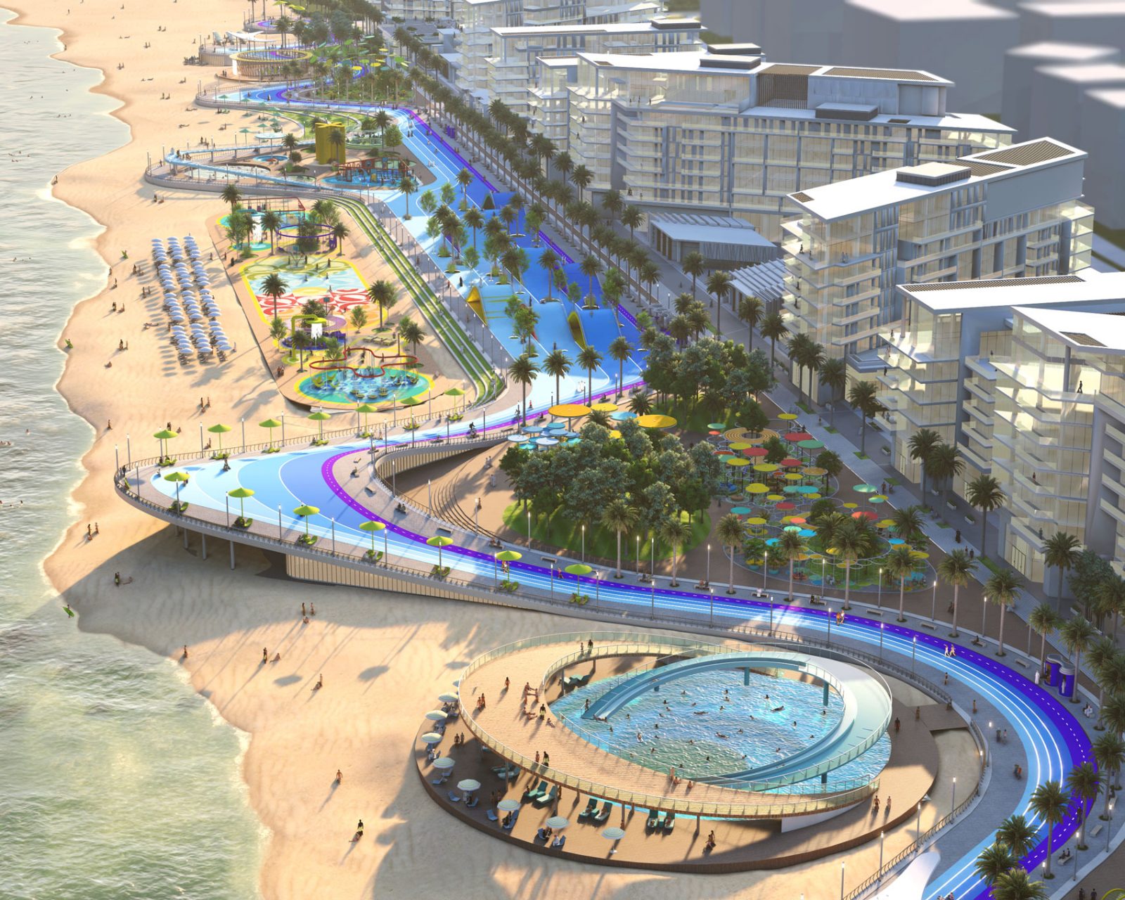 该项目经过精心策划,被巧妙地划分为多个各具特色的区域,旨在满足不同人群的兴趣爱好。活力四射的海滩区专为年轻人量身打造,提供丰富的体育设施、攀岩墙以及户外活动的社交空间。继续前行,水上运动区则为家庭和孩子们带来既有趣又放松的绝佳体验,这里设有水上活动、泳池和游乐场。而在海滨长廊的尽头,码头成为了兴奋与欢乐的汇聚地,设有观景台、日光浴露台以及宽广的活动区,非常适合举办大型活动和表演,其背景则是萨迪亚特岛上标志性的文化地标,如古根海姆博物馆和扎耶德国家博物馆。