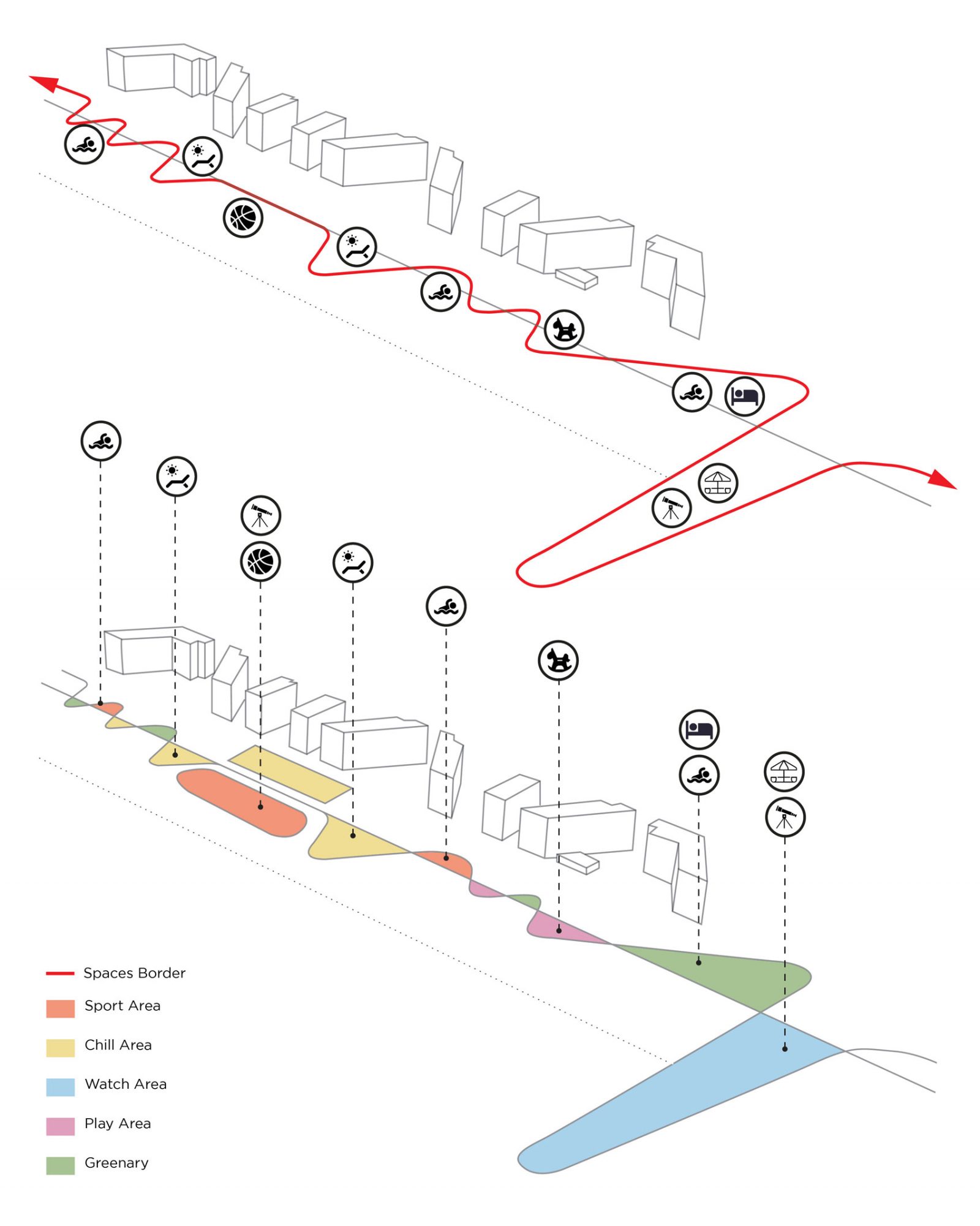 在蓝潮涌动的设计中,我们摒弃了传统的中心景点概念,而是将丰富多彩的活动巧妙地分散在整个海滨步道之上。这一创新策略使得空间焕发出全新的生命力,成为了一个规模宏大、互动性极强的城市体验场所。我们诚挚地邀请游客们尽情探索这片神奇的区域,与各种城市元素亲密互动——无论是休闲惬意的休息区、趣味横生的游乐设施、清凉畅快的公共泳池、舒适宜人的遮阳躺椅区、活力四射的运动场,还是浪漫迷人的露天电影院等,都将成为您难忘的记忆。海滨步道的每一个角落都独具特色,为家庭、儿童以及年轻人营造了一个丰富多彩、身临其境的梦幻世界。