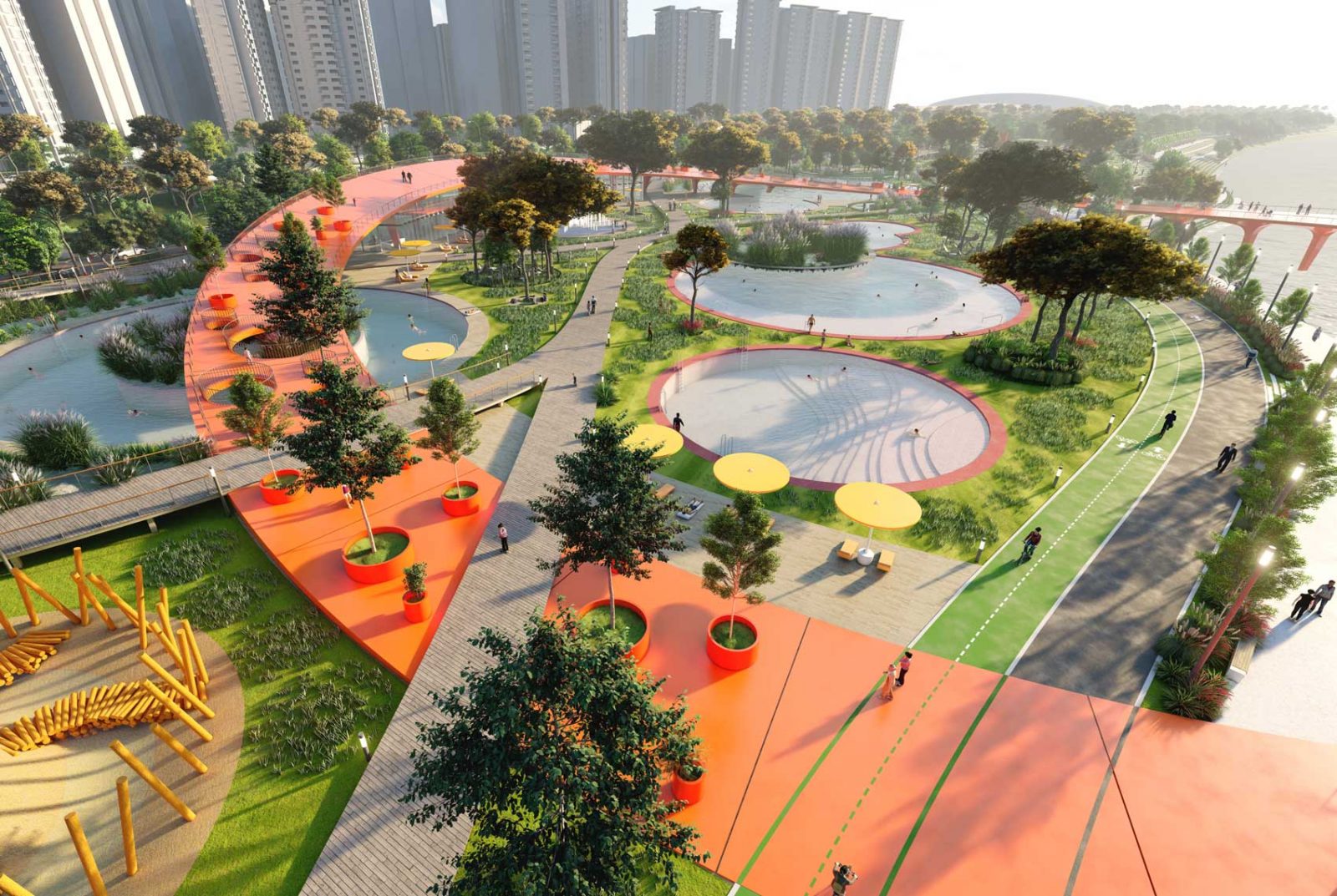 交错起伏的环步道为公园的公共各种活动创造了机会和条件。在自然的环抱中,以多元功能有机组合的方式为公众提供娱乐和休闲空间成为了可能——人与自然完美契合与互动。在这里,承载着可用于各种运动活动、休憩、遮阳和亲近大自然的儿童互动空间,从而创造出了适合所有年龄段的多功能公园。