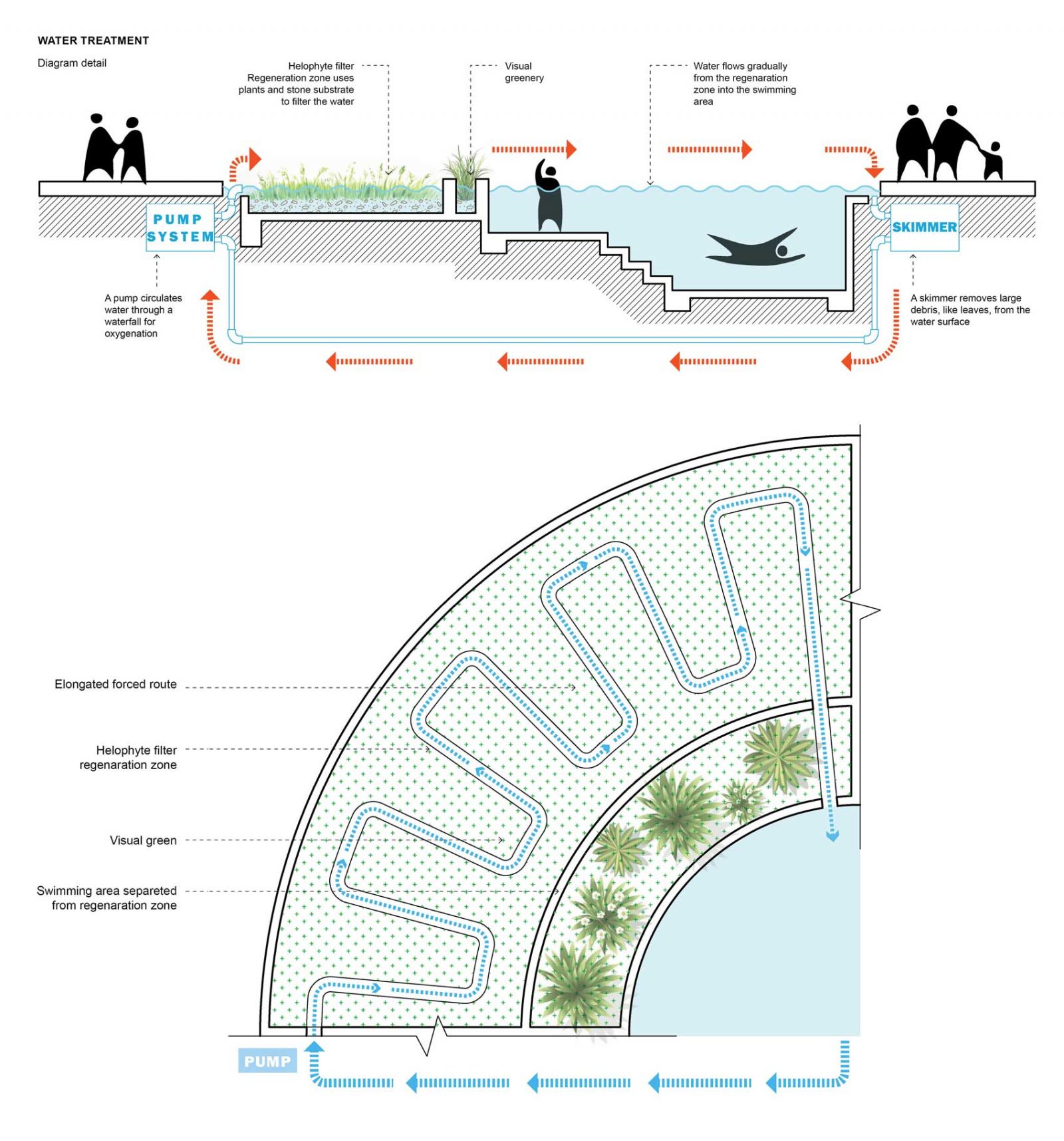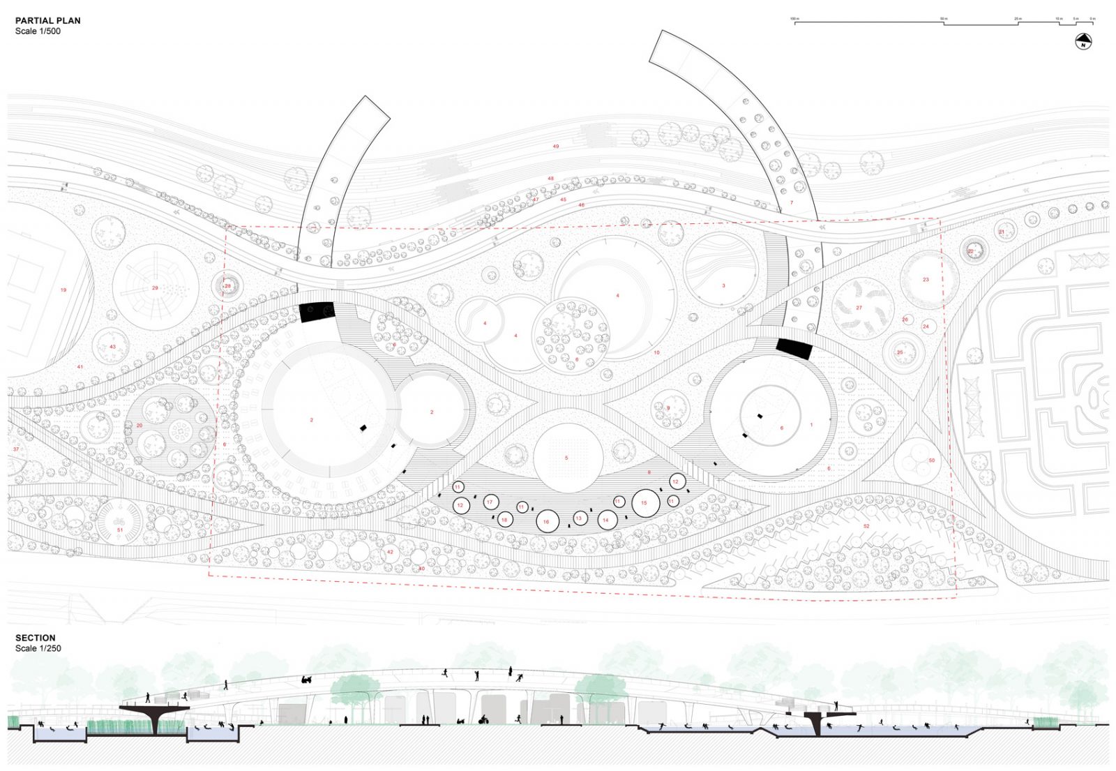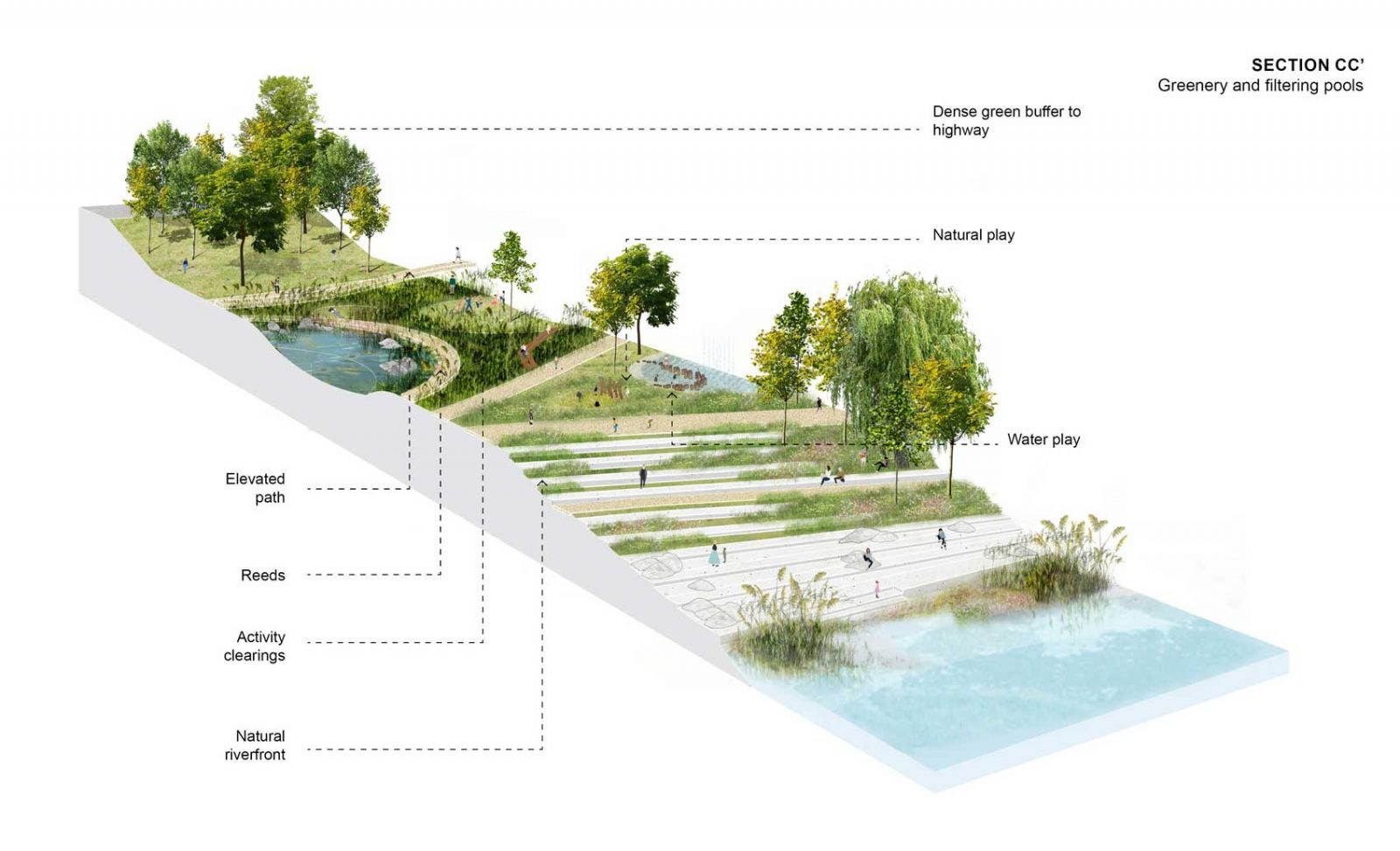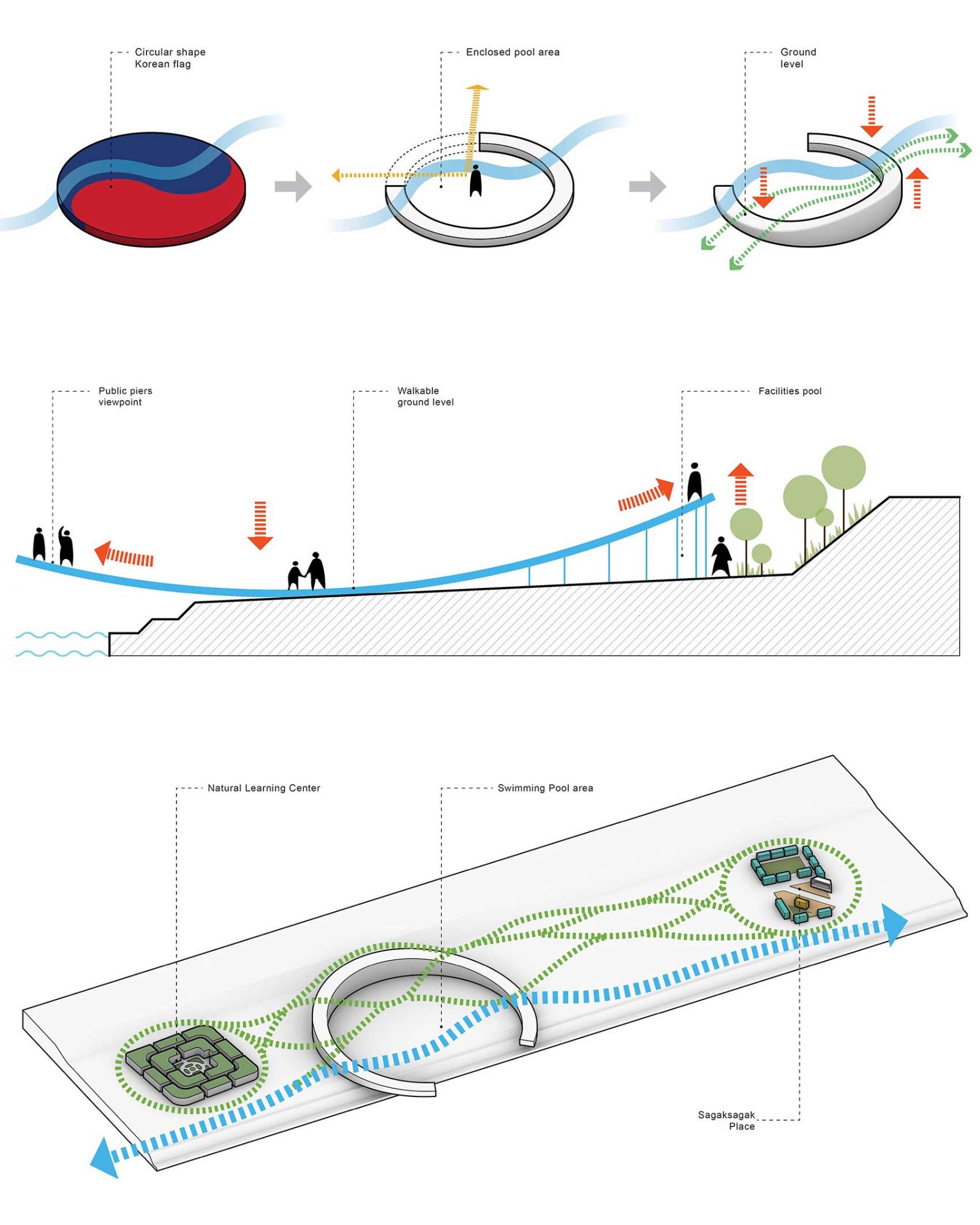 该提案将游泳池综合体与周围的文化设施结合到起来。因其西靠Sagak Sagak艺术区,东邻植物学习中心,该方案通过蜿蜒交织的步行道将这三个设施连接起来,使行人都能方便地通行所有设施之间,将整个河岸转化为一个突出的“自然驿站”。