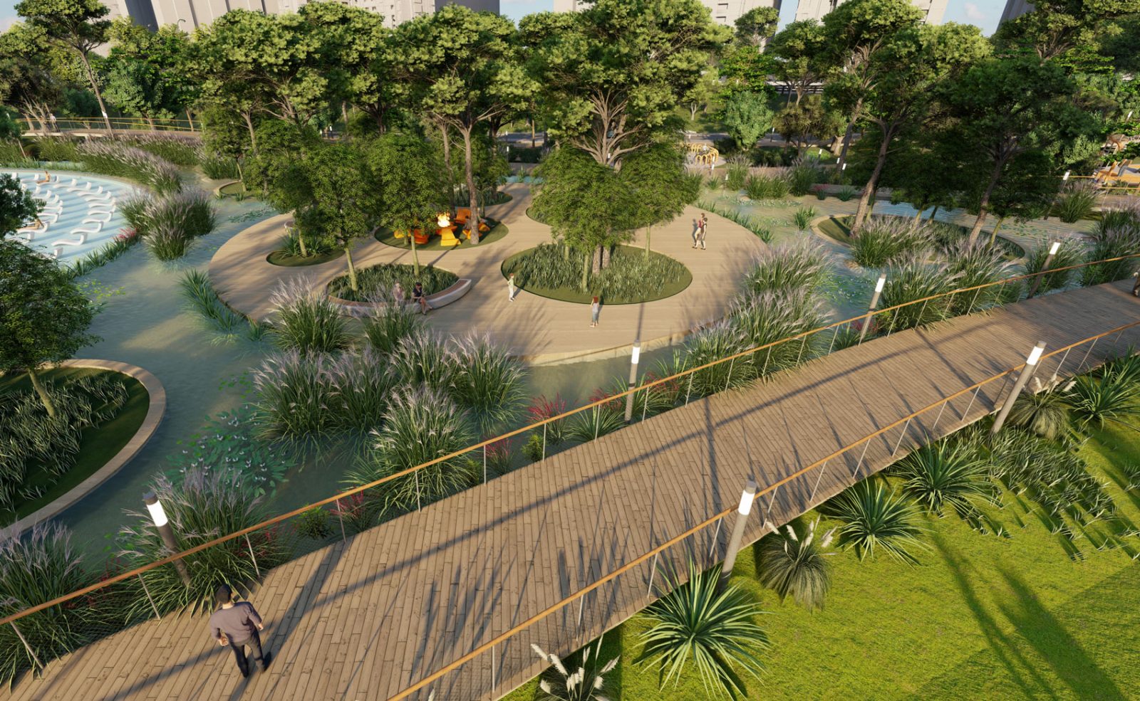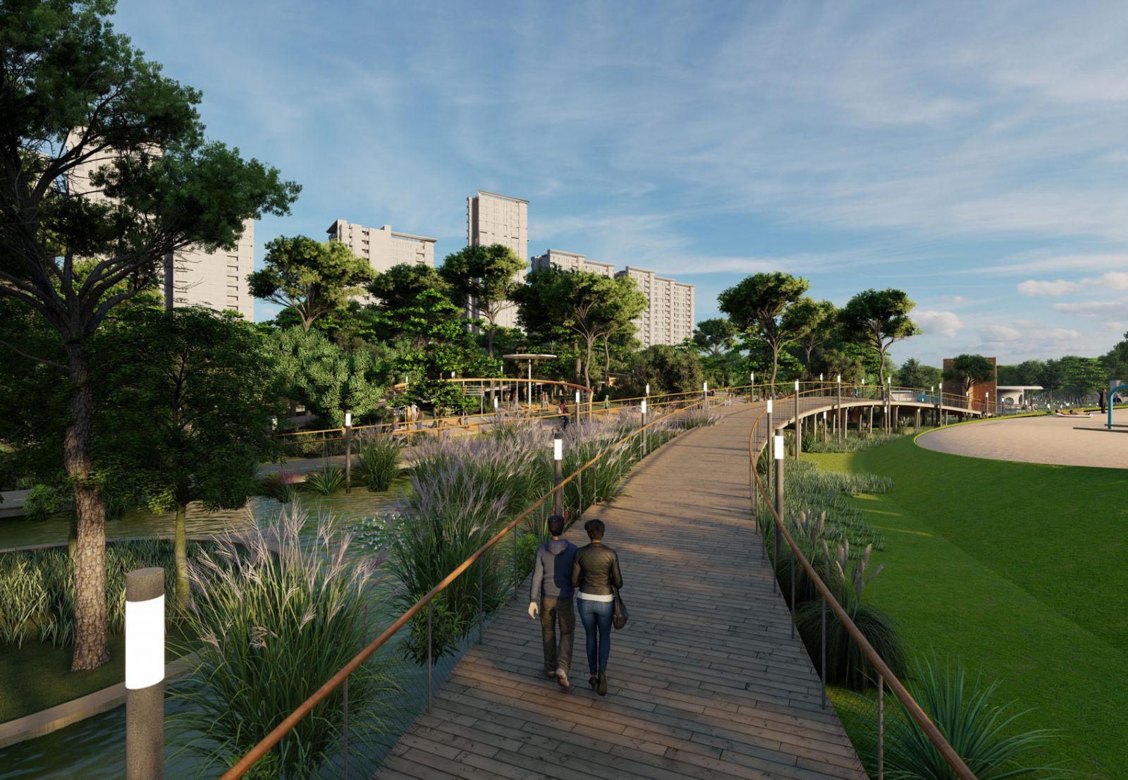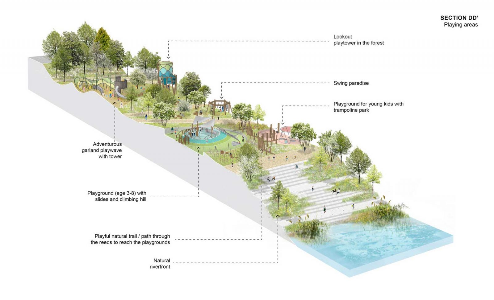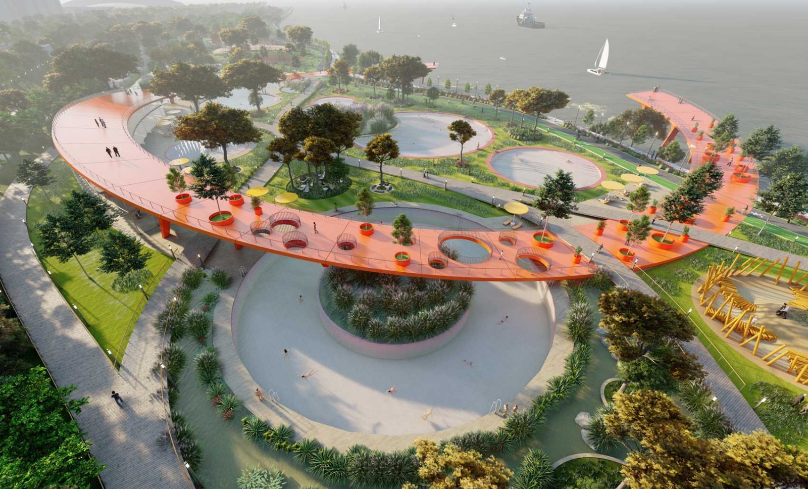 该提案将游泳池综合体与周围的文化设施结合到起来。因其西靠Sagak Sagak艺术区,东邻植物学习中心,该方案通过蜿蜒交织的步行道将这三个设施连接起来,使行人都能方便地通行所有设施之间,将整个河岸转化为一个突出的“自然驿站”。