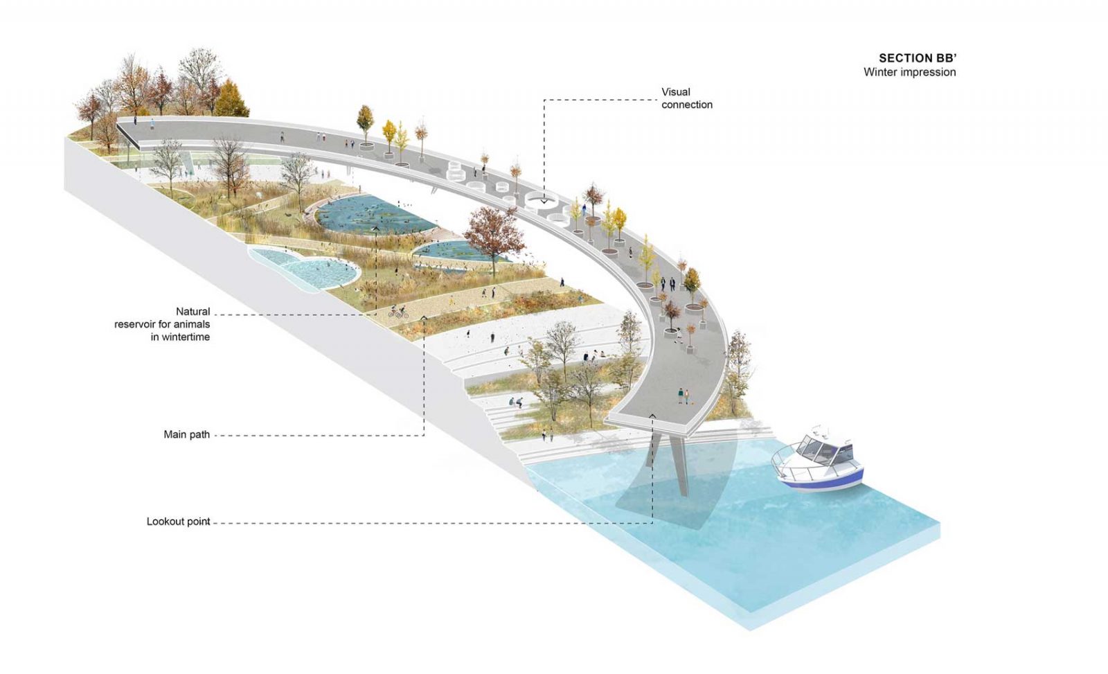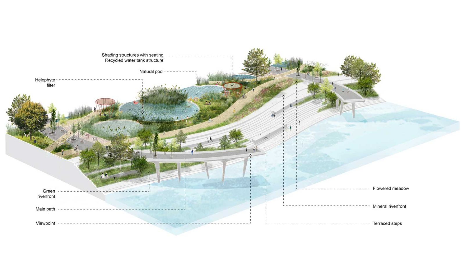 向上弯曲的道路上,高架的人行步道隔绝了游泳池旁的高架桥噪音,同时在环布道下容纳必要的室内设施。它在与滨河长廊的交叉处变平,以方便行人穿行;最后,道路伸出河岸部分形成了两个可步行的码头,可以俯瞰河流和恢复的河岸自然感。