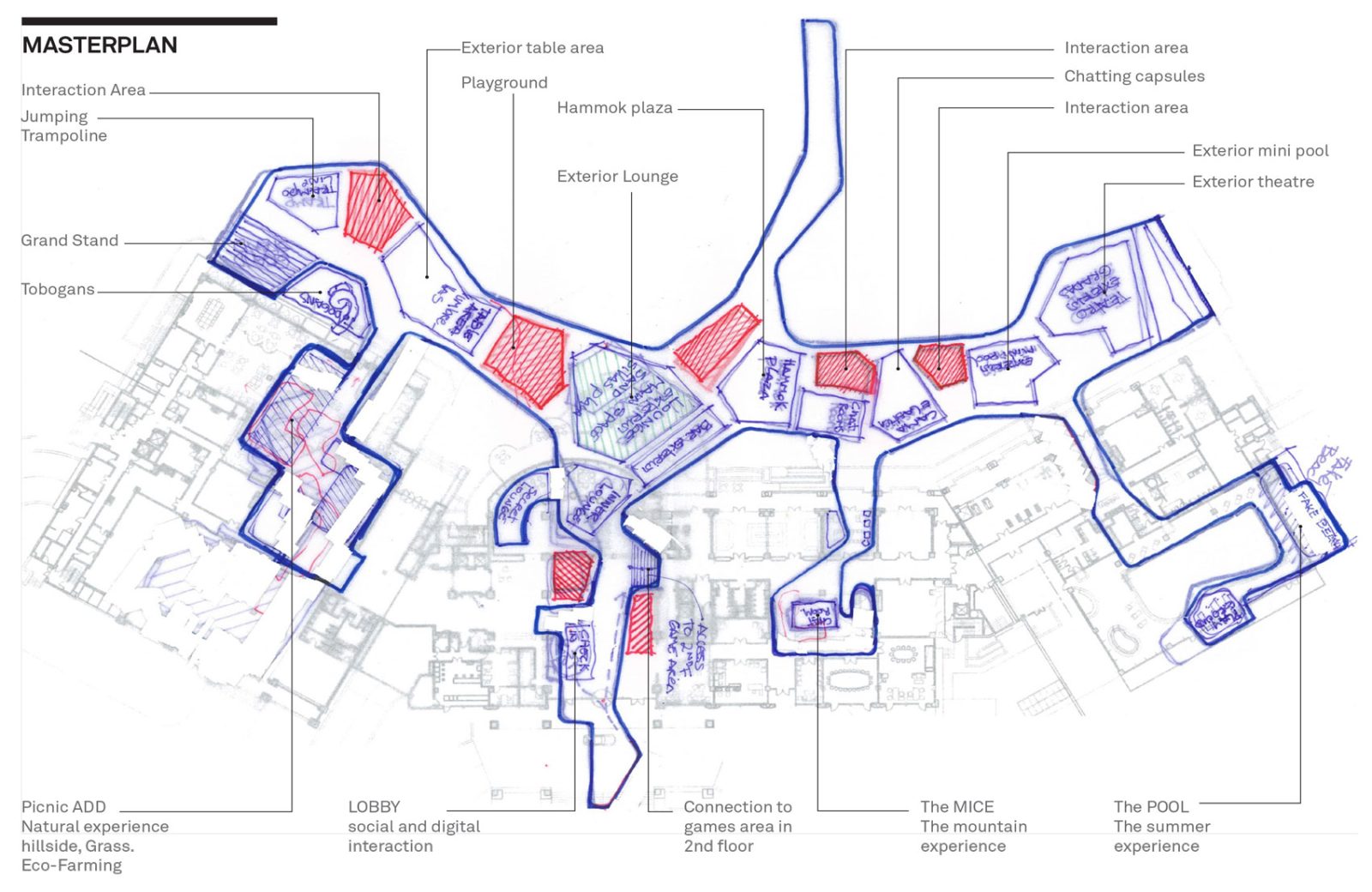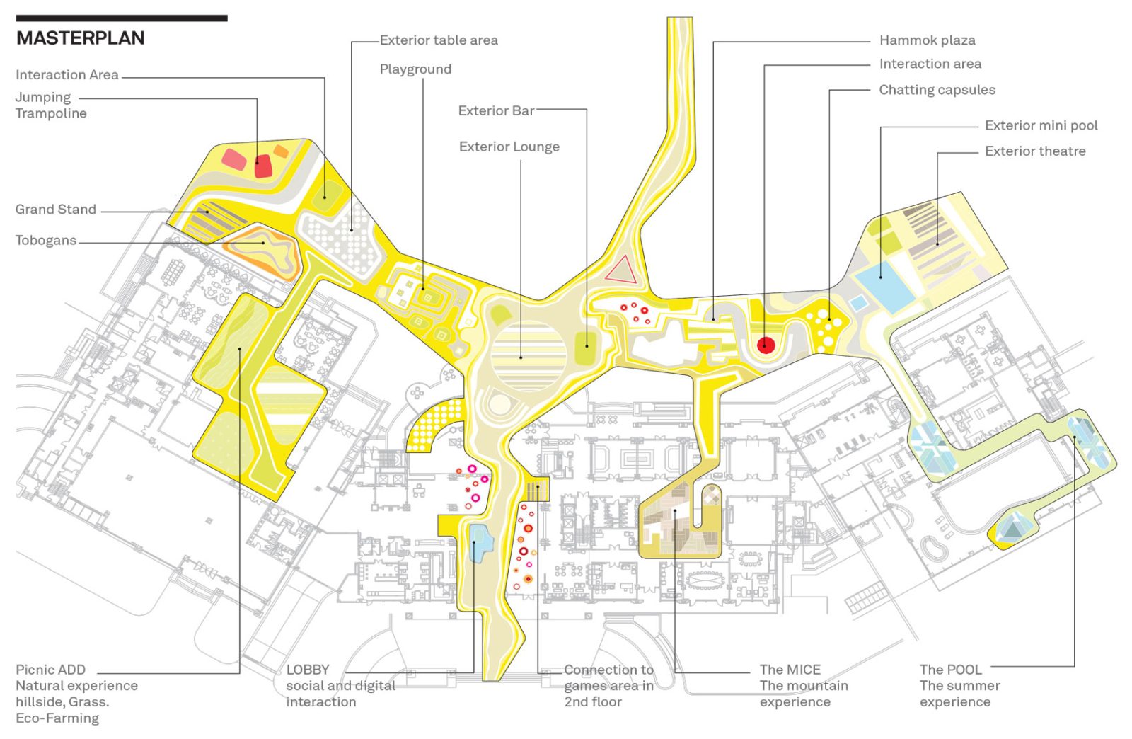 黄色衍生带则致力于成为酒店与高尔夫球场之间的完美桥梁,将这一壮观的吸引力推向新的高度。想象一下,一个巨大的、充满活力的黄色结构,与酒店的外观完美融合,创造出一种和谐而富有创意的联系。它犹如一个充满活力的度假天堂,为两个空间注入了新的活力与魅力。